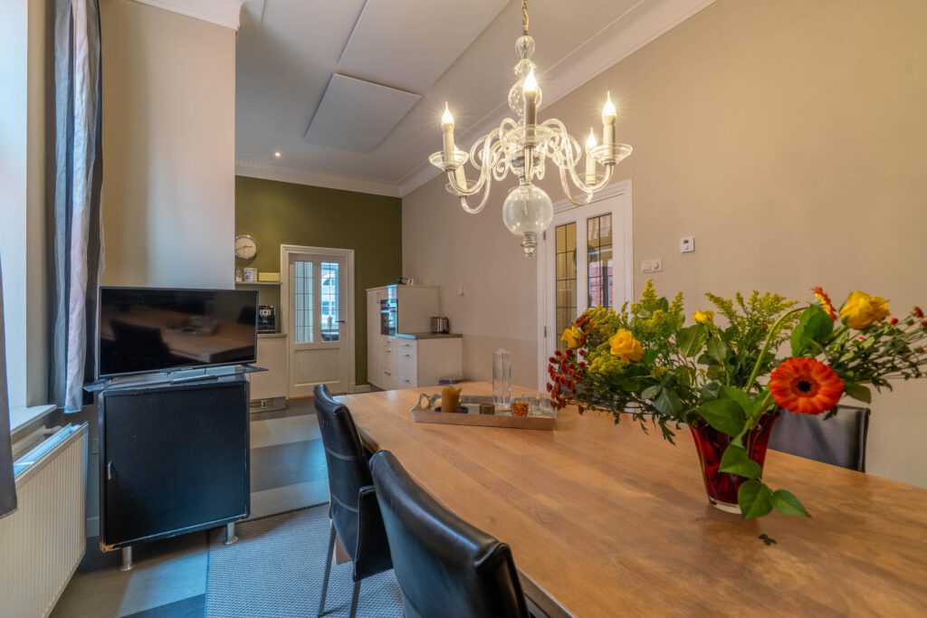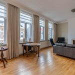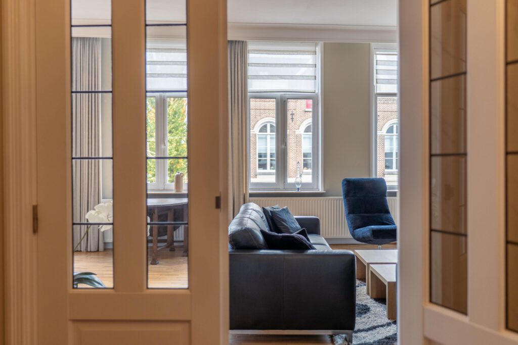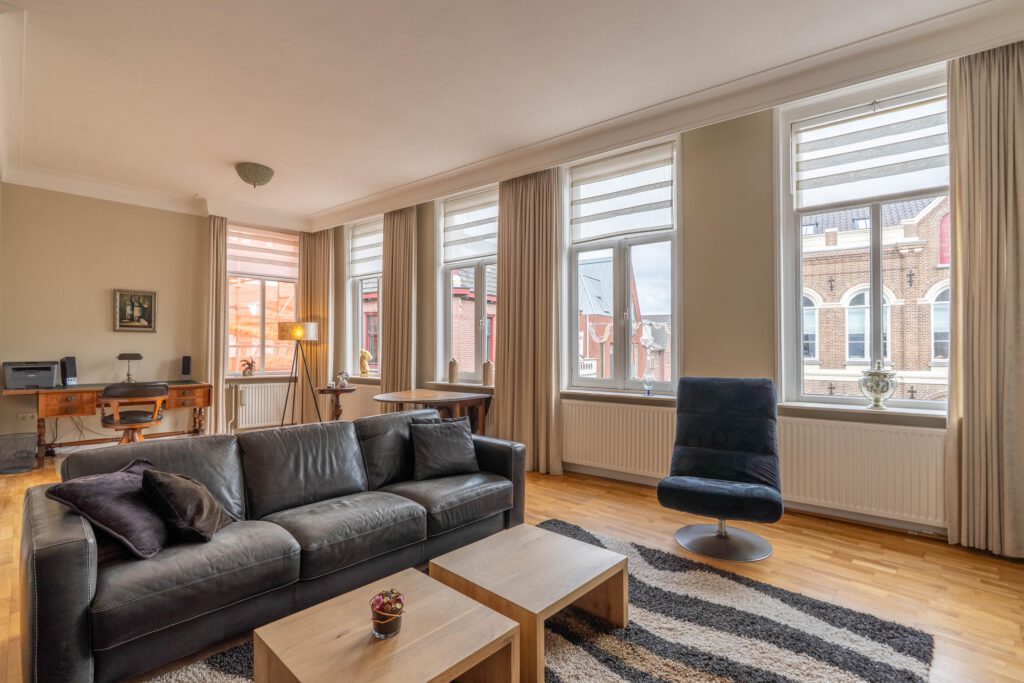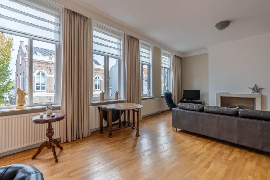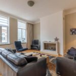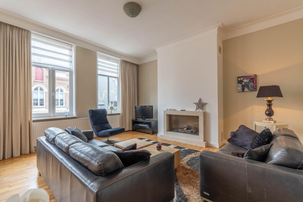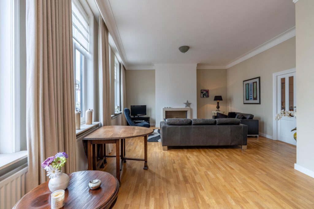 De woonkamer ligt aan de voorzijde van het pand en biedt een sfeervol uitzicht op de gezellige terrassen en winkels van het centrum. Dankzij de grote ramen is het hier heerlijk licht, en de gashaard zorgt voor extra warmte en sfeer op koude dagen.