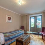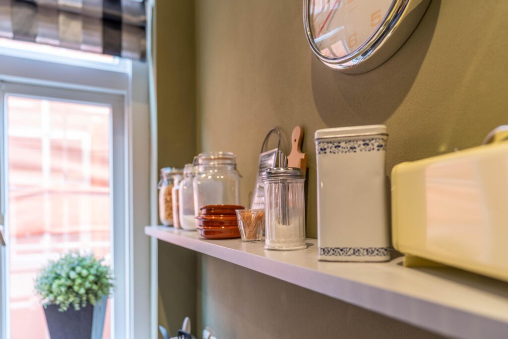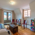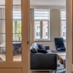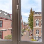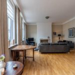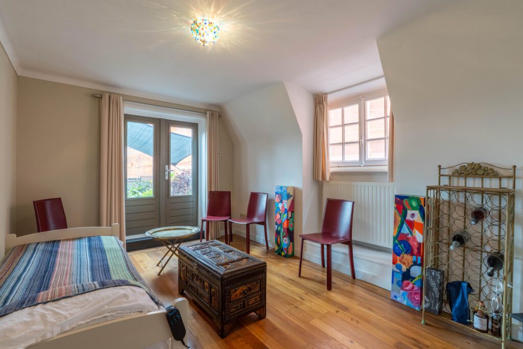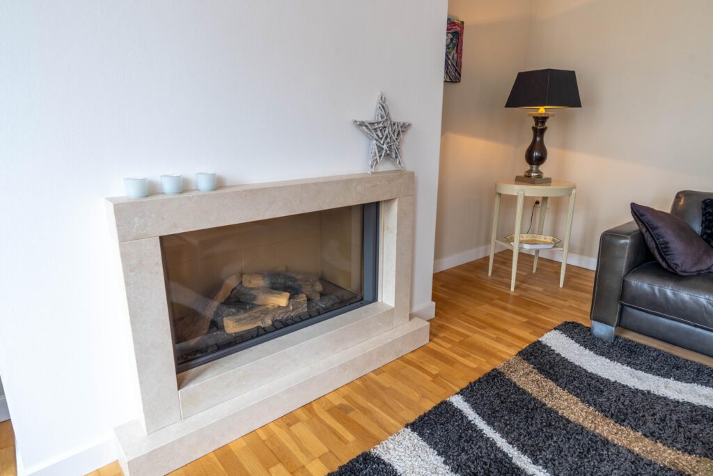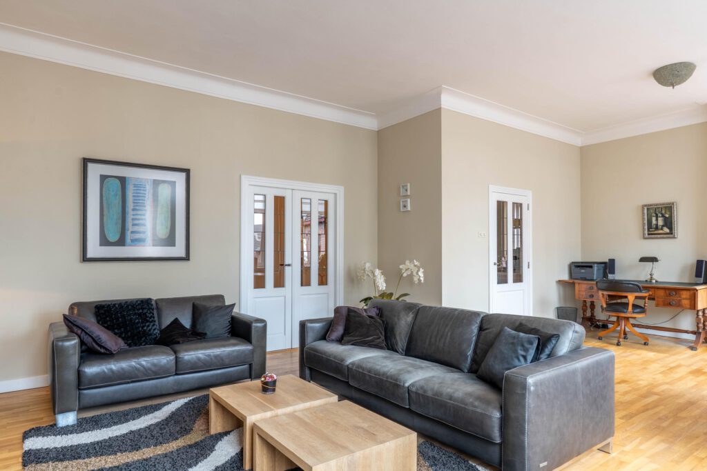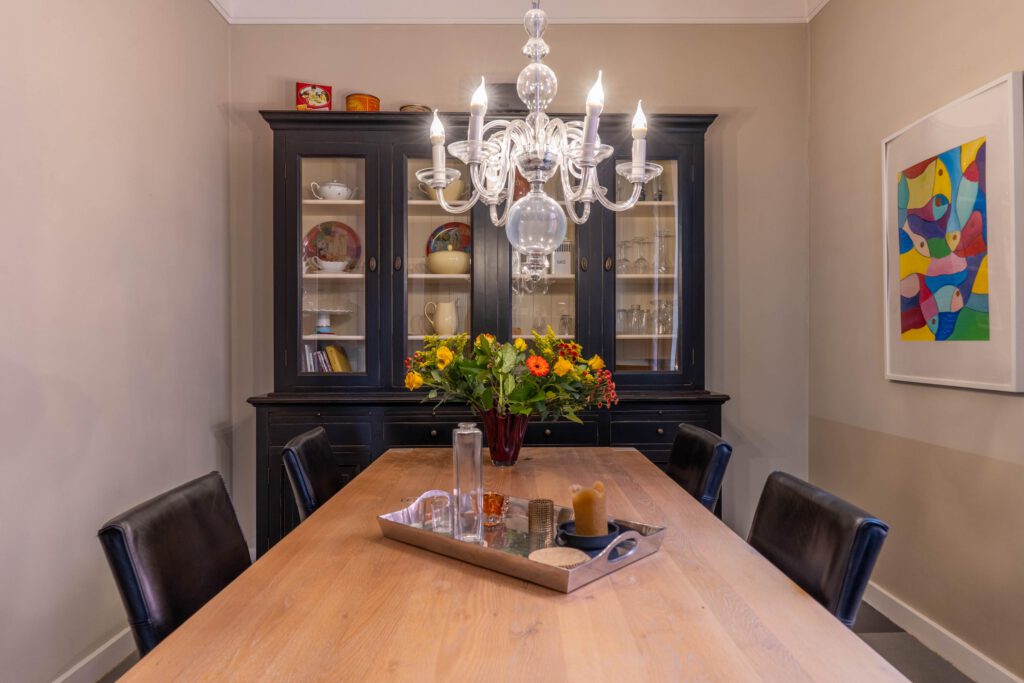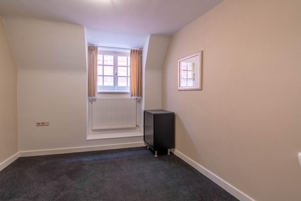 De woonkamer ligt aan de voorzijde van het pand en biedt een sfeervol uitzicht op de gezellige terrassen en winkels van het centrum. Dankzij de grote ramen is het hier heerlijk licht, en de gashaard zorgt voor extra warmte en sfeer op koude dagen.