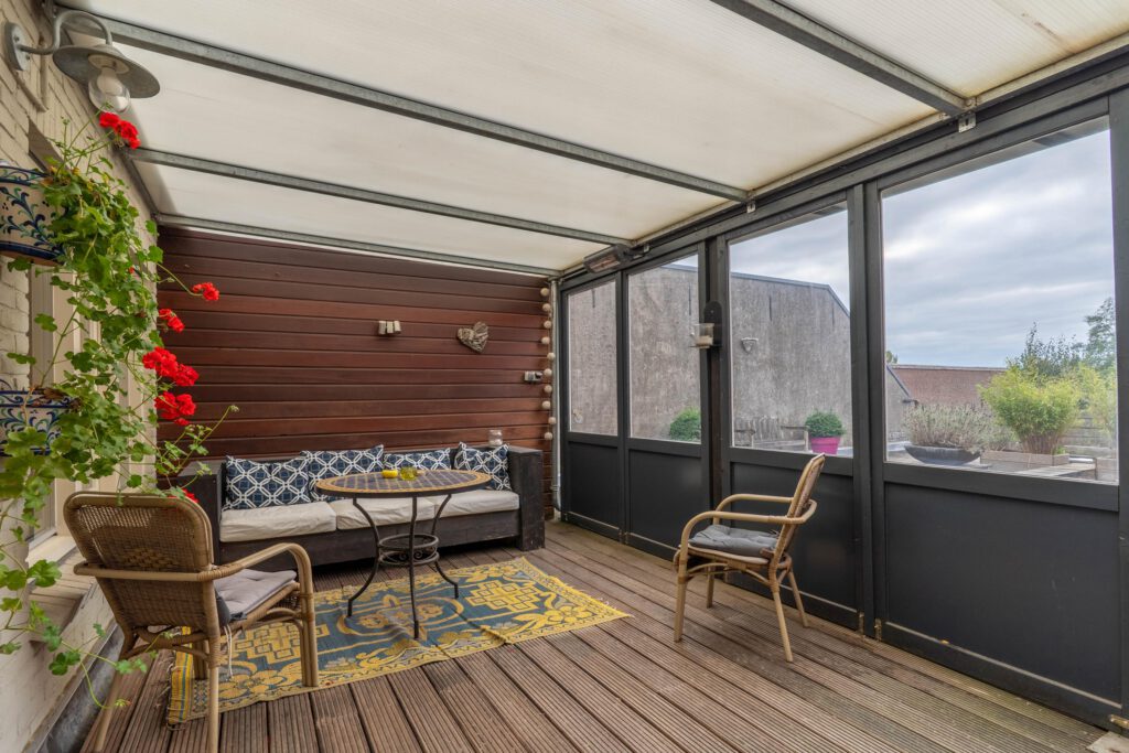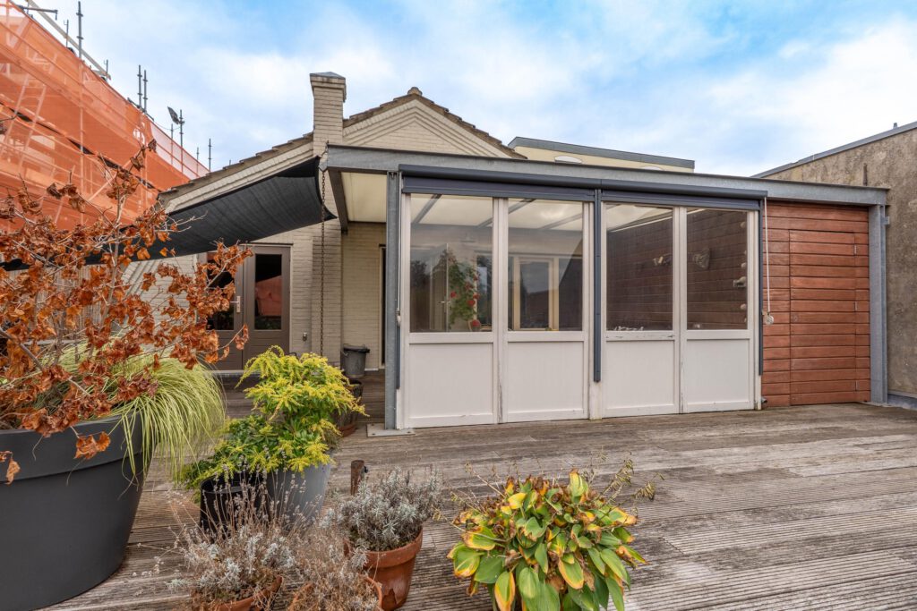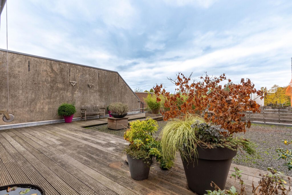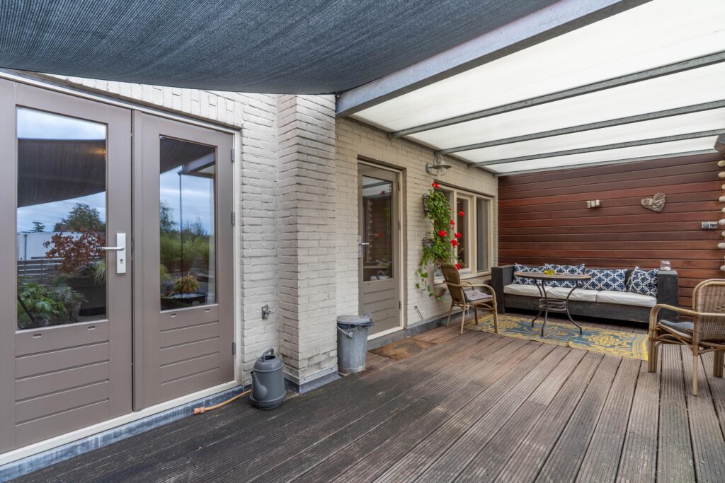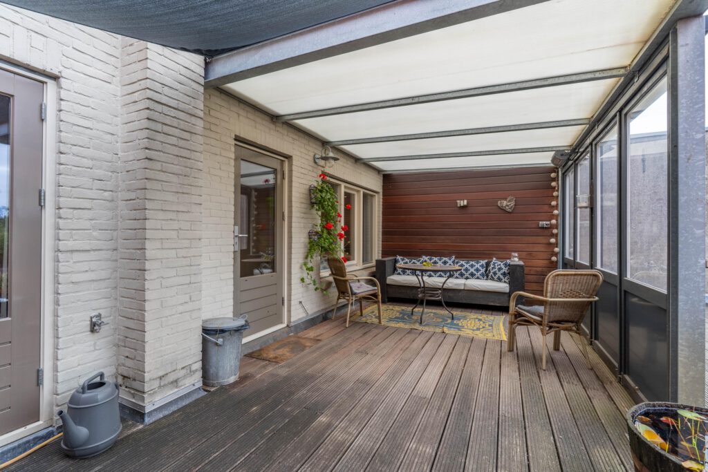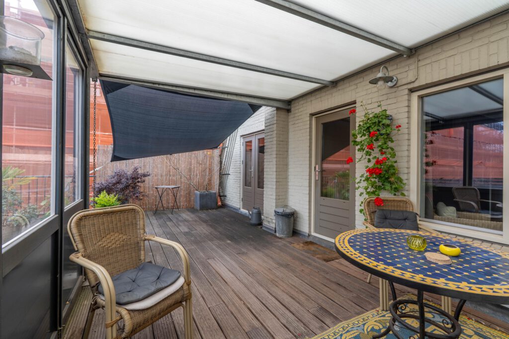 Aan het einde van de gang kom je uit op het royale dakterras. Hier geniet je in alle rust van de zon of juist van een plekje in de schaduw onder de overkapping. De glazen wand met ramen kan worden geopend en is voorzien van zonwering, waardoor je het terras het hele jaar door optimaal kunt gebruiken.