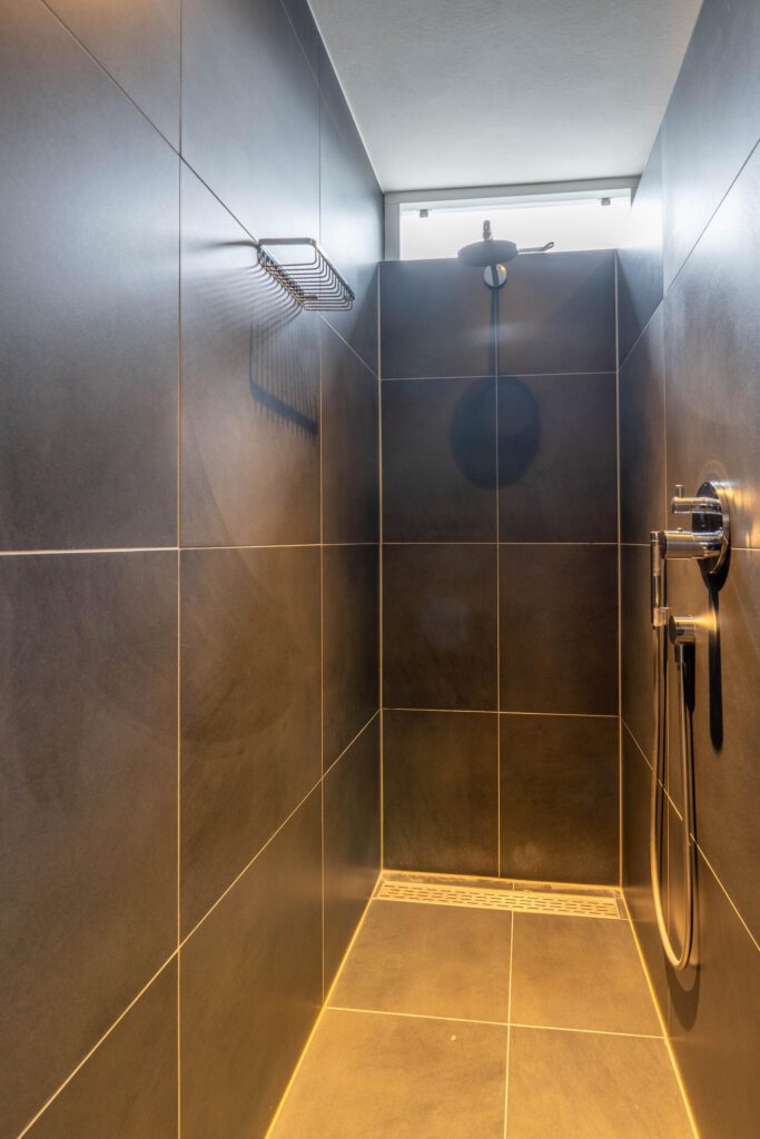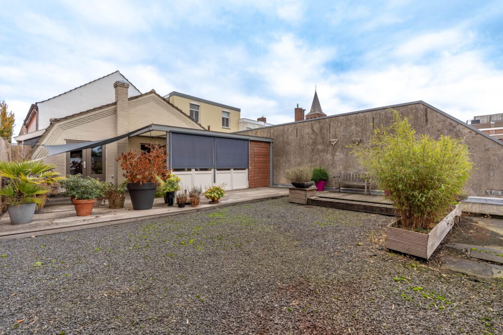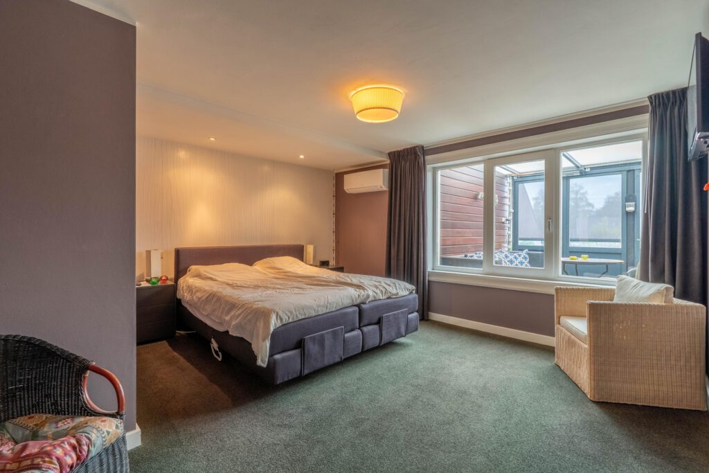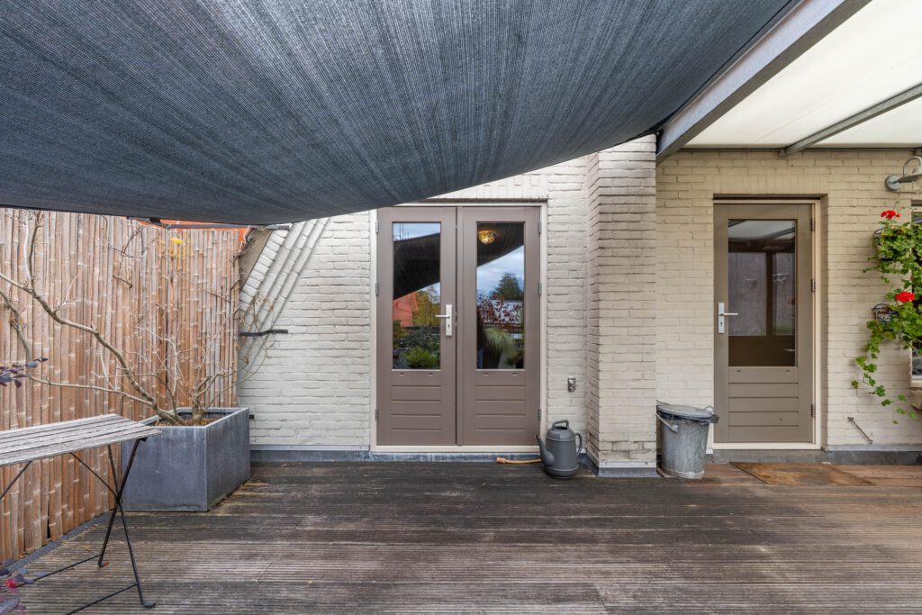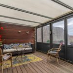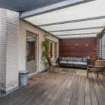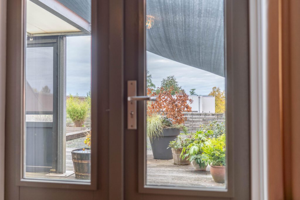Aan het einde van de gang kom je uit op het royale dakterras. Hier geniet je in alle rust van de zon of juist van een plekje in de schaduw onder de overkapping. De glazen wand met ramen kan worden geopend en is voorzien van zonwering, waardoor je het terras het hele jaar door optimaal kunt gebruiken.