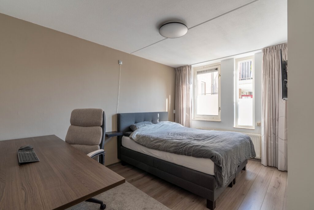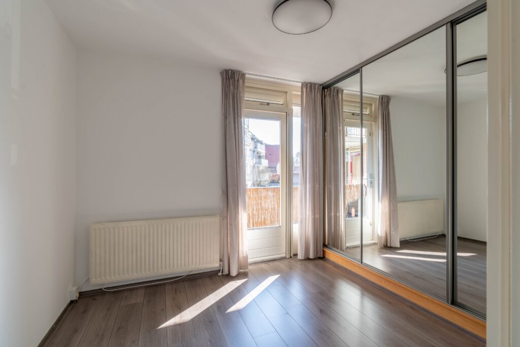 Aan de achterzijde liggen twee slaapkamers van respectievelijk circa 13 m² en 9 m². Vanuit de tweede slaapkamer heb je toegang tot een overdekt balkon van circa 4 m² met een hardhouten vlonder en uitzicht op de binnenplaats.