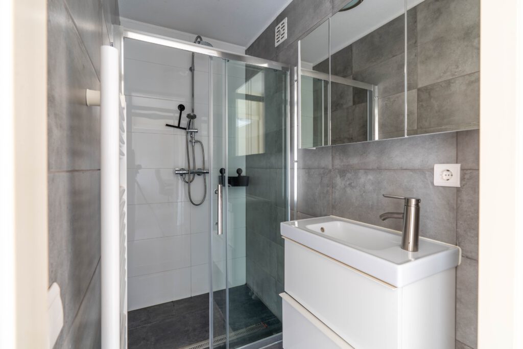 Via de gang zijn de toiletruimte en badkamer bereikbaar. Het toilet is voorzien van een staand closet meteen keurige afwerking. De nette badkamer beschikt over een douchecabine, een wastafel en een design radiator.