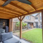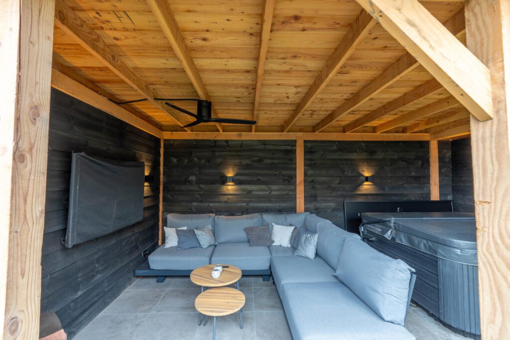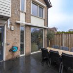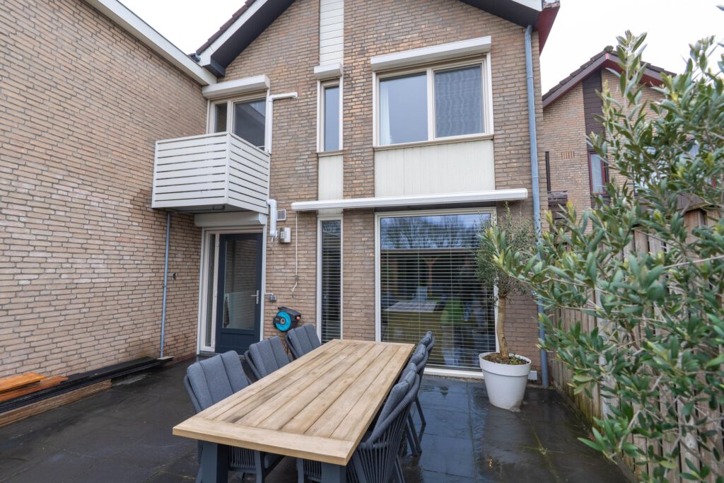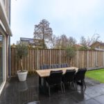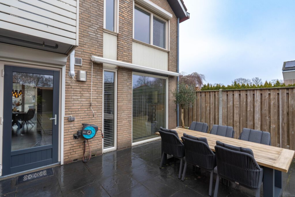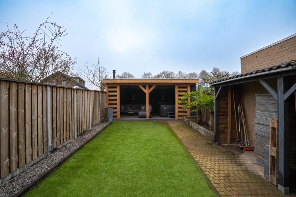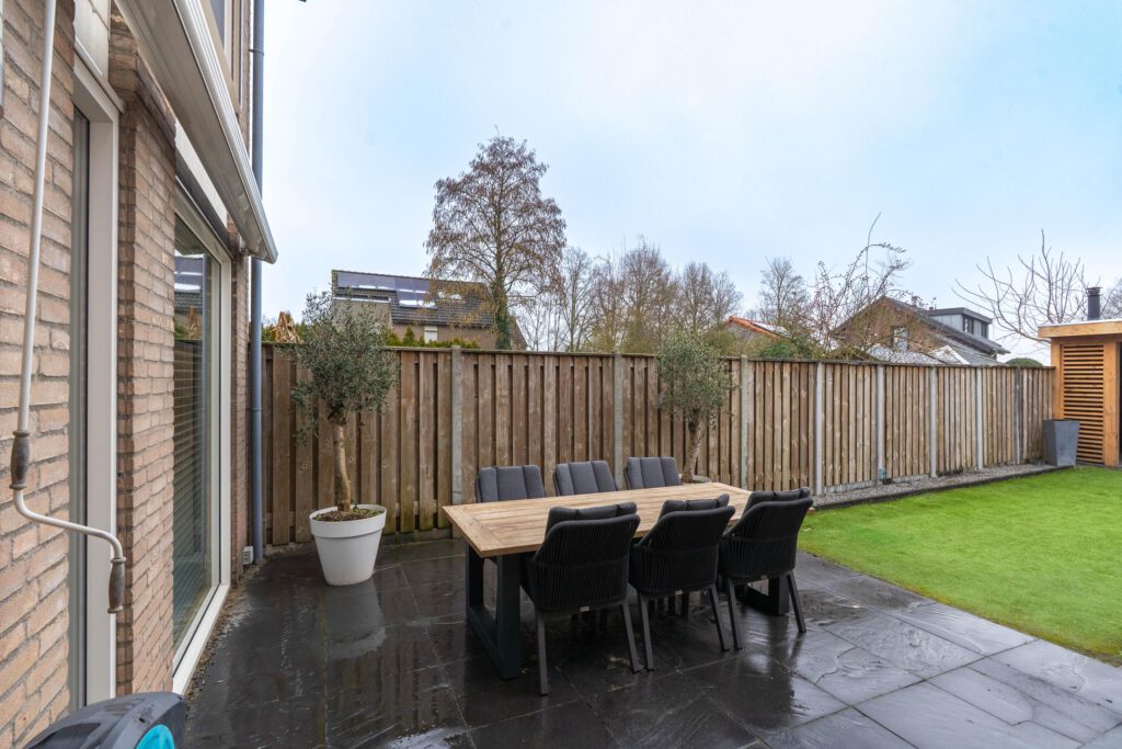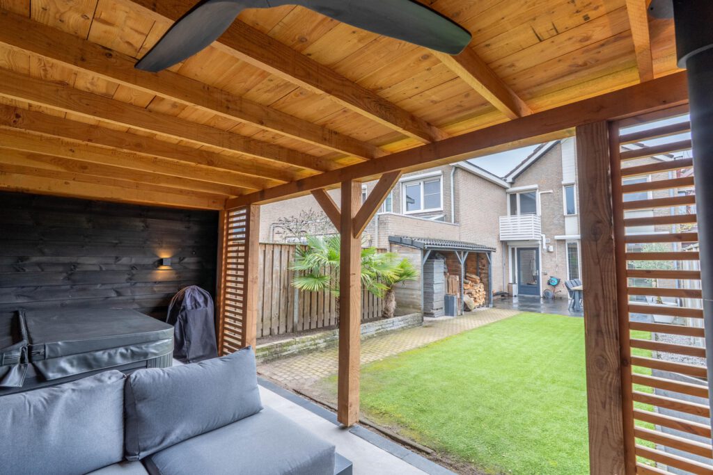 De onderhoudsvriendelijke achtertuin is gelegen op het zonnige zuiden, waardoor je hier vrijwel de hele dag van de zon kunt genieten. Direct achter de woning ligt een terras waar je heerlijk kunt zitten. Achterin de tuin staat een houten overkapping, ideaal om ook bij minder weer comfortabel buiten te verblijven. Door de opstelling van de omliggende woningen is er weinig inkijk van buren, wat zorgt voor veel privacy.