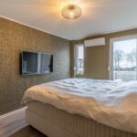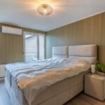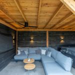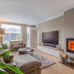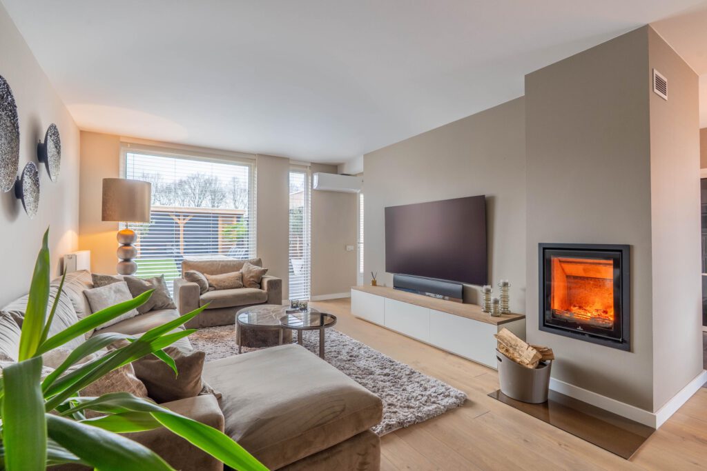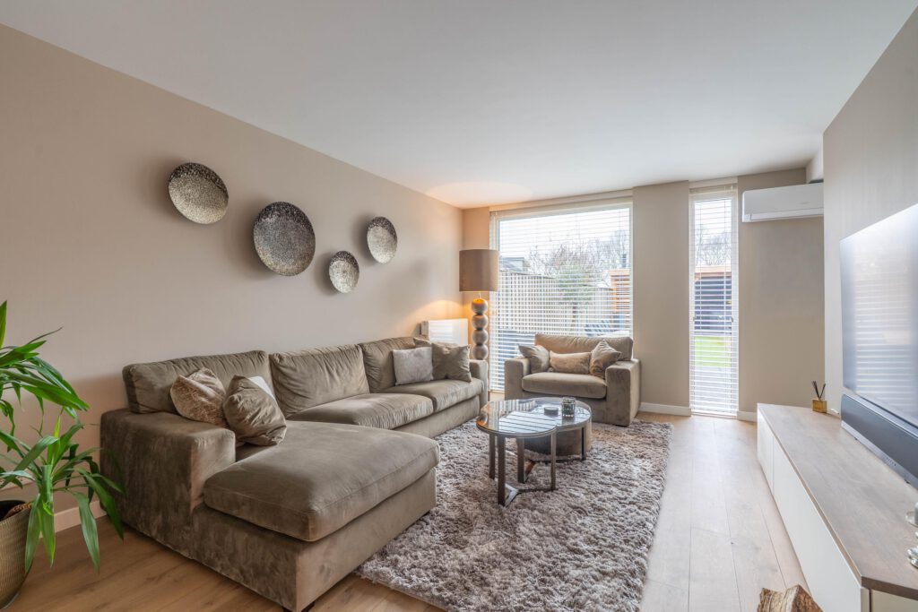De woonkamer is sfeervol en modern afgewerkt en beschikt over een houten vloer die voor een warme uitstraling zorgt. Extra comfort is er dankzij de houtkachel voor de koudere dagen en een airco-unit voor verkoeling in de zomer. Vanuit de zithoek heb je via een dubbele raampartij mooi zicht op de tuin.