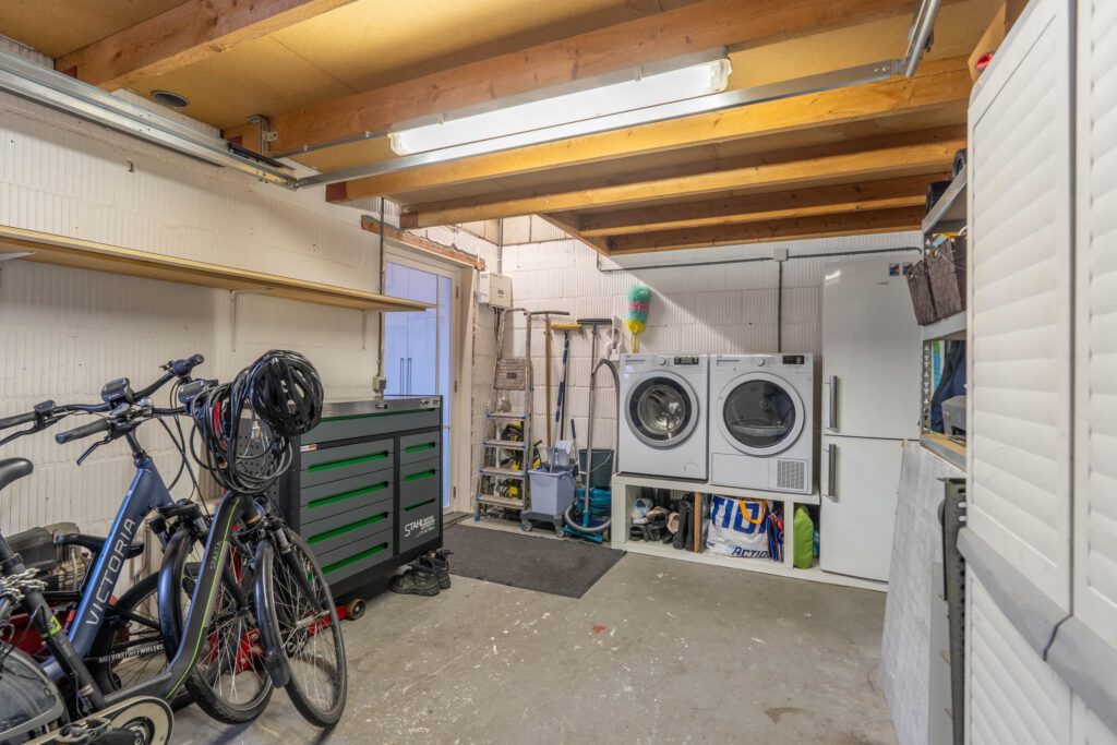 De woning beschikt over een praktische garage die zowel via de ruime oprit als vanuit de woning bereikbaar is. In de garage bevinden zich de witgoedaansluitingen en een kleine vliering, ideaal voor extra opslagruimte.