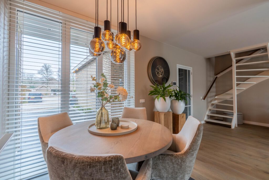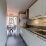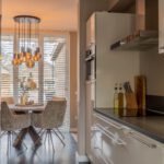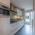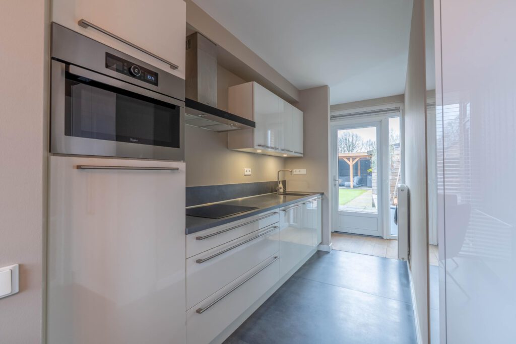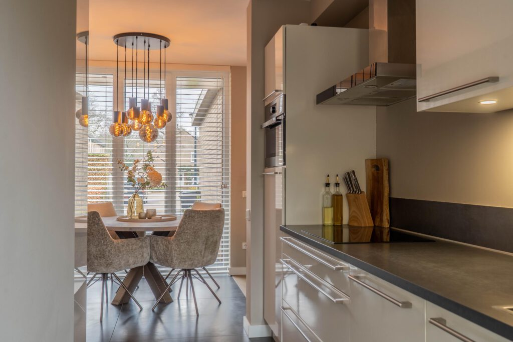 Achter de scheidingswand bevindt zich de keuken: een moderne witte keuken met voldoende kastruimte en voorzien van een oven, inductiekookplaat en vaatwasser. Aan de voorzijde van de woning is ruimte voor de eettafel, met uitzicht op de straat.