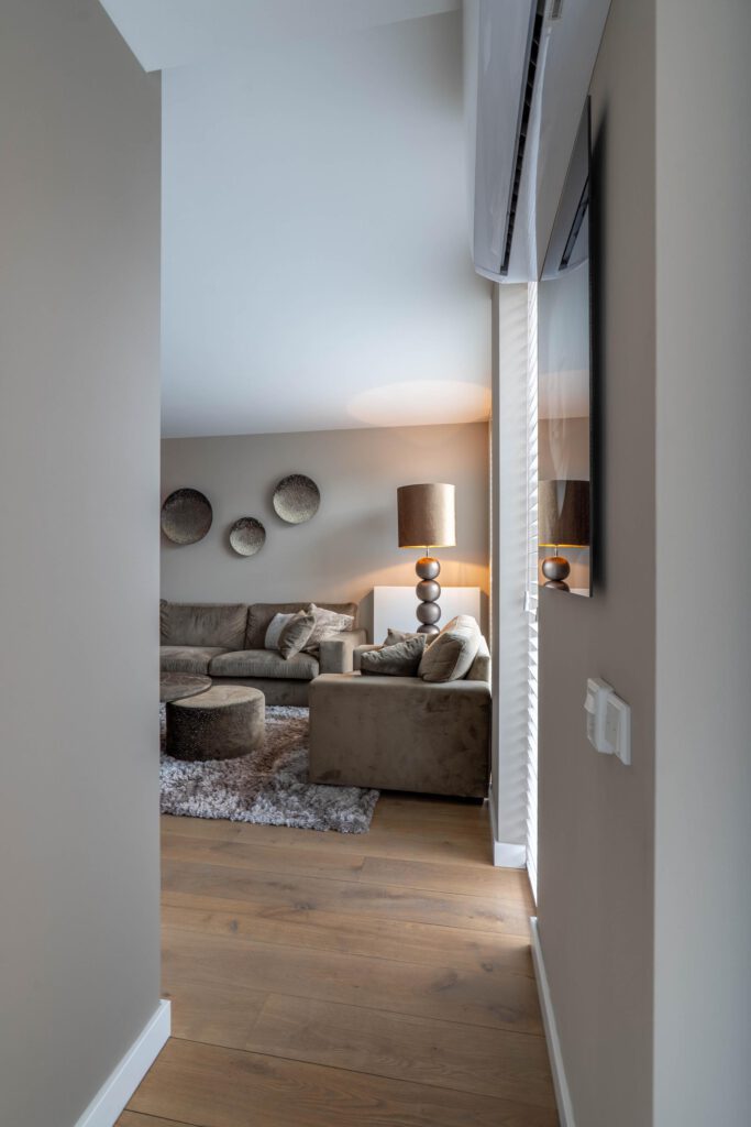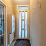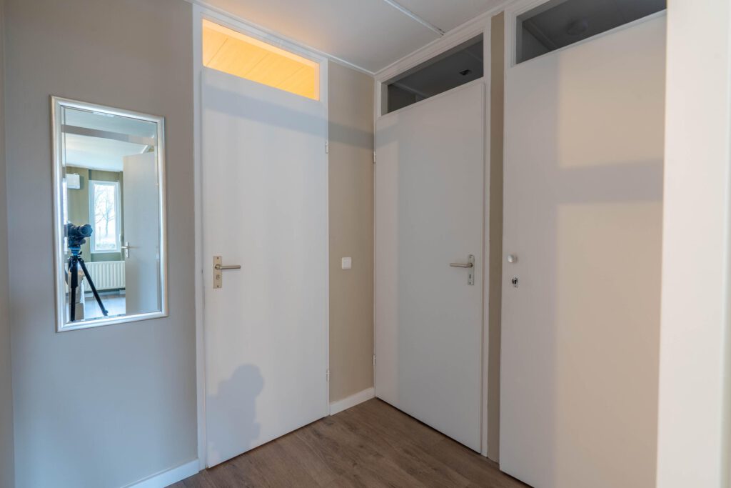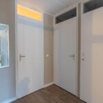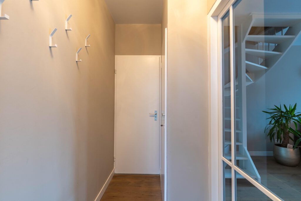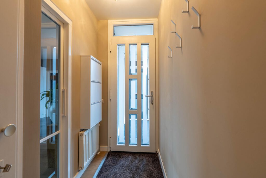 Via de voordeur kom je in de entree met toegang tot de meterkast, het toilet en de woonkamer. De woonkamer bereik je via een moderne witte stalen deur met glas, die direct zorgt voor een eigentijdse uitstraling.