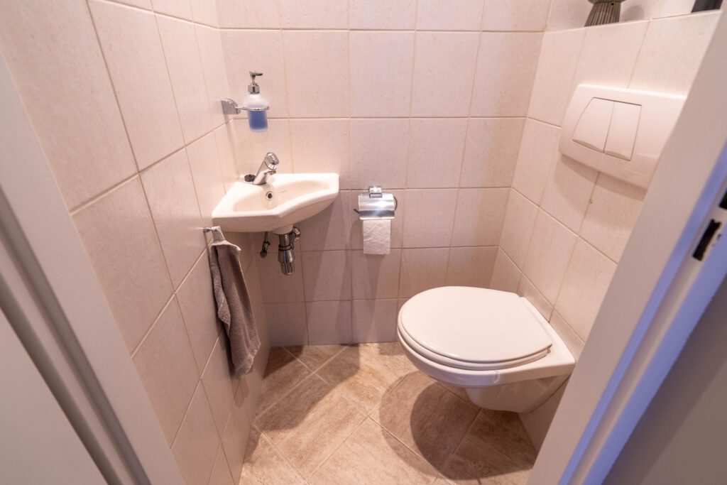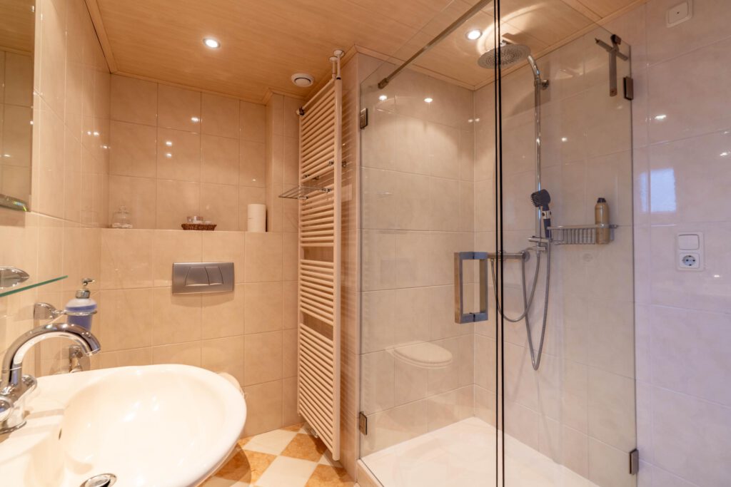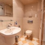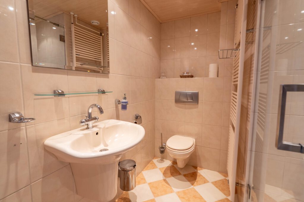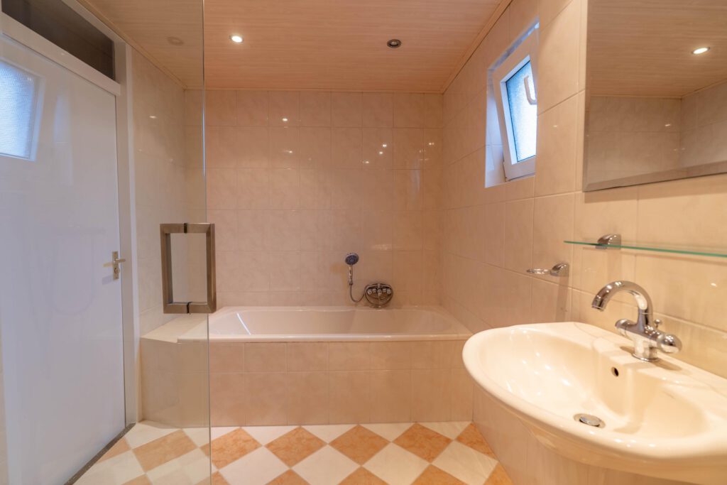 De badkamer is ruim opgezet en compleet uitgerust met een ligbad, douche, toilet en wastafel.
