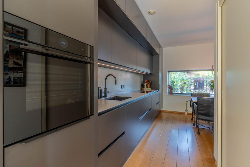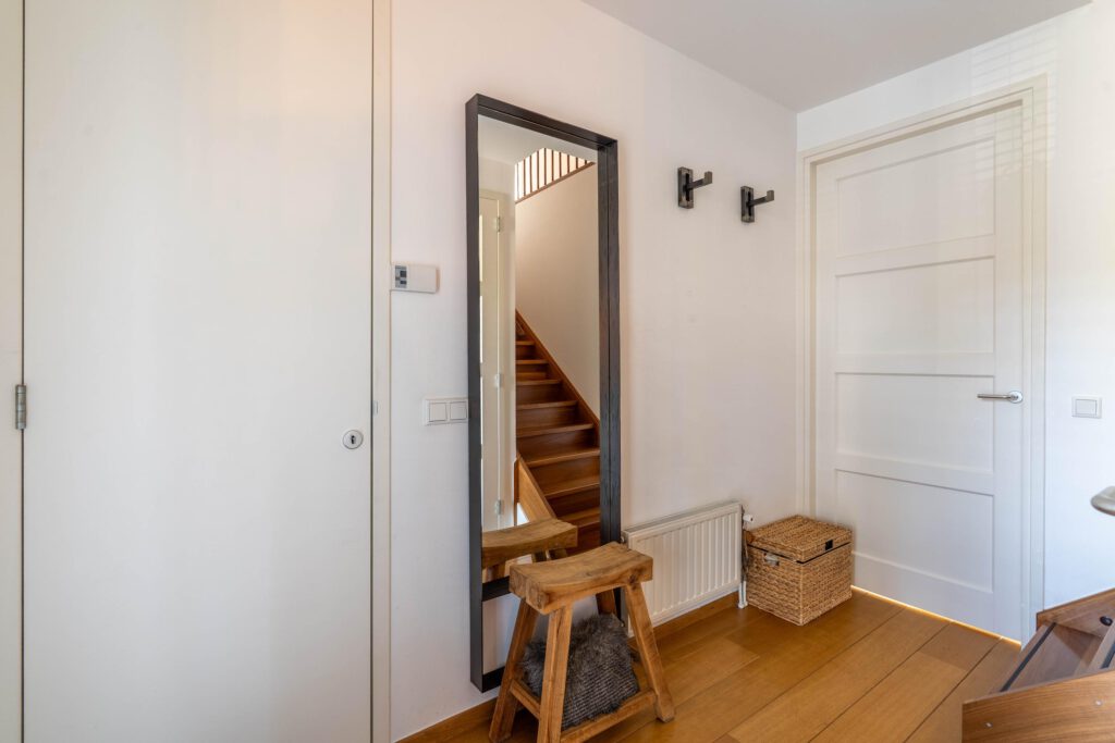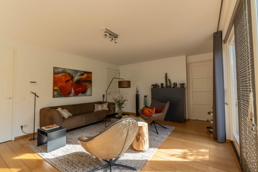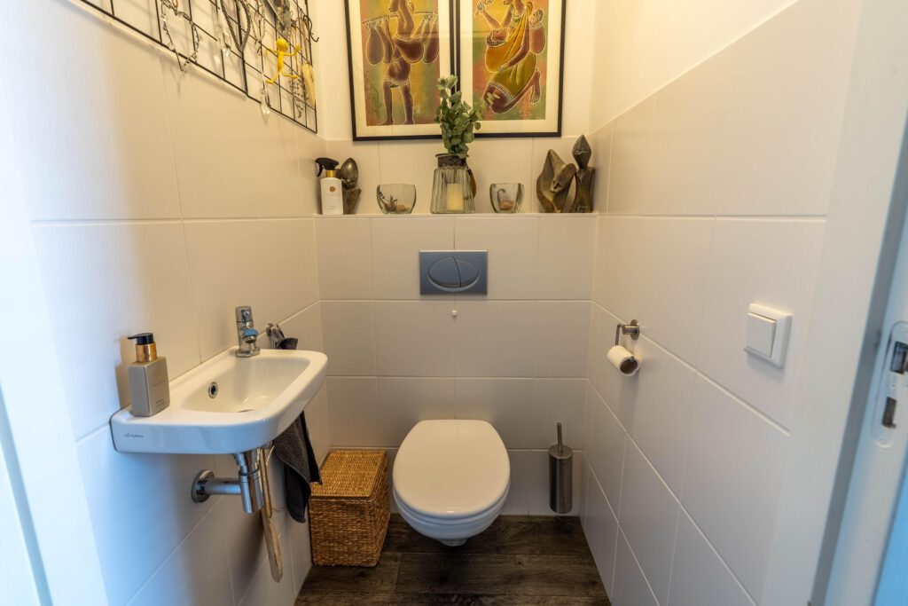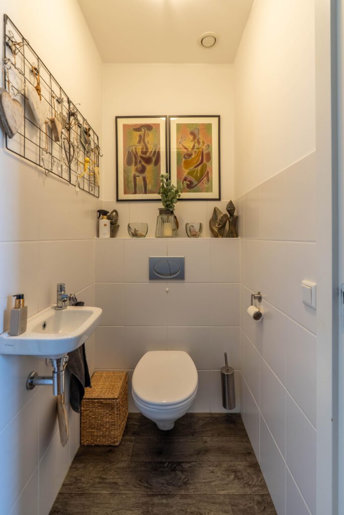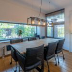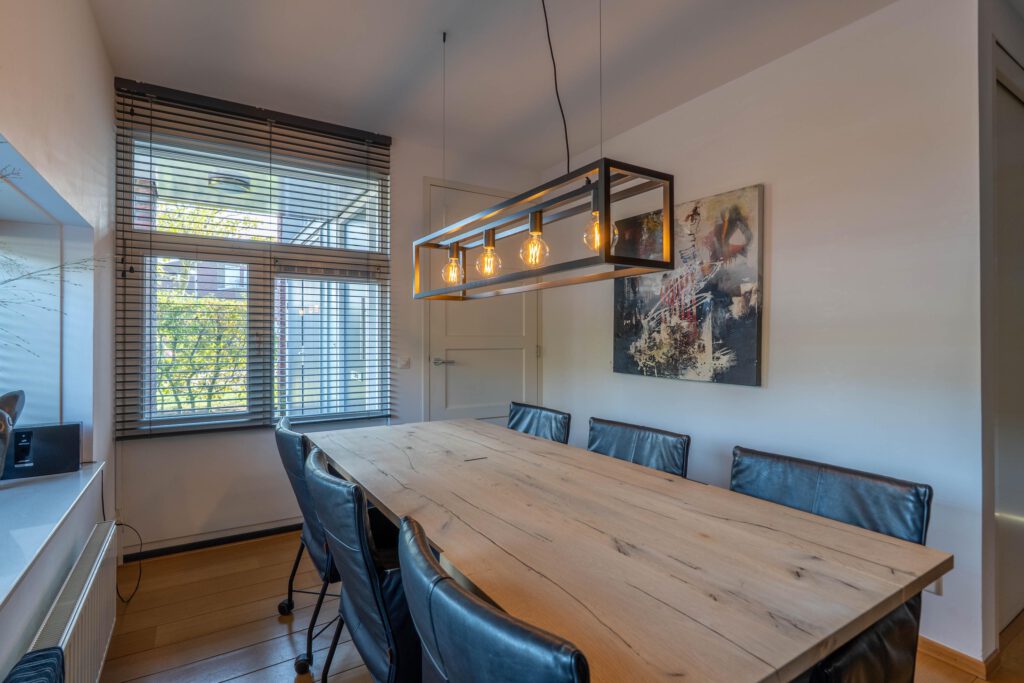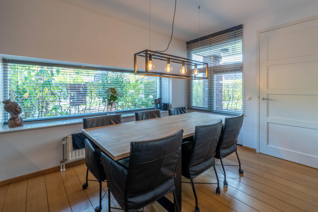 Bij binnenkomst voel je direct de warme en gezellige sfeer van de woning. De hal met houten vloer geeft via de rechterdeur toegang tot een modern toilet en via de andere deur tot de keuken. Deze moderne keuken is een echte eyecatcher: strak afgewerkt, volledig uitgerust met onder andere een koelkast, vriezer, inductiekookplaat met afzuiging, een Quooker en combi-oven, De eetkamer biedt volop ruimte voor een grote eettafel en een knusse zithoek, perfect voor lange avonden tafelen.