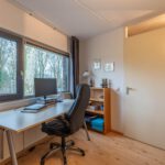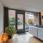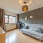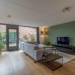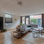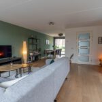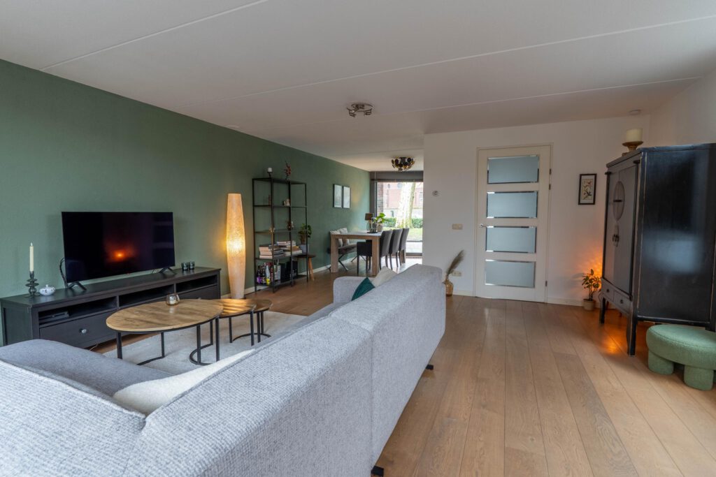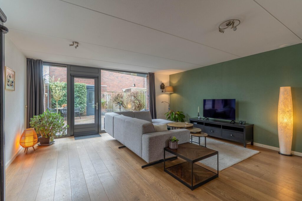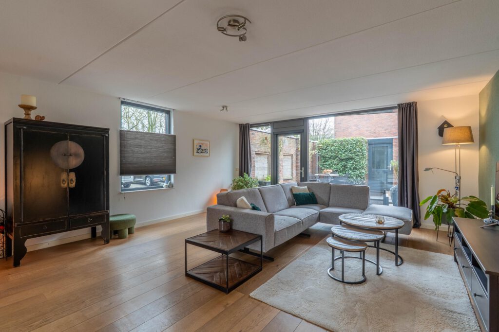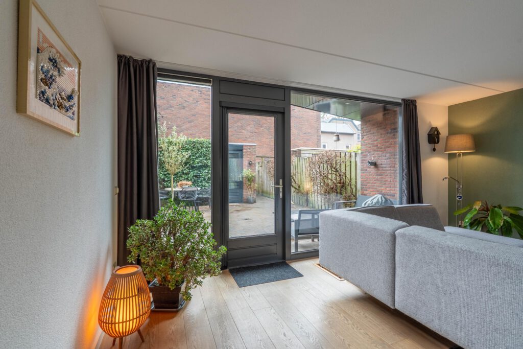 Aan de achterzijde ligt de woonkamer. Dankzij de grote raampartijen en de tuindeur met glas komt hier veel daglicht binnen en is er een fijne verbinding met de tuin.