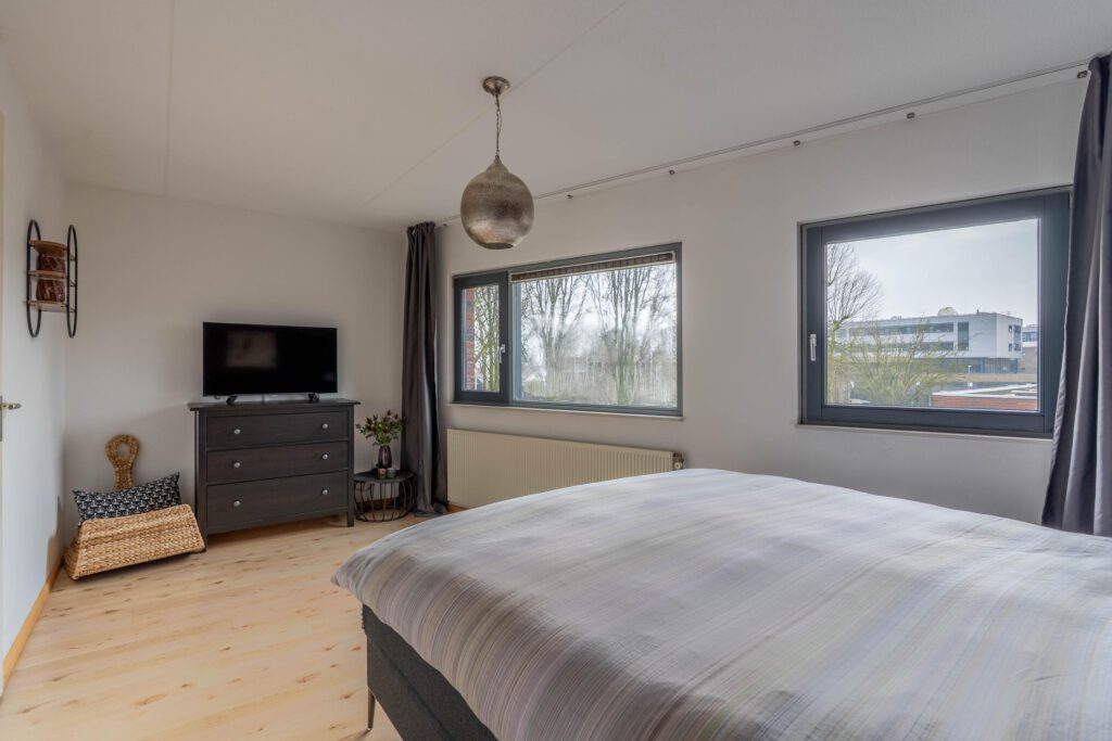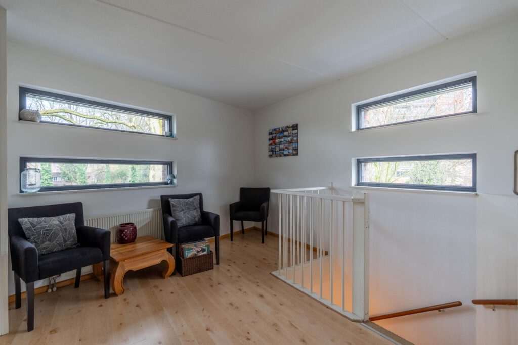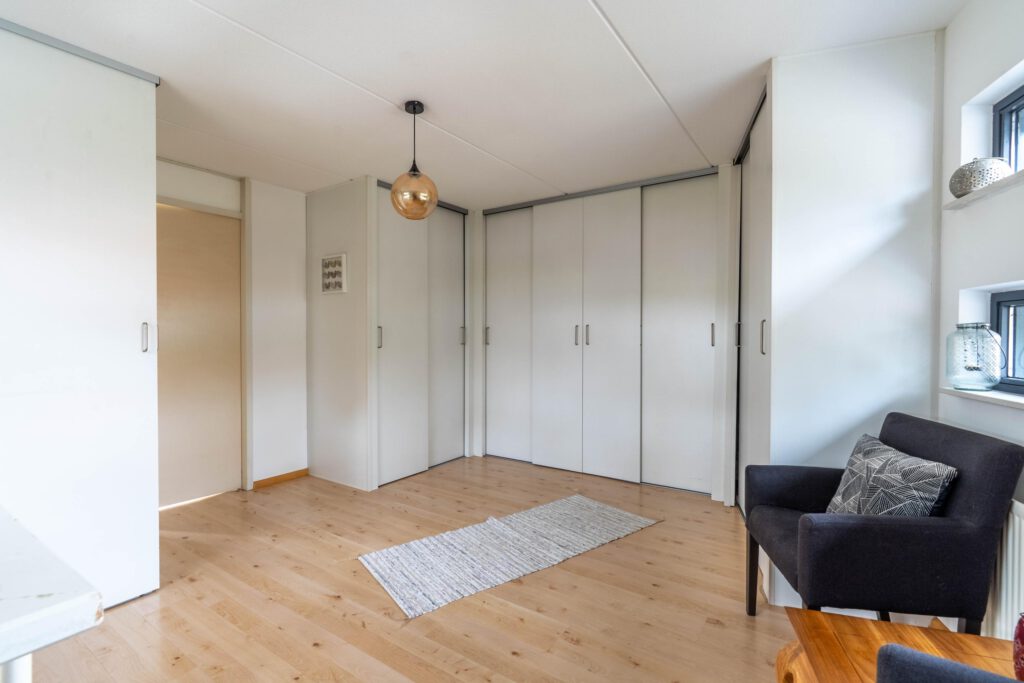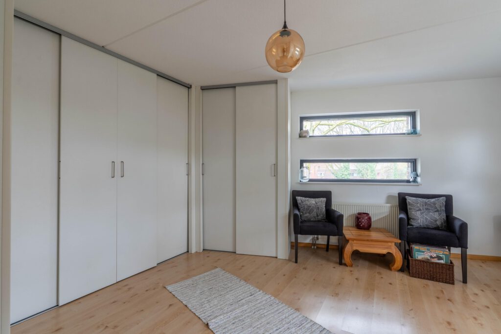 Via een vaste trap bereik je de tweede verdieping. Hier vind je een open ruimte met ingebouwde kasten die samen een royale inloopkast vormen. Daarnaast is hier een derde ruime slaapkamer met veel daglicht, ideaal als hoofdslaapkamer, werkkamer of logeerkamer.