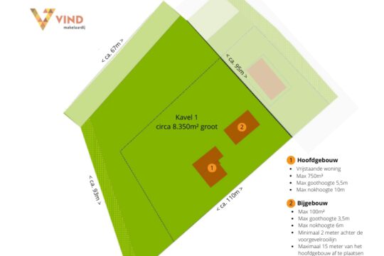Op dit kavel heb je de mogelijkheid om een vrijstaande woning te bouwen van 750m³ én een bijgebouw van 200m². Deze opstallen staan vervolgens op een prachtig groot kavel. Aan de voorzijde is dit kavel maar liefst (ca.) 110 meter breed.