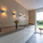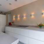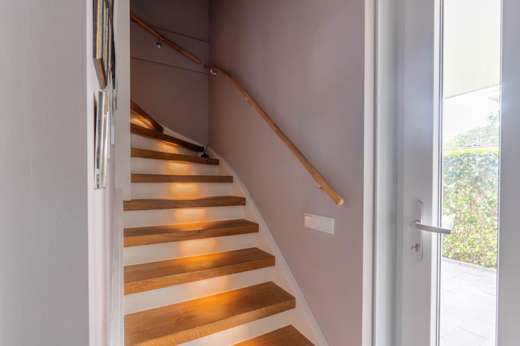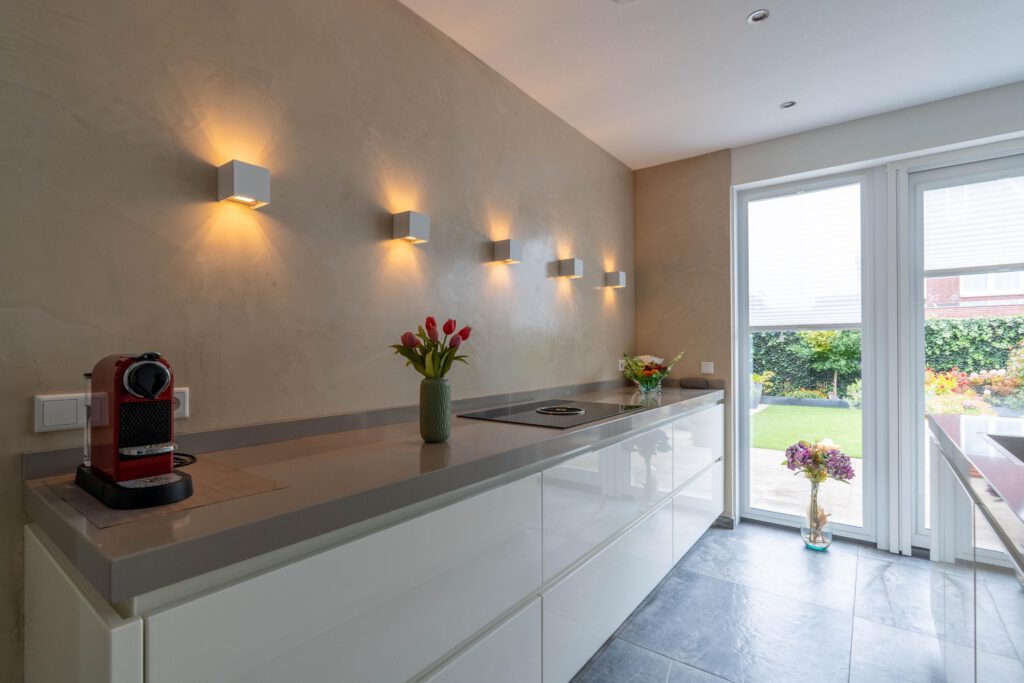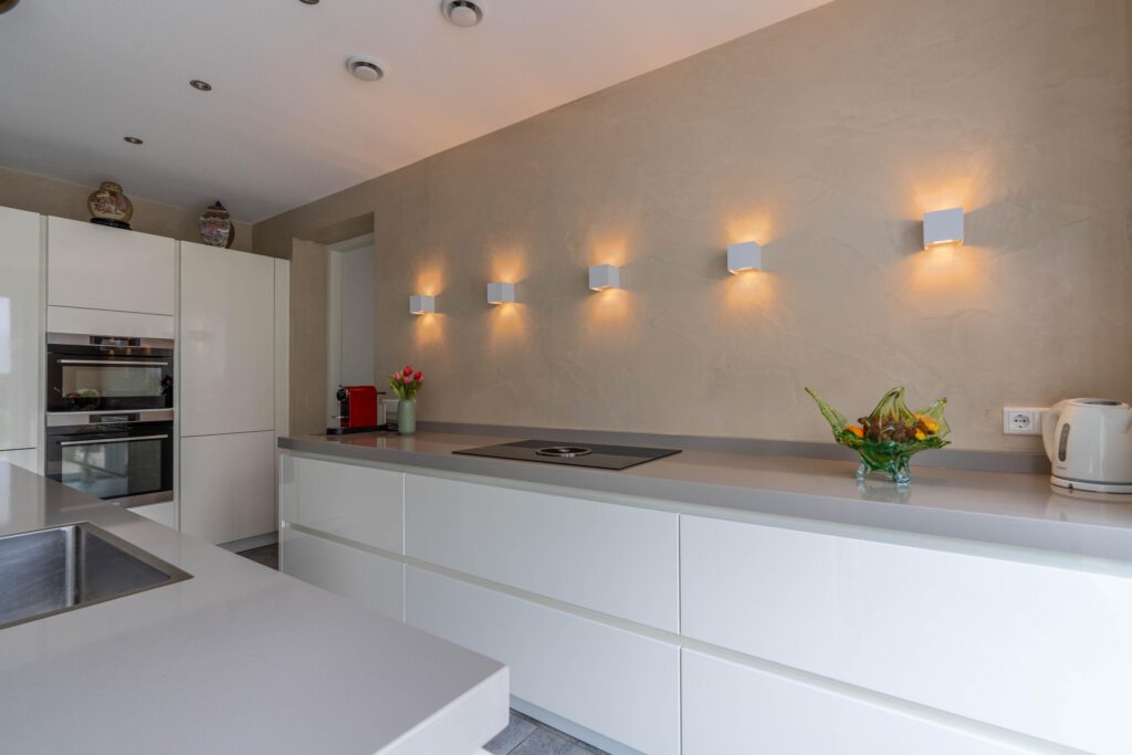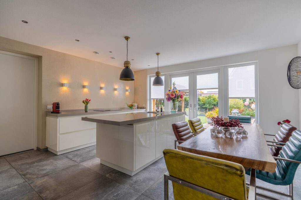 De ruime, open L-vormige leefruimte voelt licht en uitnodigend aan. Aan de achterzijde bevindt zich de moderne witte hoogglans keuken, voorzien van een royaal werkblad, kookeiland met zitmogelijkheid, en inbouwapparatuur zoals een oven, magnetron, vaatwasser en inductiekookplaat met geïntegreerde afzuiging. Er is meer dan genoeg plek voor een grote eettafel. Aan de voorzijde ligt de woonkamer met veel lichtinval door de grote ramen. De garage/berging grenst aan de keuken en is bereikbaar vanuit de tuin én via de dubbele deuren aan de oprit. In de hal vind je de meterkast, een modern toilet en de trap naar boven, die sfeervol is afgewerkt met ingebouwde verlichting.