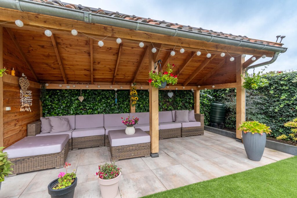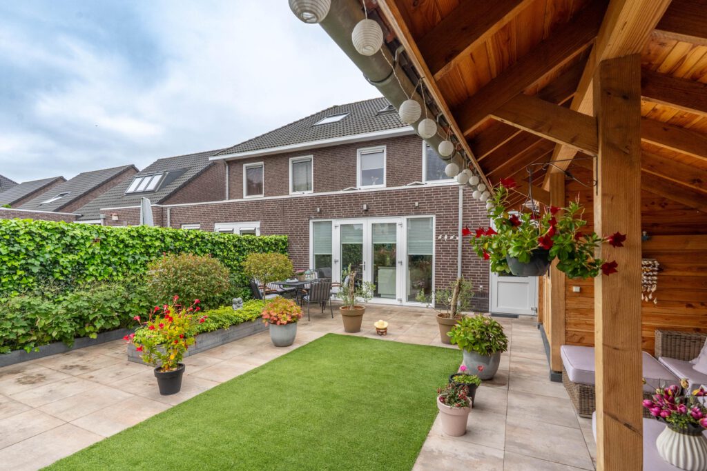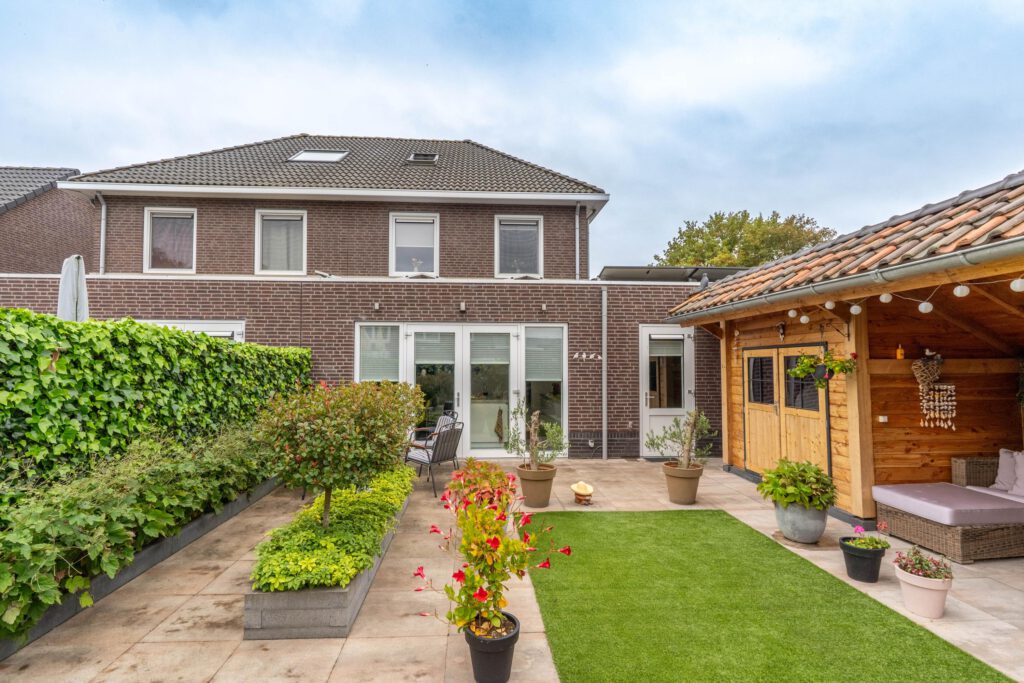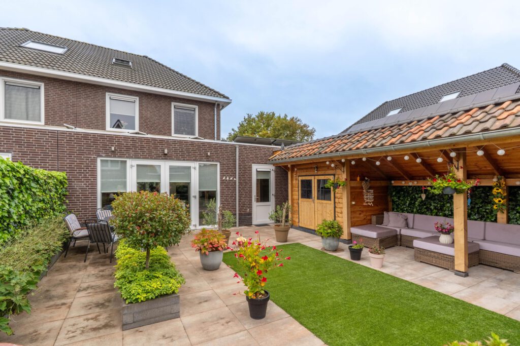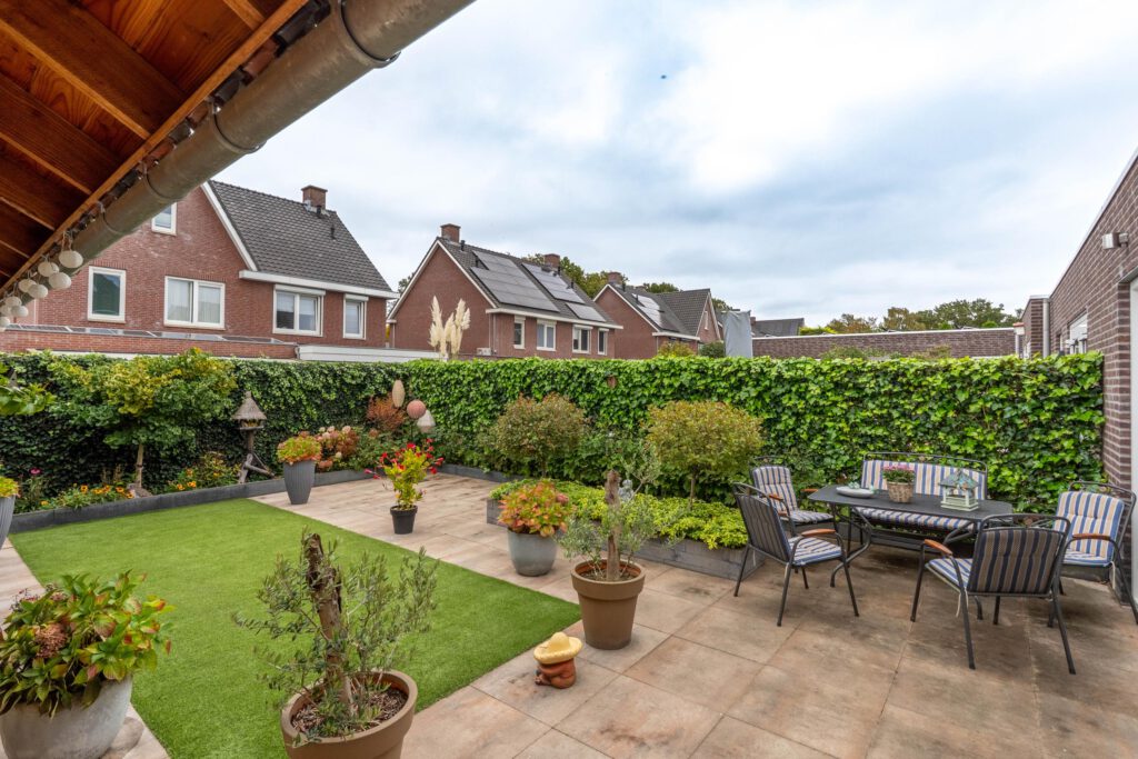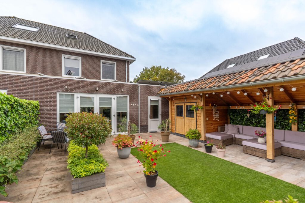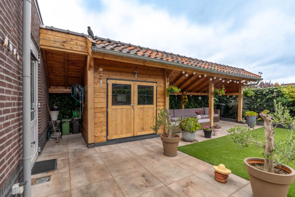 De tuin ligt op het noorden, maar dankzij de gunstige ligging geniet je hier volop van de zon. Onder de ruime overkapping zit je beschut en comfortabel buiten, perfect voor een gezellige barbecue of een ontspannen borrel. Daarnaast beschikt de tuin over een handige berging, en heb je via zowel de achterdeur van de hobbyruimte als de openslaande tuindeuren vanuit de keuken toegang tot binnen.