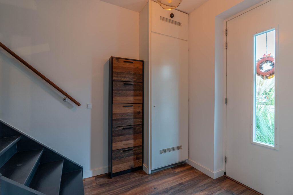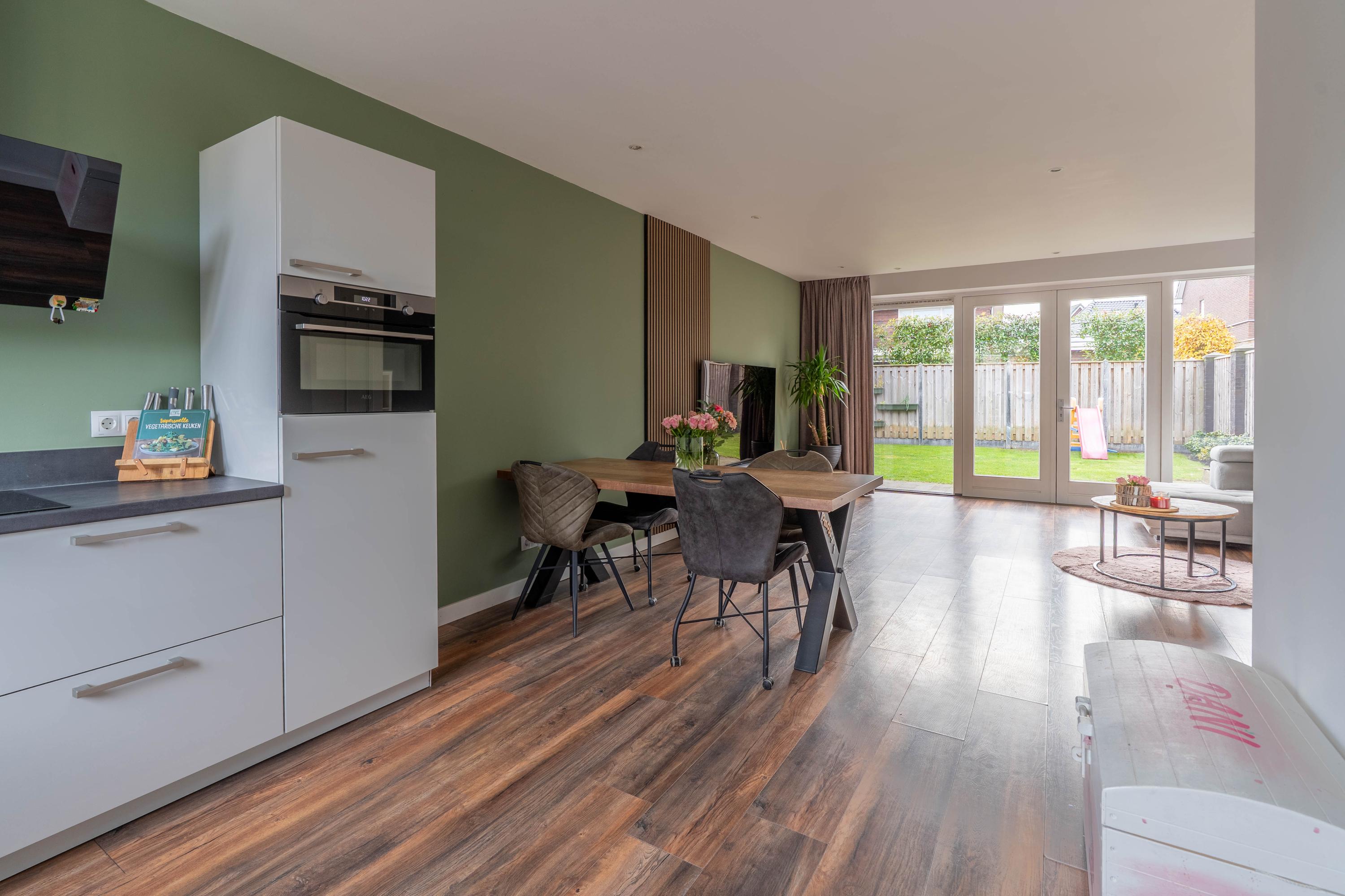 Aan de achterzijde bevindt zich de lichte woonkamer, met grote raampartijen en dubbele openslaande deuren naar de tuin. De handige trapkast biedt extra bergruimte, altijd fijn!