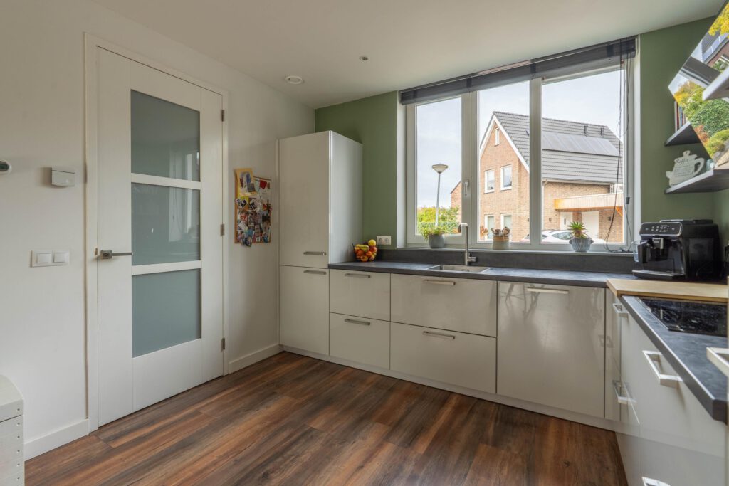 Via de voordeur kom je binnen in de hal met toegang tot het toilet, de meterkast, de trap naar boven en de leefruimte. Aan de voorzijde ligt de moderne keuken, uitgerust met een oven, kookplaat en vaatwasser. Tijdens het koken heb je leuk uitzicht op de straat.