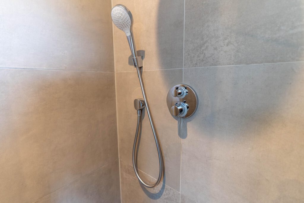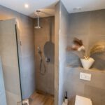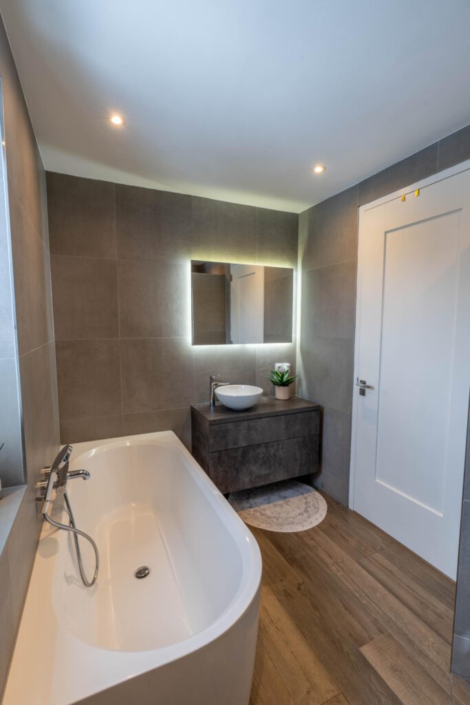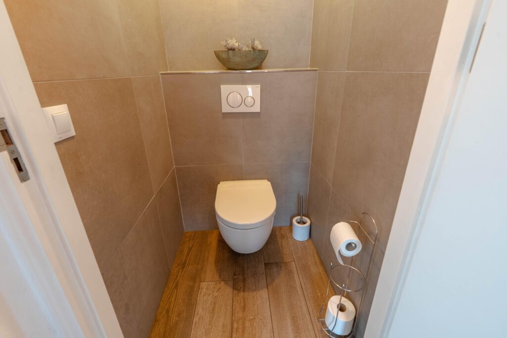 De moderne badkamer is van alle gemakken voorzien: een douche, ligbad, toilet en wastafelmeubel.