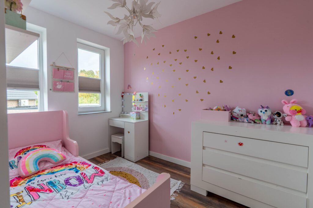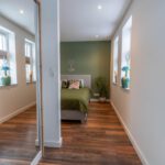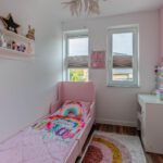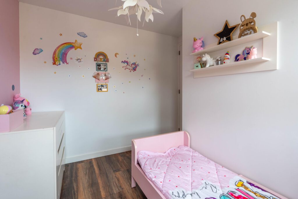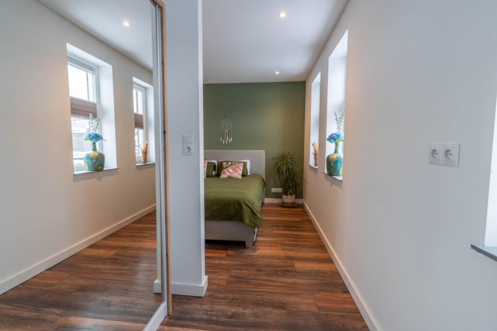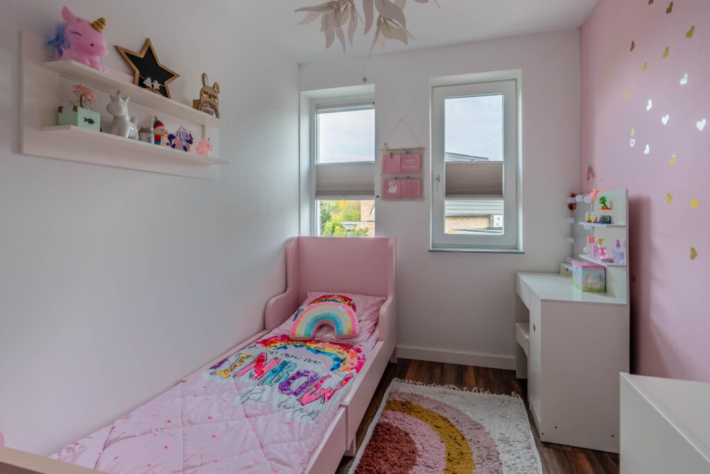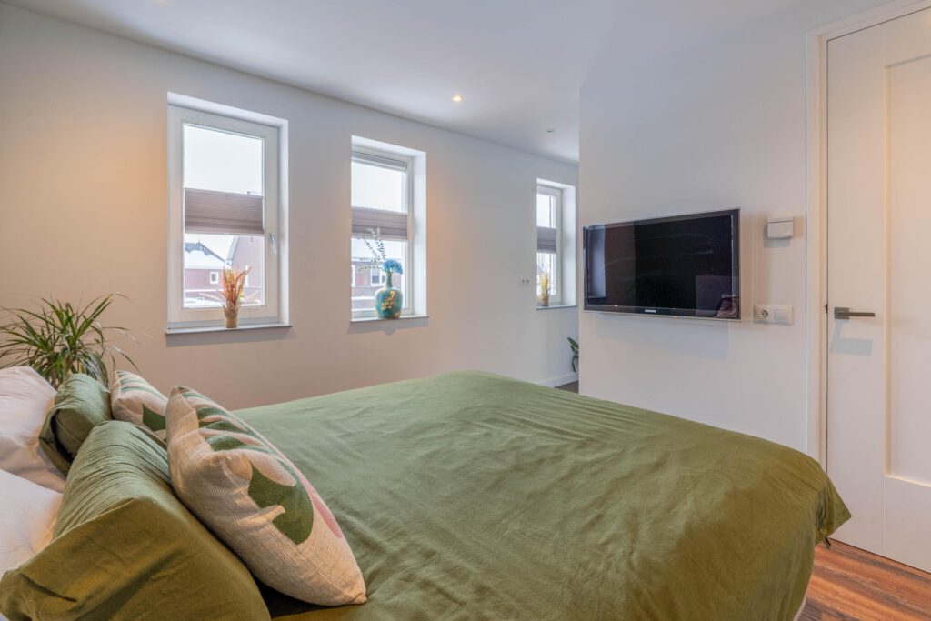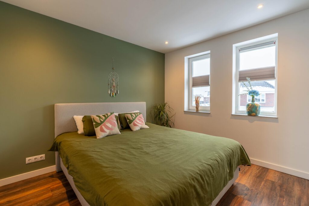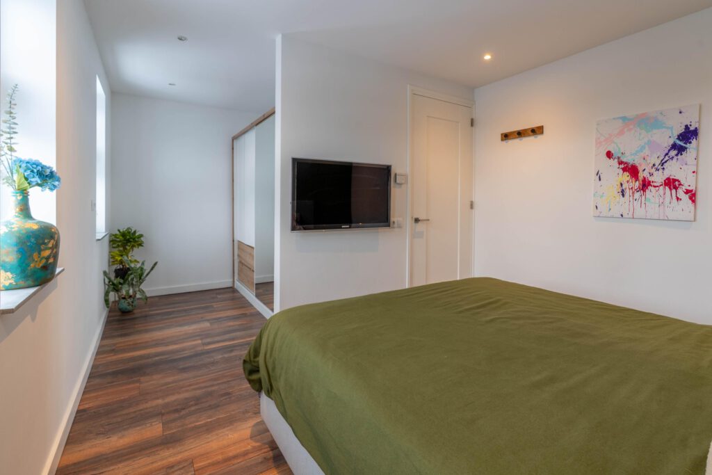De eerste verdieping telt twee slaapkamers. De master bedroom is ruim opgezet en biedt plaats aan een tweepersoonsbed en grote kledingkast. De tweede slaapkamer is ideaal als kinderkamer, logeerkamer of thuiswerkplek.