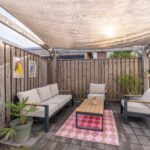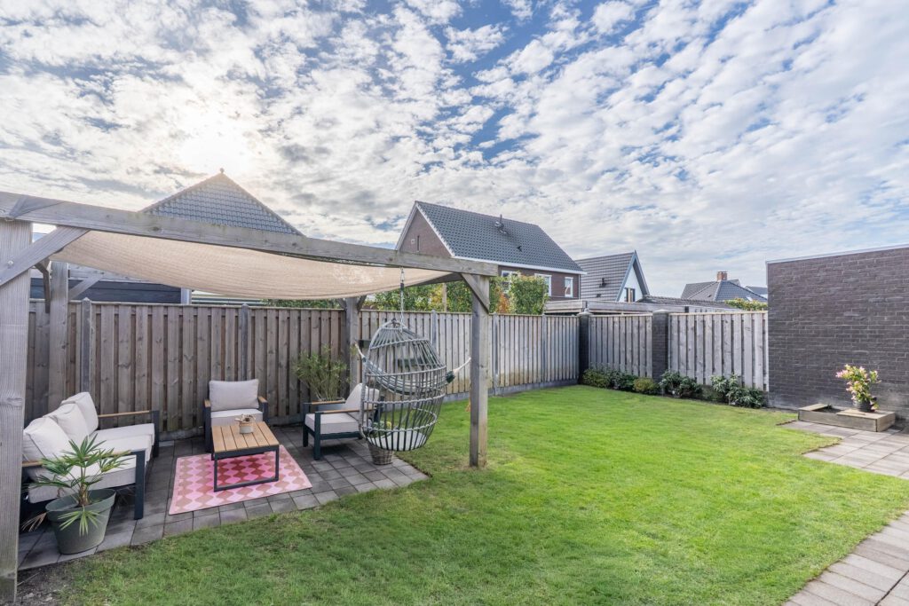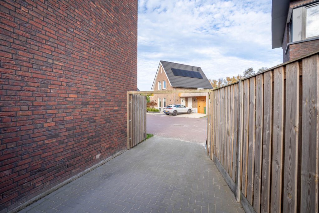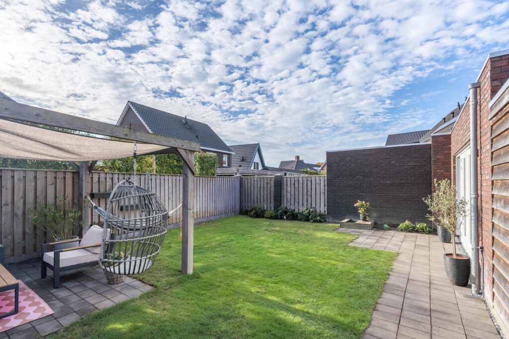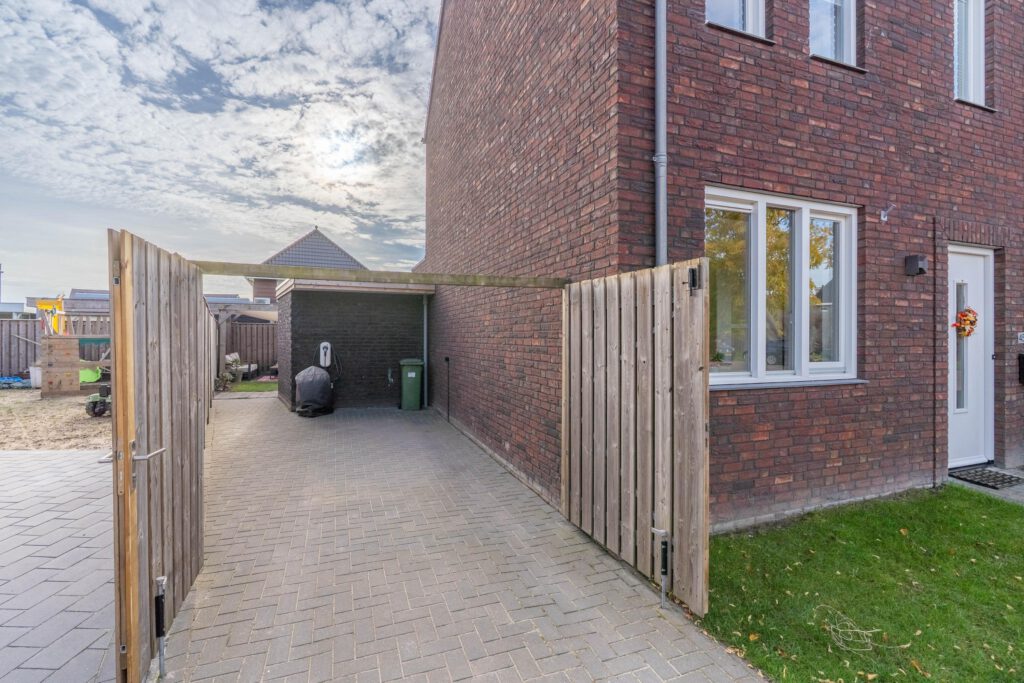 Een bijzonder pluspunt van deze woning is de afsluitbare oprit. Achter de houten poort kun je je auto veilig en uit het zicht parkeren. Via de achterom bereik je de zonnige tuin, compleet met een gezellig terras voorzien van zonnedoek en een praktische berging voor fietsen of tuingereedschap.
