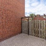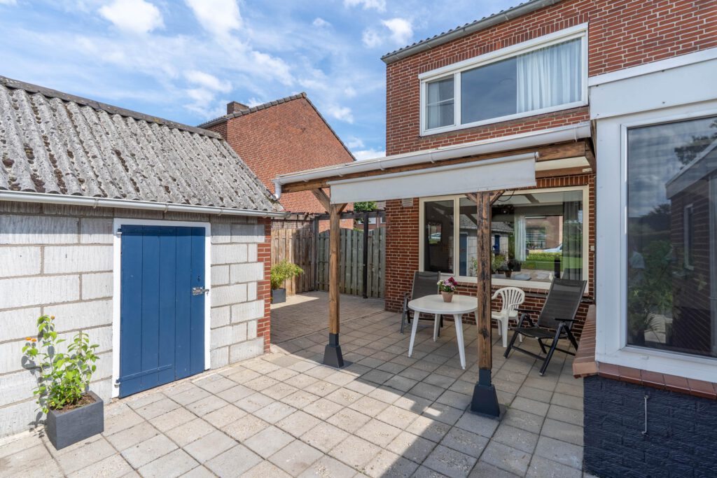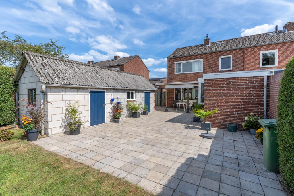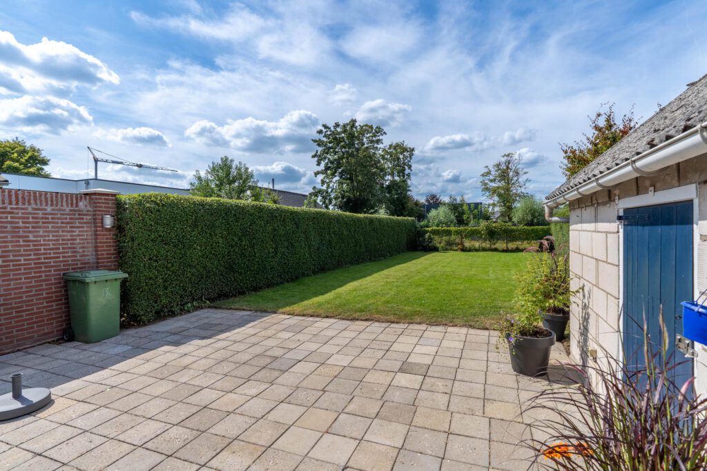 is parkeerruimte voor de auto en een toegang tot de achtertuin. Deze royale tuin is deels betegeld