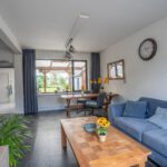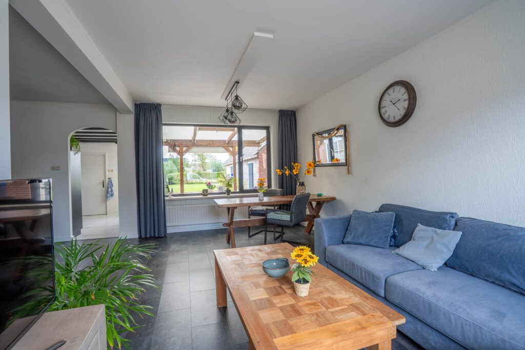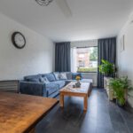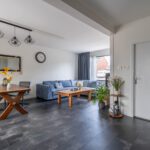 Via de hal komt u in de lichte woonkamer, voorzien van een antracietkleurige vloer en grote