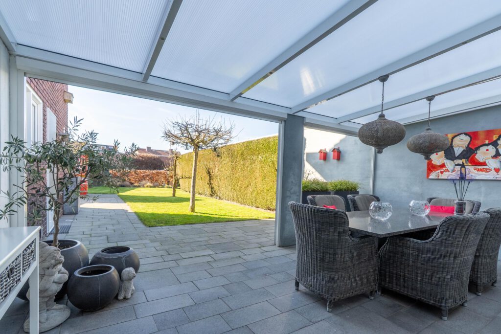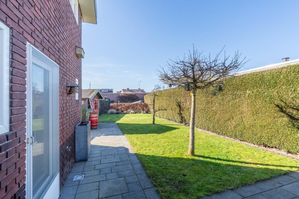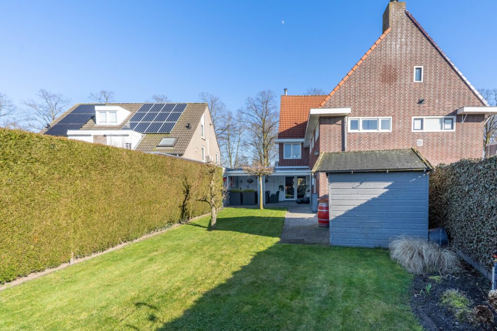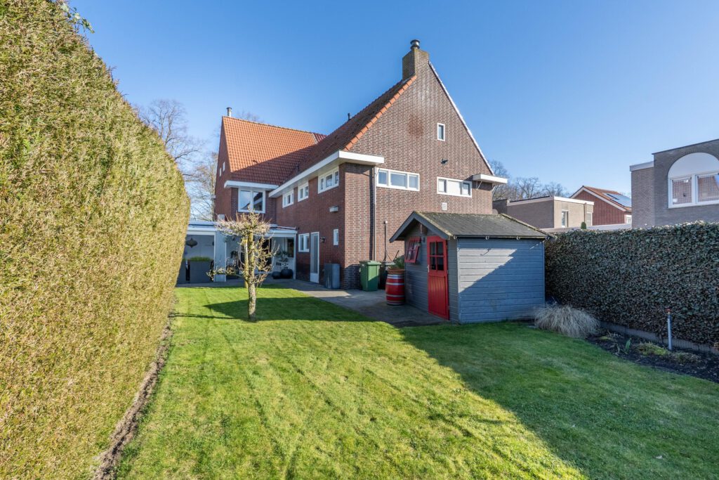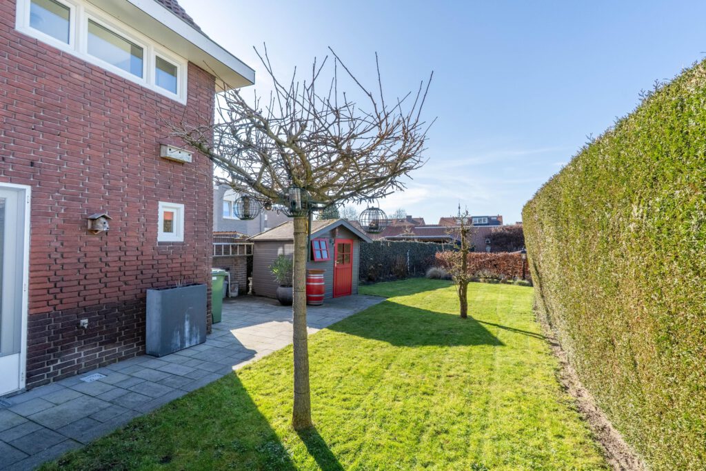 De tuin is gelegen op het westen, waardoor je hier lang van de zon kunt genieten. Dankzij de volwassen beplanting heeft de tuin een groene en sfeervolle uitstraling en biedt deze bovendien veel privacy. In de tuin staat een tuinhuisje, ideaal voor extra bergruimte en opslag. Daarnaast is er een ruime overkapping aanwezig, zodat je zowel in het voorjaar als in het najaar comfortabel buiten kunt zitten. Achter in de tuin bevinden zich bovendien 20 zonnepanelen. De tuin biedt daarmee een fijne combinatie van ontspanning, privacy en praktisch gemak.
