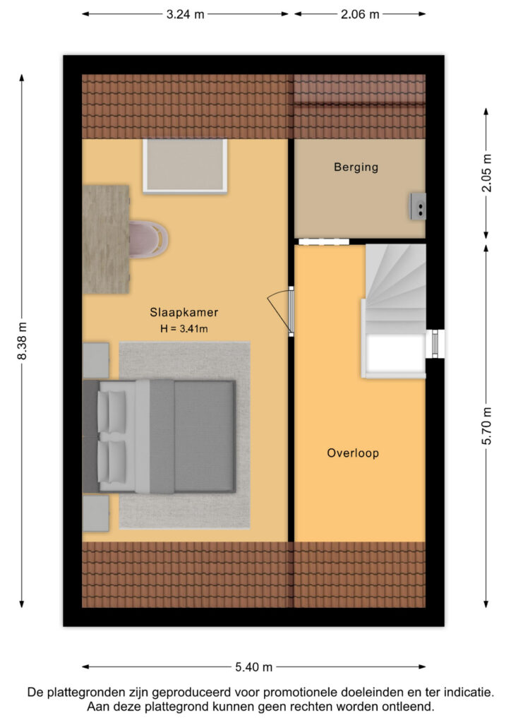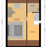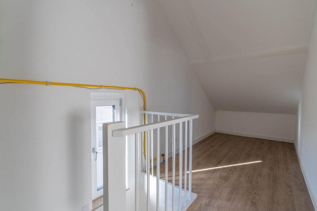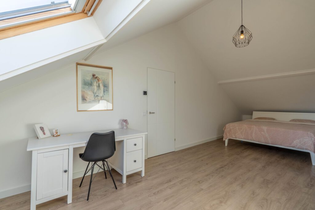 De tweede verdieping is volledig nageïsoleerd en afgewerkt met een warme houtlook pvc-vloer. Momenteel in gebruik als ruime slaapkamer van circa 25 m², met een royale nokhoogte van 3,41 meter, waardoor de ruim en licht aanvoelt. Via een vlizotrap in de garage nog een extra ruime zolderruimte bereikbaar – ideaal voor spullen die je niet dagelijks nodig hebt.