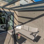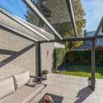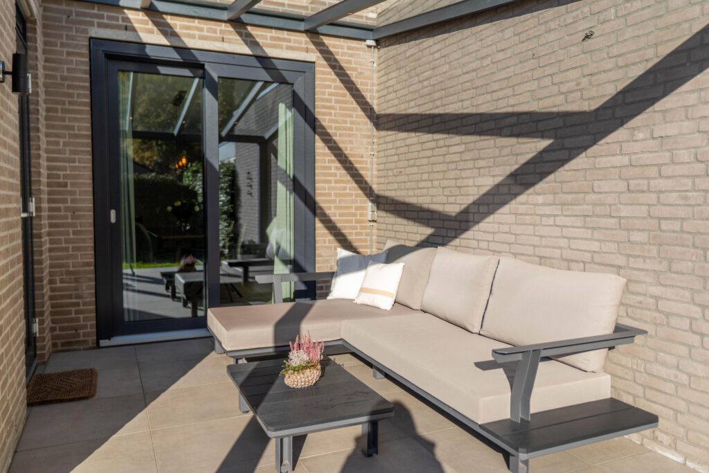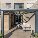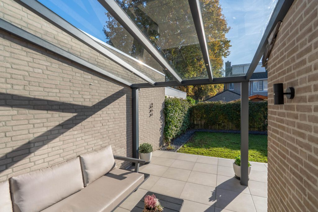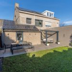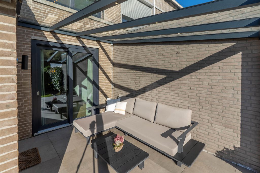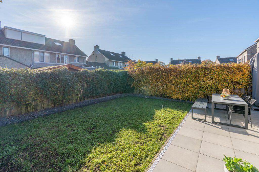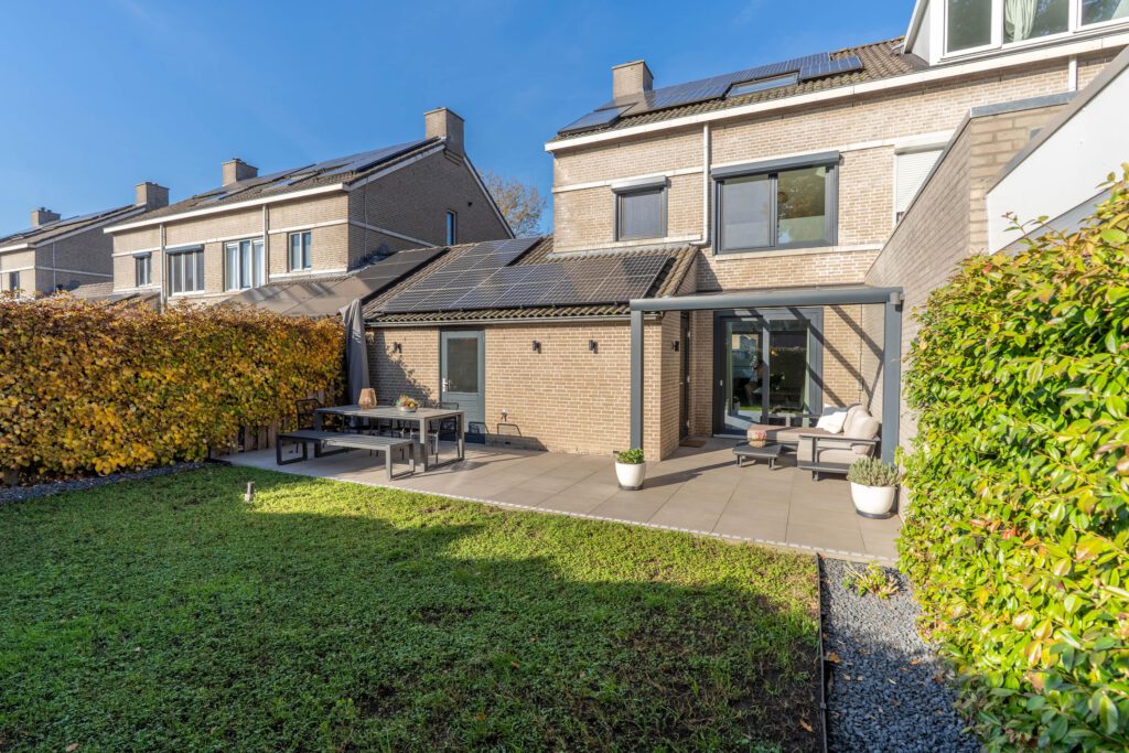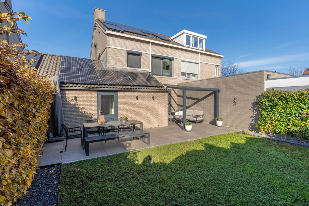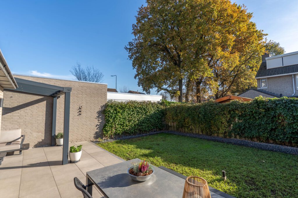 De achtertuin ligt op het zonnige zuiden, met moderne tegels en een aluminium overkapping, een ideale plek om om ook bij minder mooi weer heerlijk buiten te zitten om te ontspannen, borrelen of spelen.