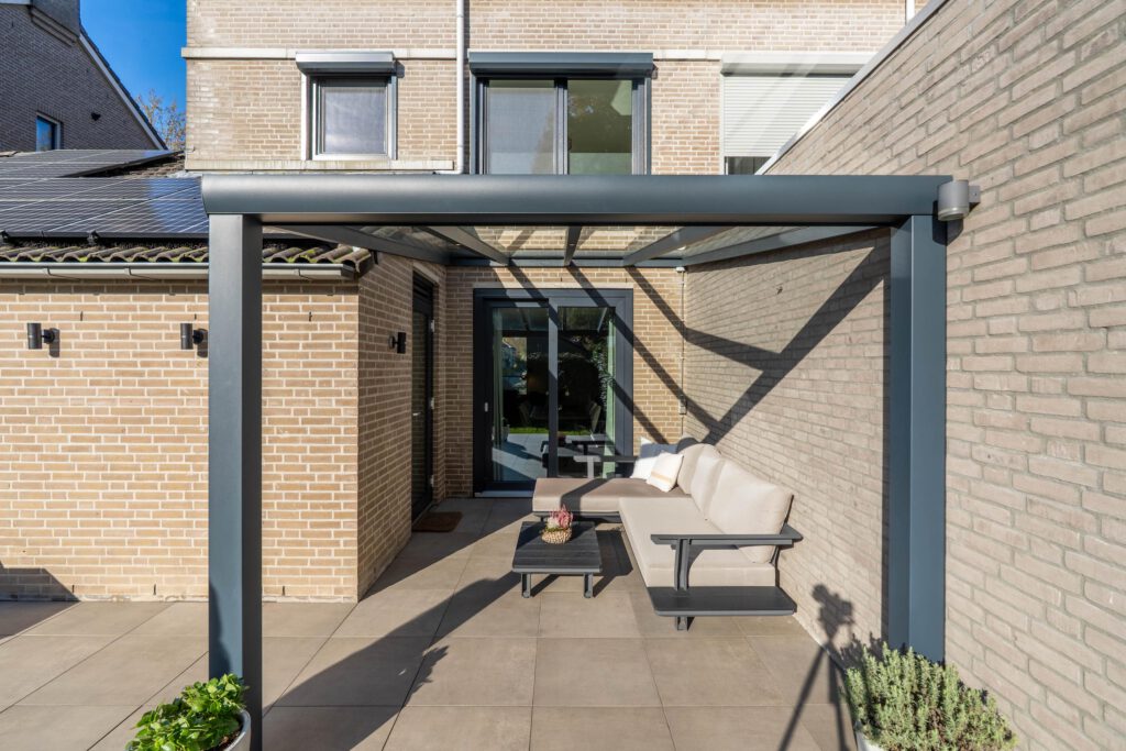 Zonnige tuin met overkapping