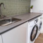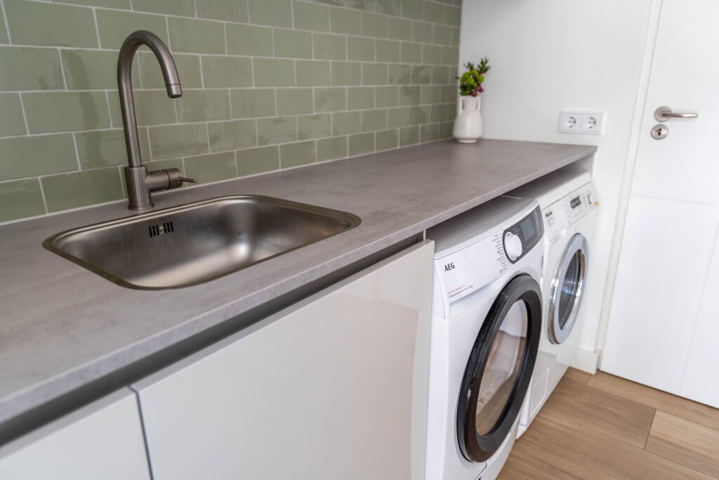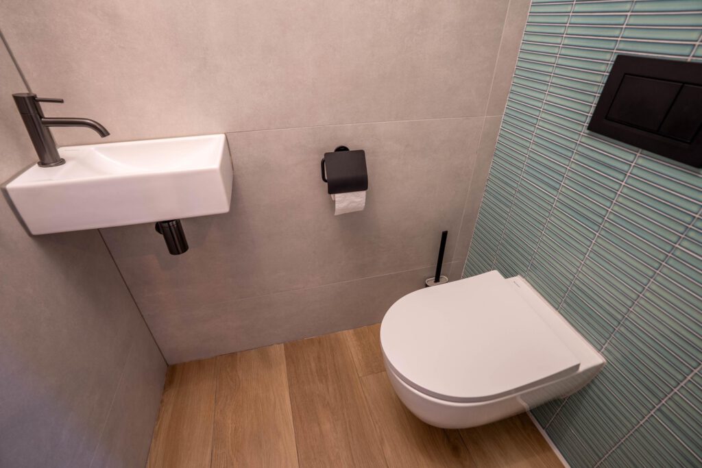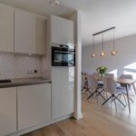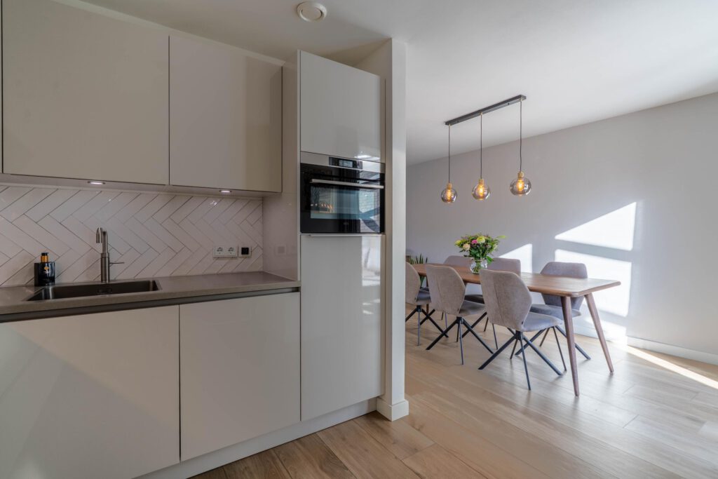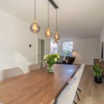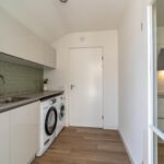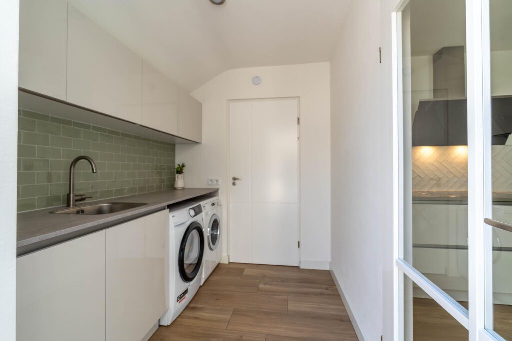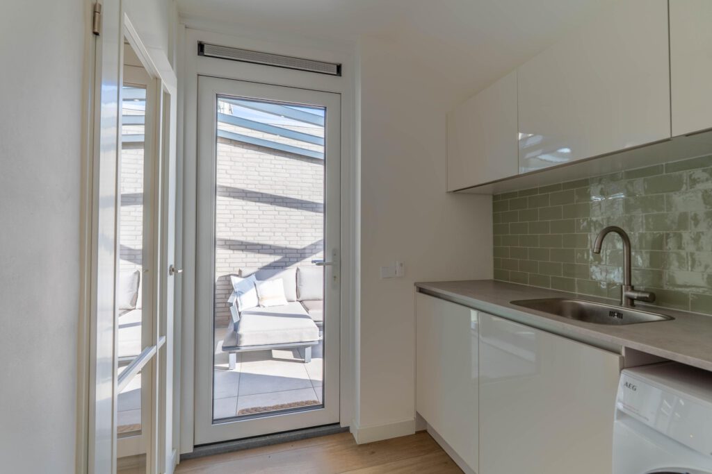De ruime, moderne keuken is van alle gemakken voorzien, met een stijlvol betonlook composiet werkblad en apparatuur zoals Quooker, inductiekookplaat, combi-oven en vaatwasser. Dankzij de open verbinding met de eettafel blijf je tijdens het koken in contact met elkaar. De bijkeuken sluit naadloos aan, is in dezelfde stijl afgewerkt als de keuken en biedt volop ruimte voor was en opslag. Op de begane grond is bovendien een modern, nieuw toilet geplaatst.
