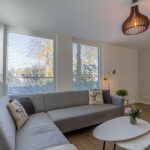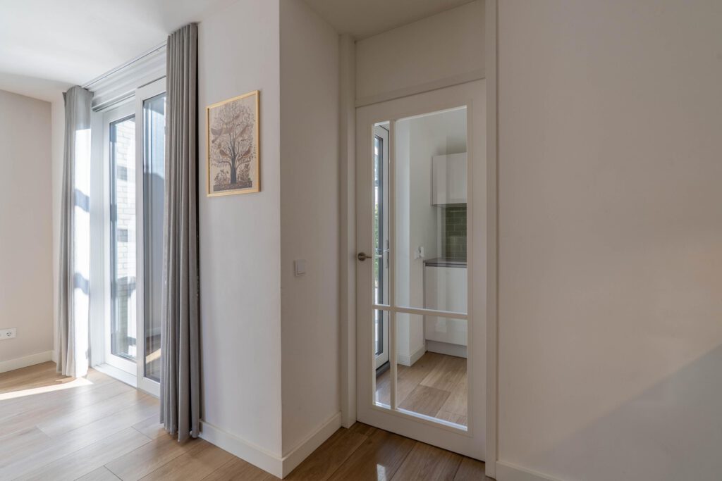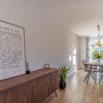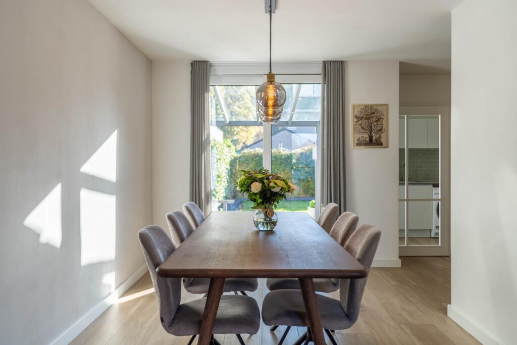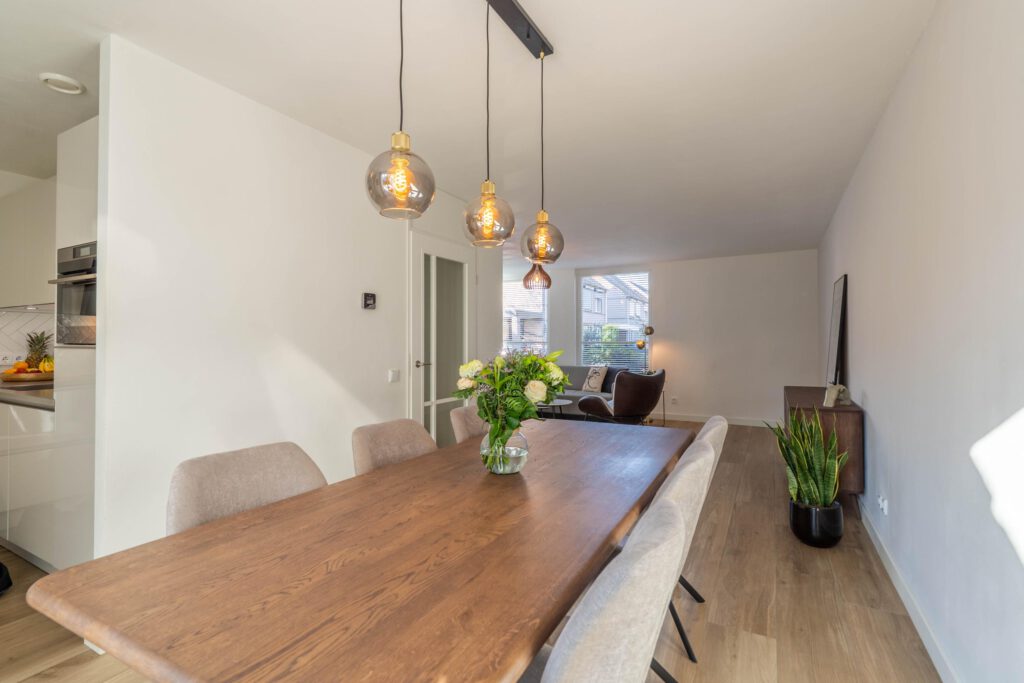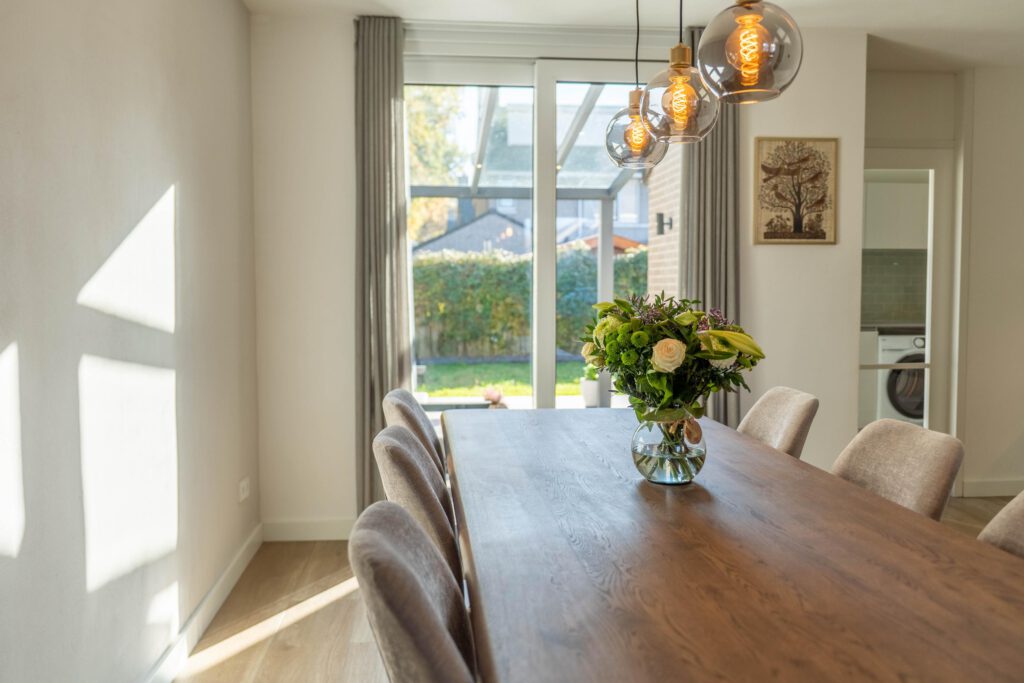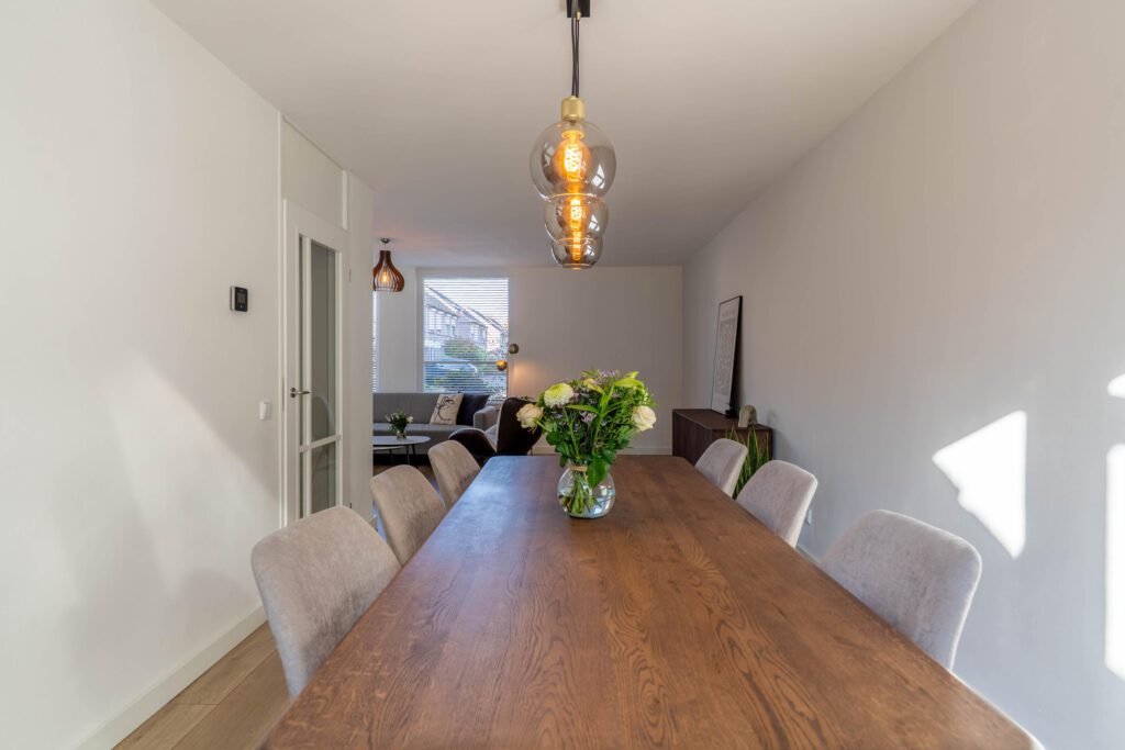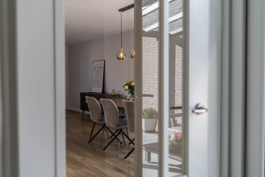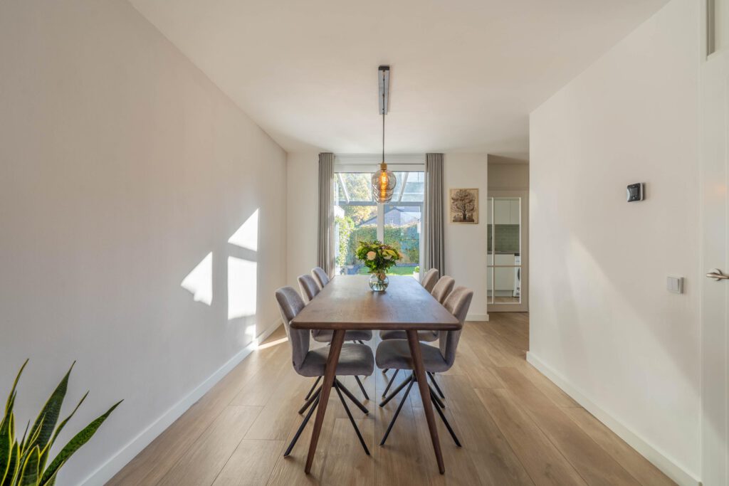 Bij binnenkomst voel je meteen de ruimte en het licht. De warme houtlookvloer en neutrale kleuren creëren een rustgevende, moderne sfeer. De schuifpui laat daglicht rijkelijk binnen en verbindt binnen en buiten – ideaal om het hele jaar door van de tuin te genieten. Vloerverwarming biedt behaaglijke warmte in de winter en verkoeling in de zomer. Met de slimme zonemanager van ATAG regel je eenvoudig per ruimte de gewenste temperatuur – gemak én energiezuinig.