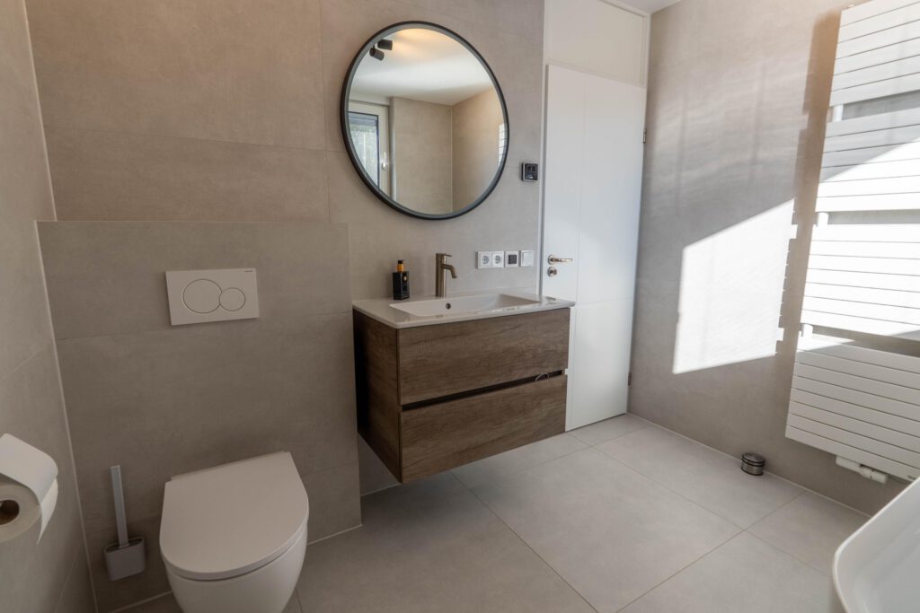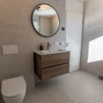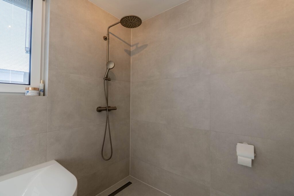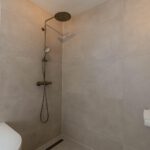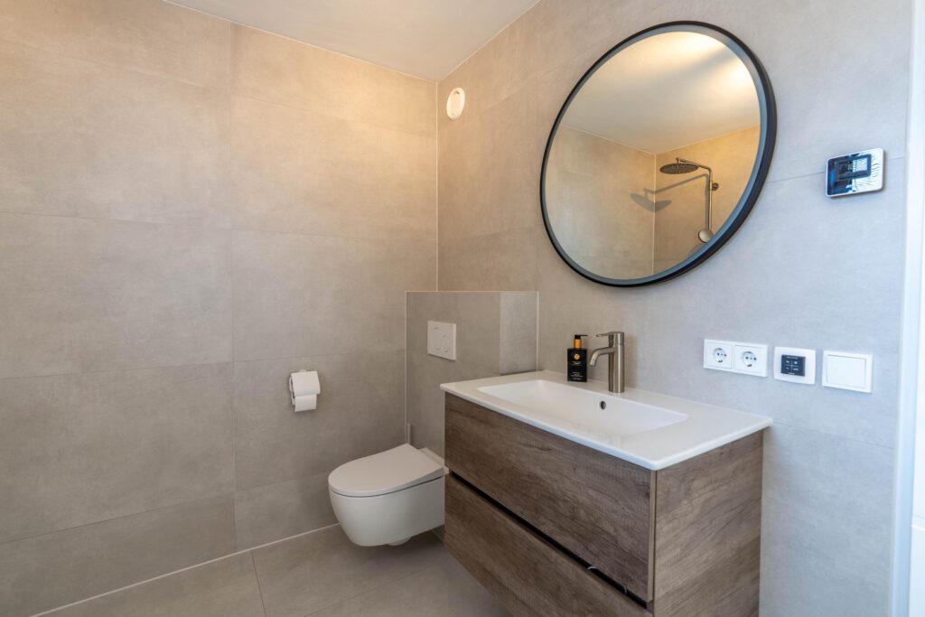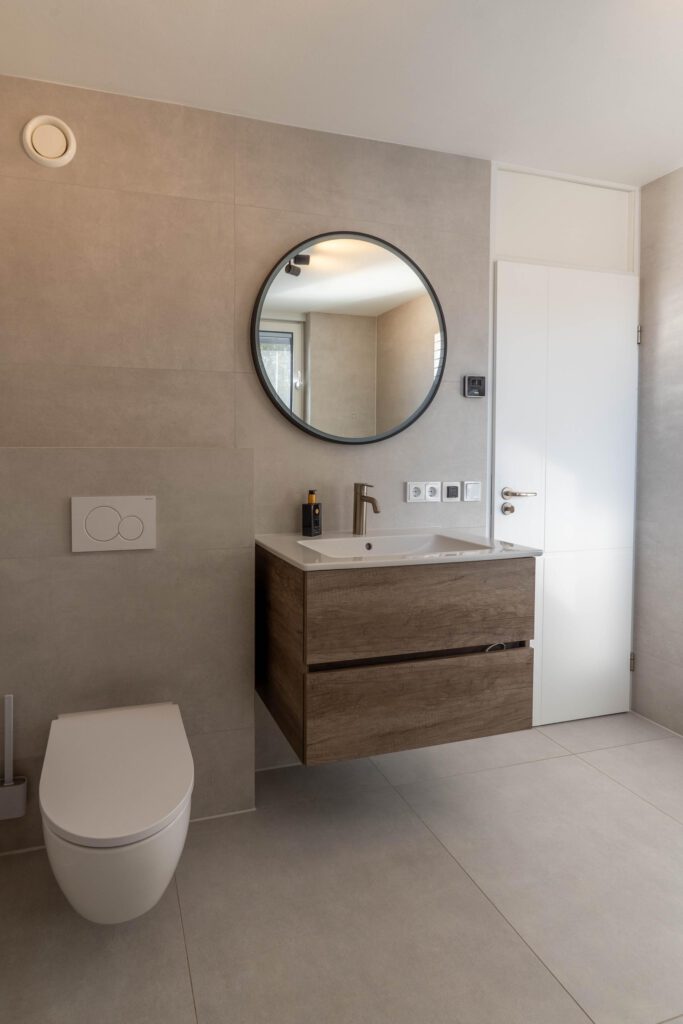 De eerste verdieping biedt twee ruime slaapkamers van circa 12 m² en 20 m², elk met een warme houtlook pvc-vloer. De moderne badkamer is een plek om echt tot rust te komen – voorzien van een inloopdouche, ligbad, stijlvol wastafelmeubel en vloerverwarming. Het binnenklimaat in de slaapkamers is altijd aangenaam dankzij de JAGA Strada Hybrid, waarmee je eenvoudig kunt verwarmen of koelen naar wens.