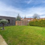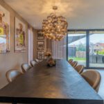 Via de grote raampartijen en schuifpui kijk je uit op de tuin. De aangrenzende bijkeuken, bereikbaar via een schuifdeur, biedt extra gemak.
