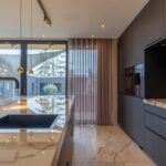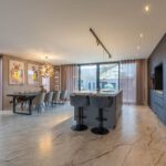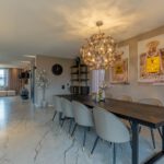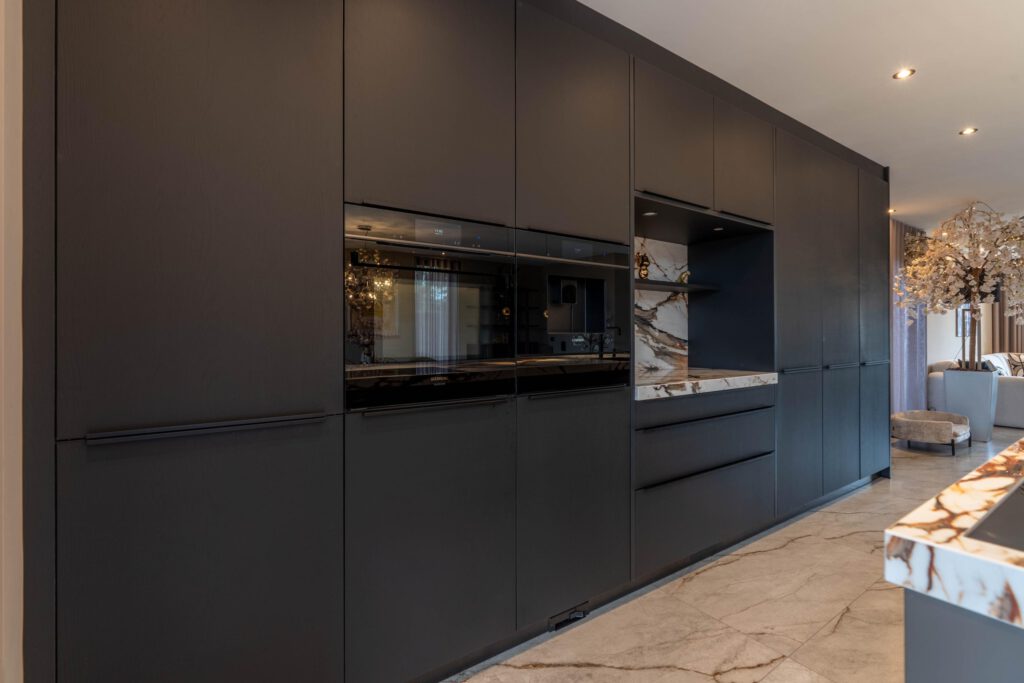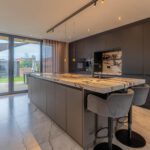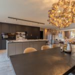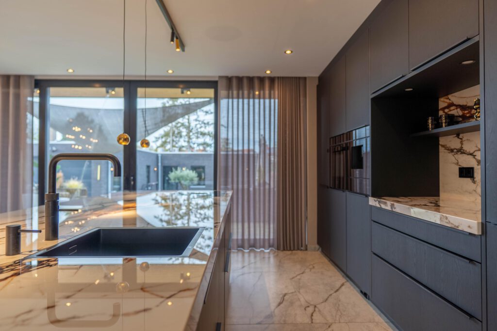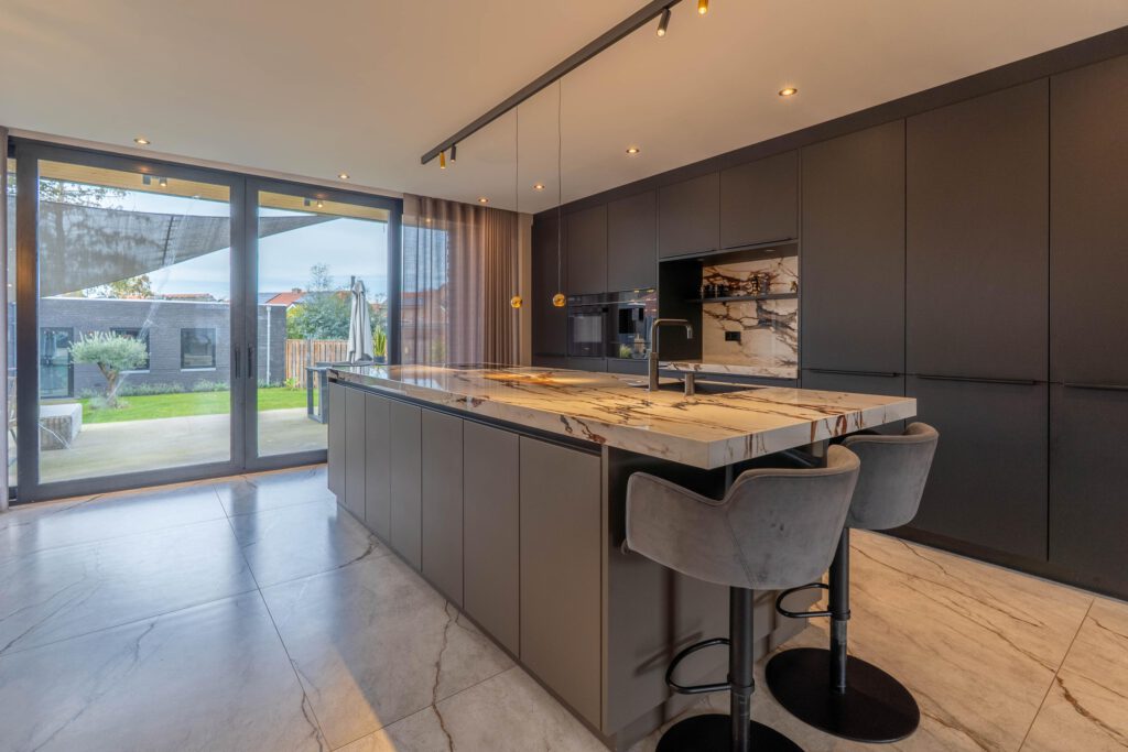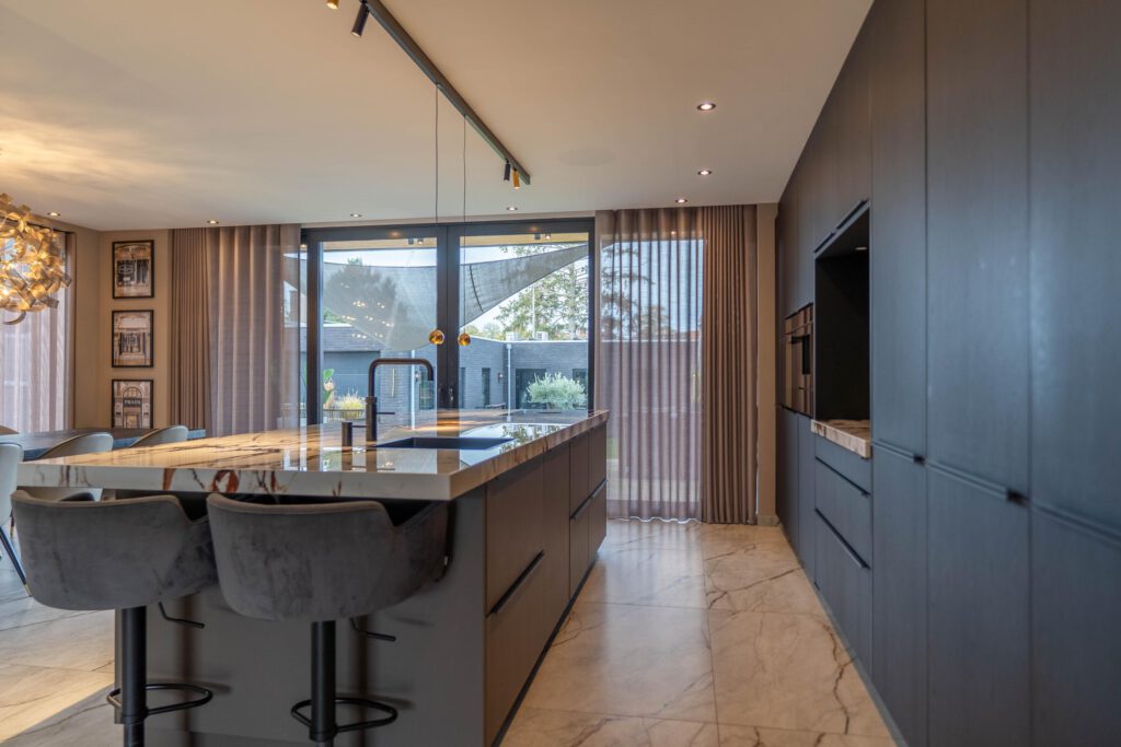 Het hart van de woning is de grote open leefkeuken met een indrukwekkend keukeneiland en een kastenwand met meer dan genoeg opbergruimte. De keuken is uitgerust met hoogwaardige apparatuur: oven, ingebouwde koffiemachine, vaatwasser, Quooker en een inductiekookplaat met geïntegreerde afzuiging.