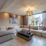 Aan de voorzijde ligt de gezellige woonkamer met ruimte voor een grote bank en uitzicht op de straat.