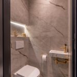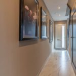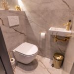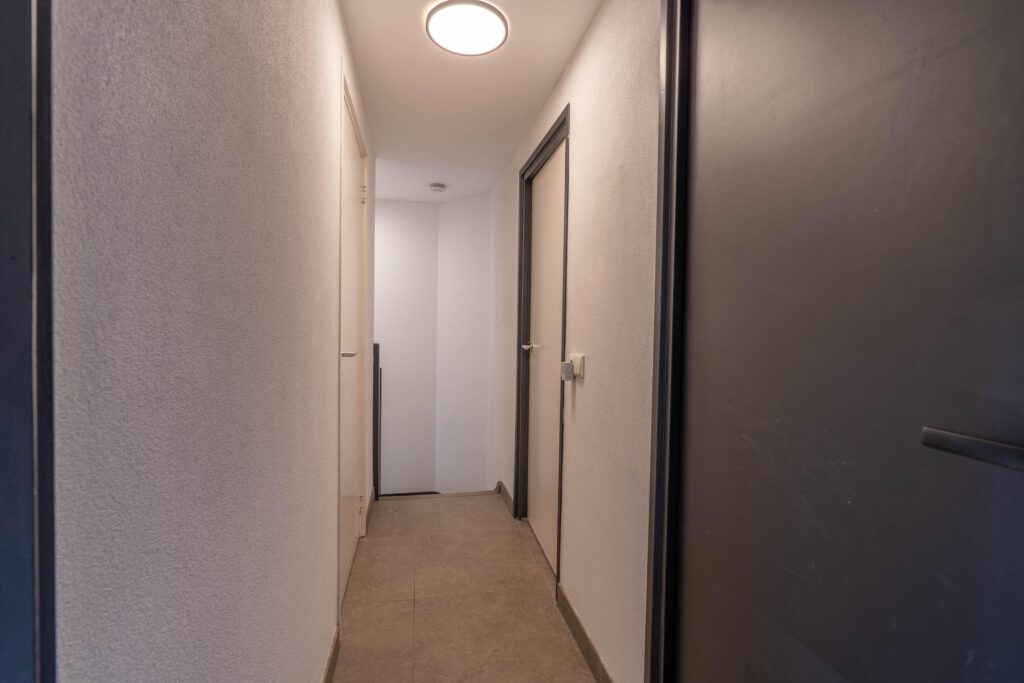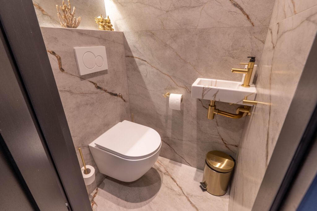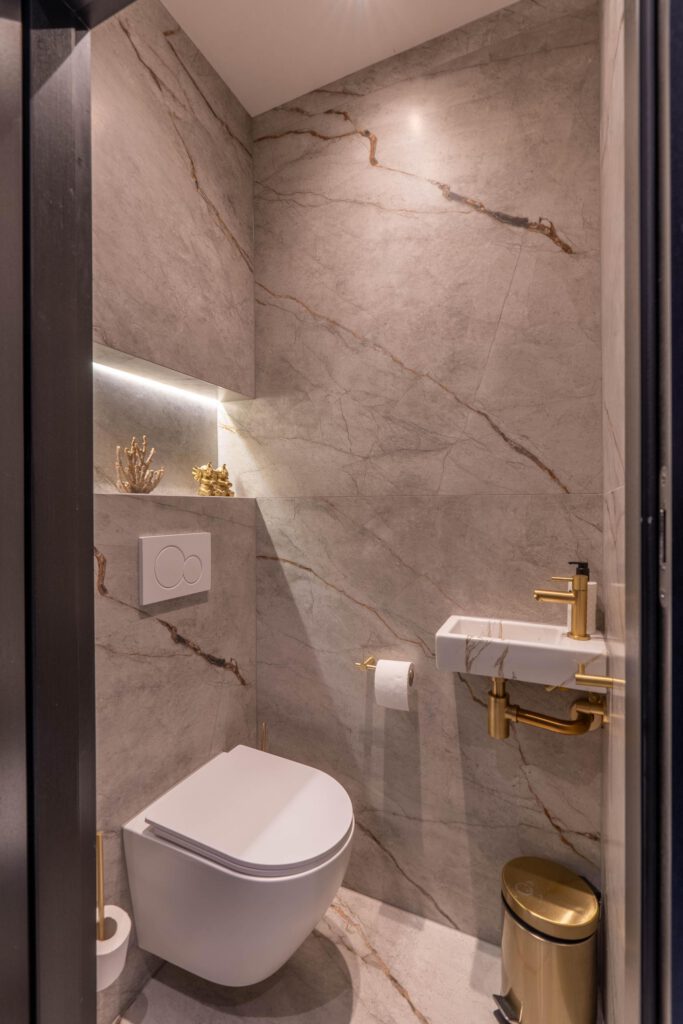 Bij binnenkomst valt meteen de moderne afwerking op. De marmerlook vloer loopt strak door over de hele begane grond. Vanuit de hal heb je toegang tot het toilet (stijlvol en modern afgewerkt) en de trap naar boven.