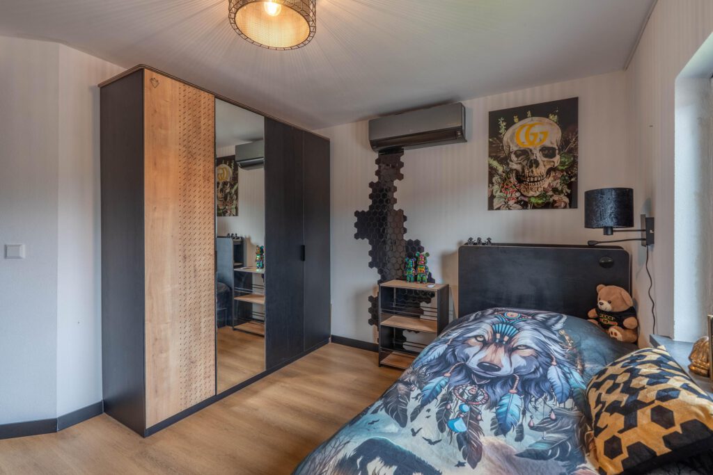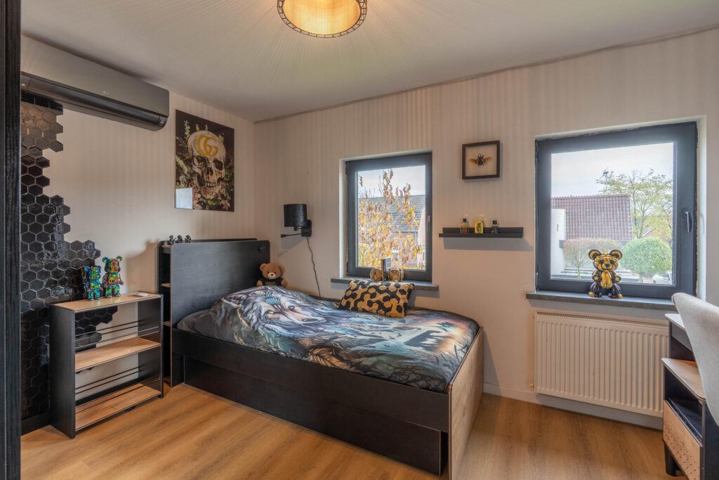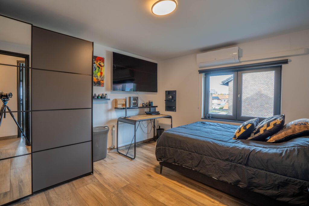 Boven vind je drie ruime slaapkamers, elk voorzien van een eigen airco. De master bedroom is extra royaal en heeft toegang tot een balkon met uitzicht op de tuin. Hier is ook ruimte voor een inloopkast of zelfs een ensuite badkamer.
