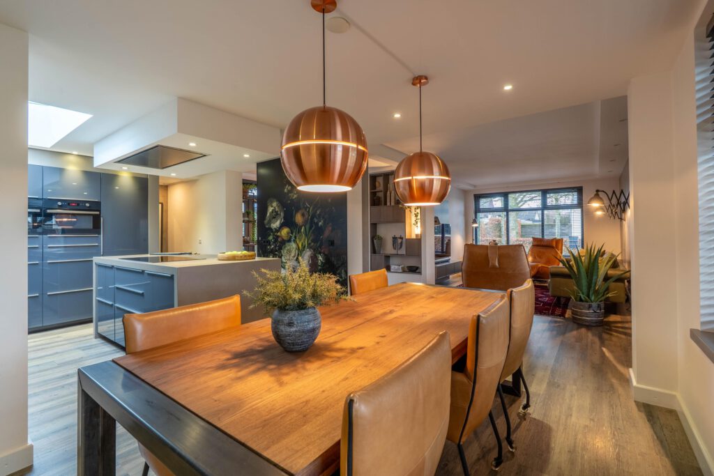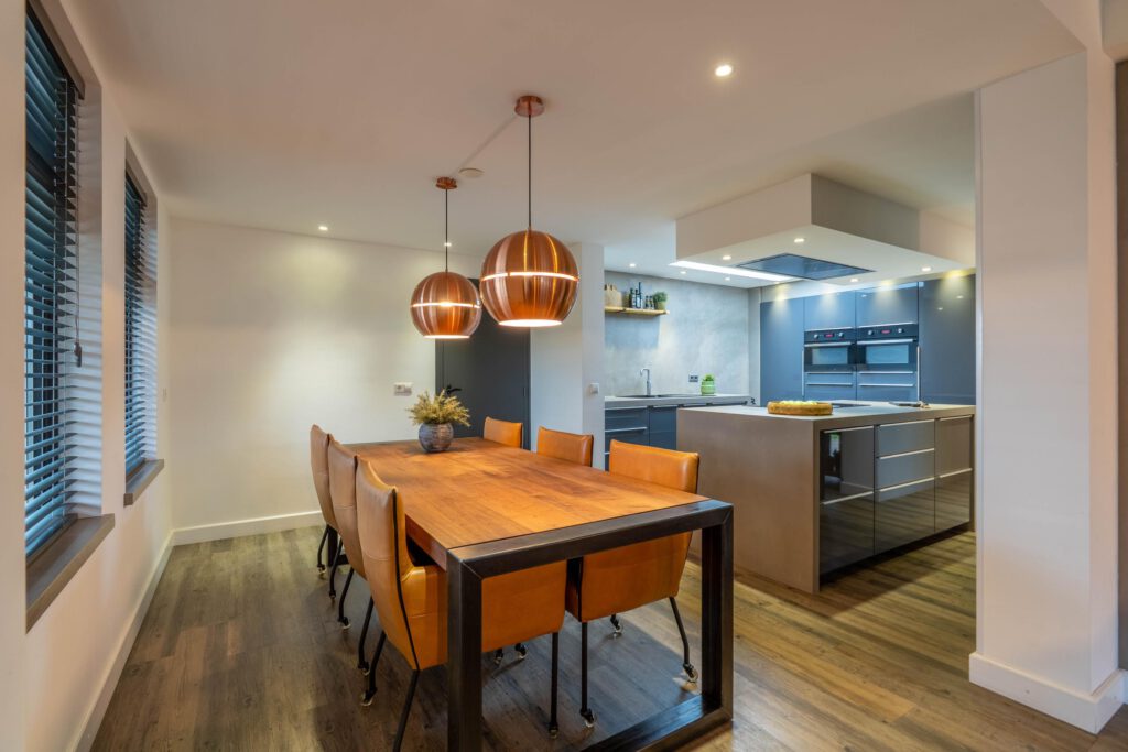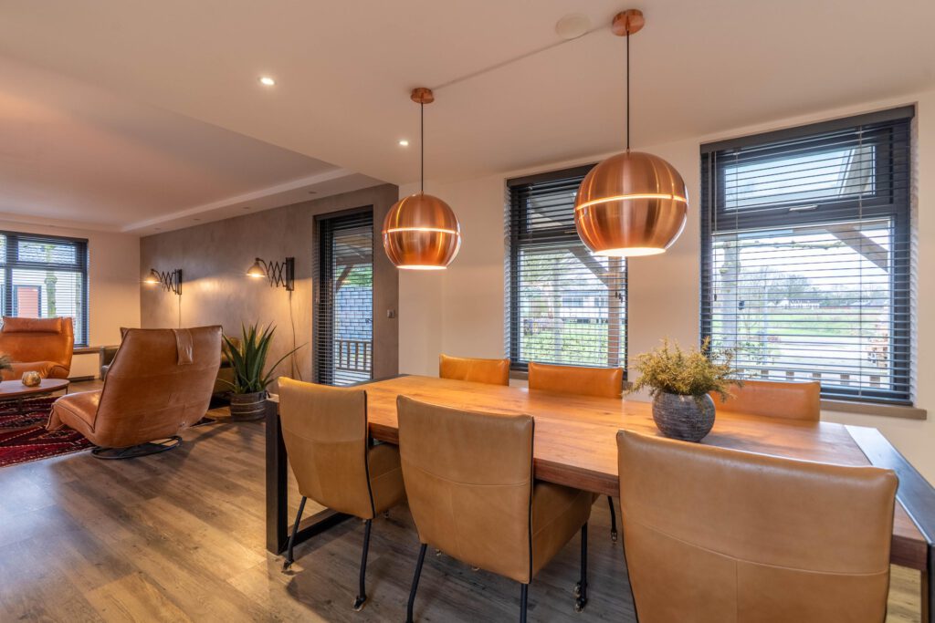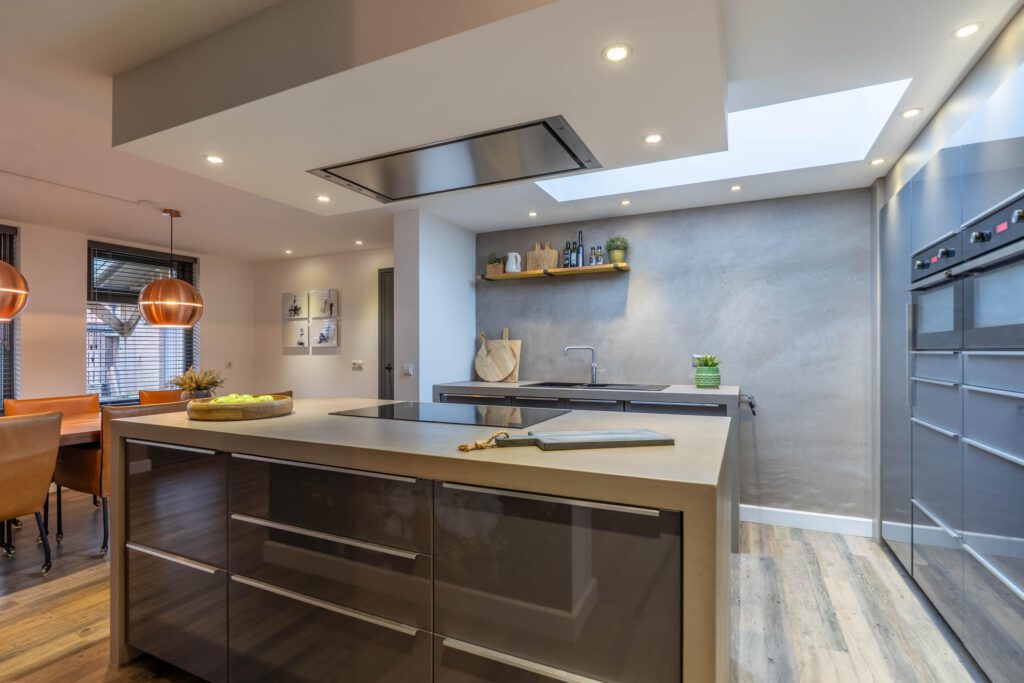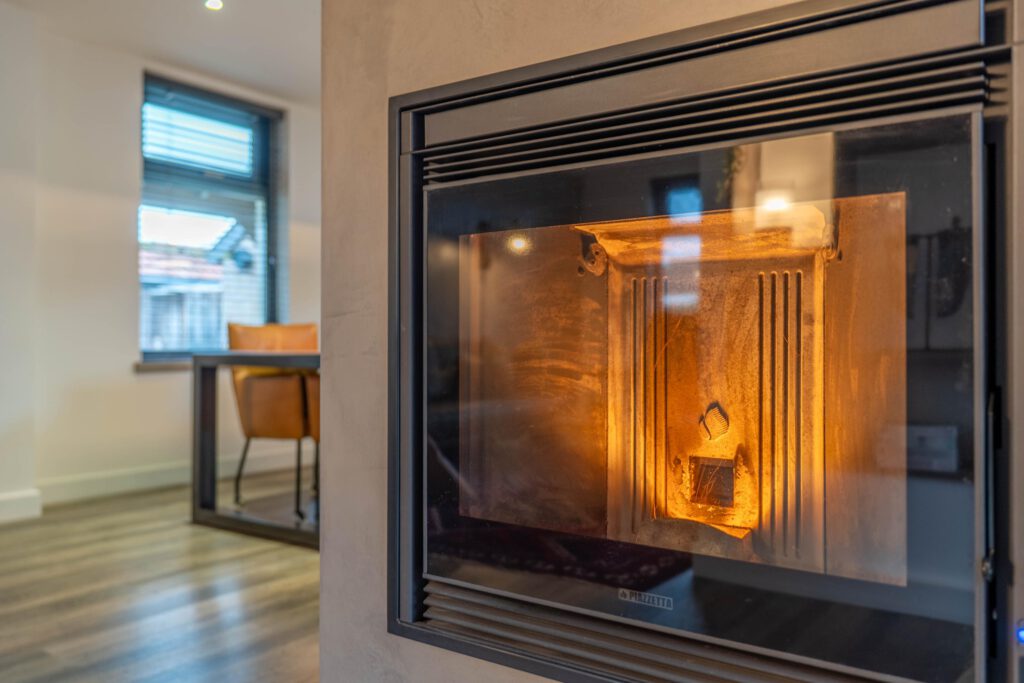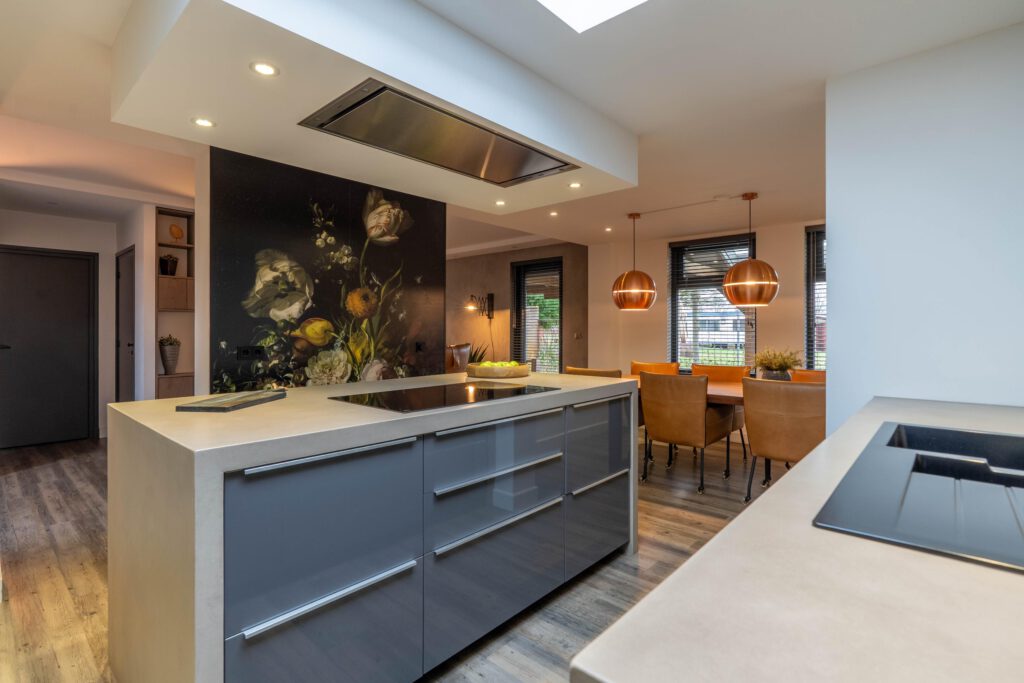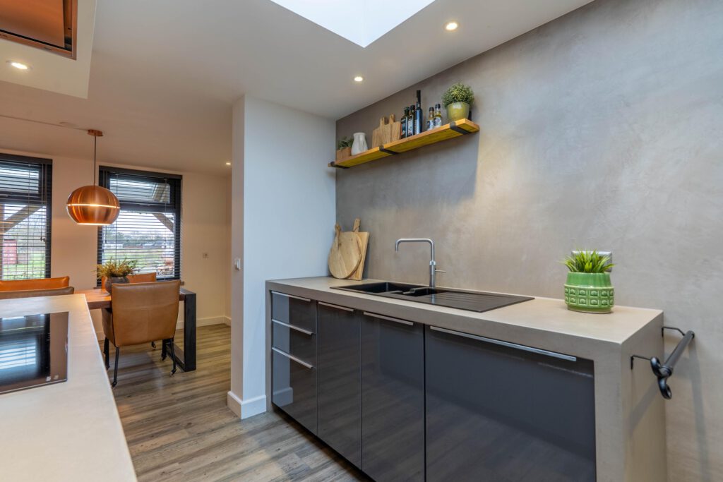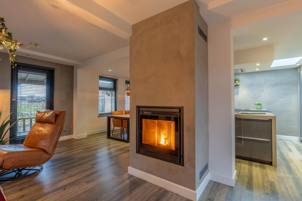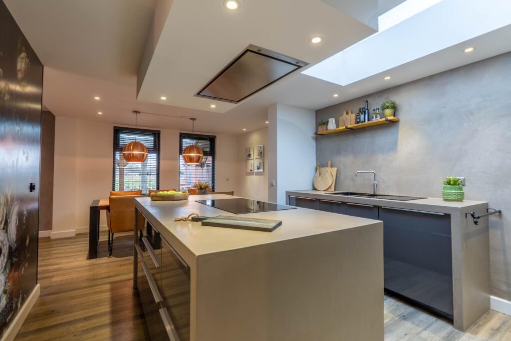 De begane grond is ruim en praktisch ingedeeld. De woonkamer en keuken vormen samen een open leefruimte, die gedeeltelijk wordt gescheiden door een sfeervolle pellet kachel verwerkt in een scheidingswand. De open keuken is uitgerust met een groot kookeiland, een los keukenblok en een grote kastenwand met inbouwapparatuur. Het eiland beschikt over een kookplaat, waarbij de afzuiging strak in het plafond is verwerkt. Er is meer dan voldoende kastruimte en tijdens het koken sta je in direct contact met de eetkamer.