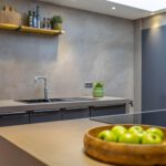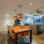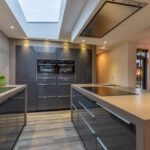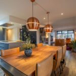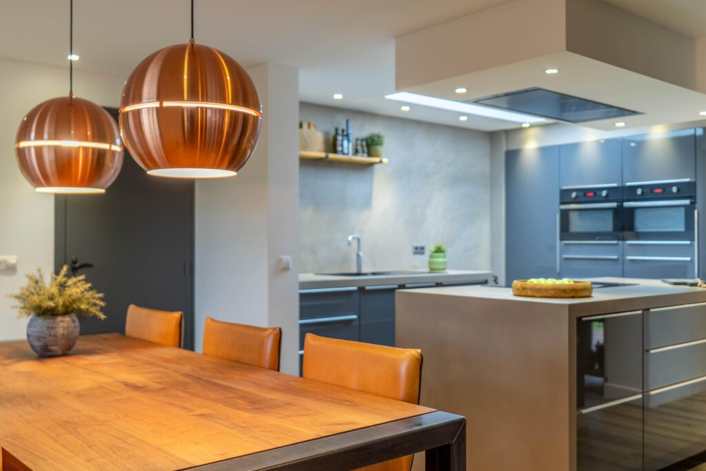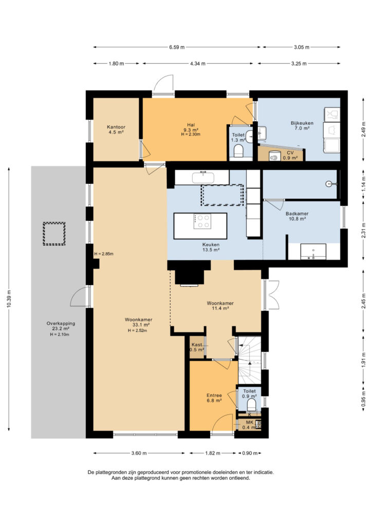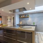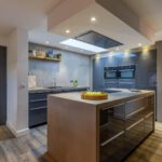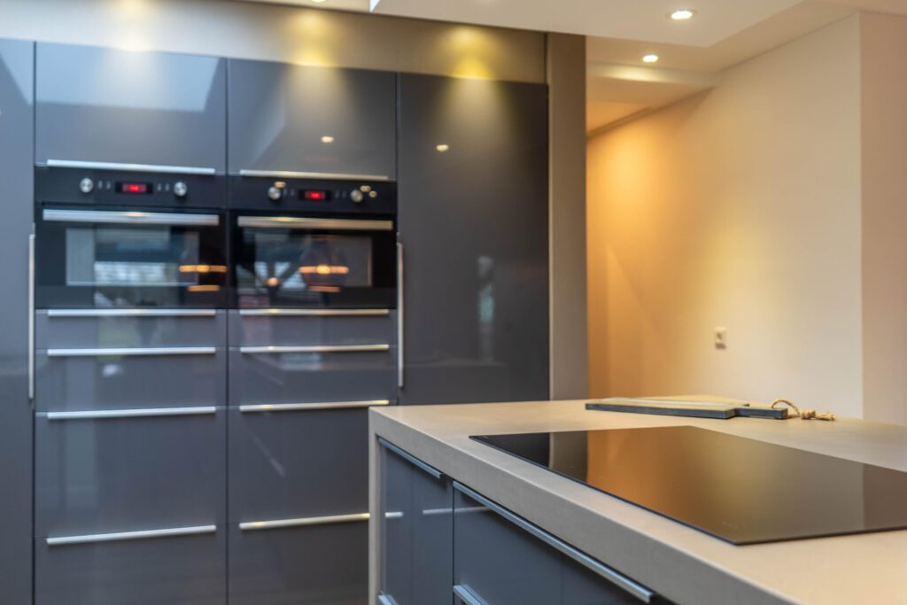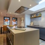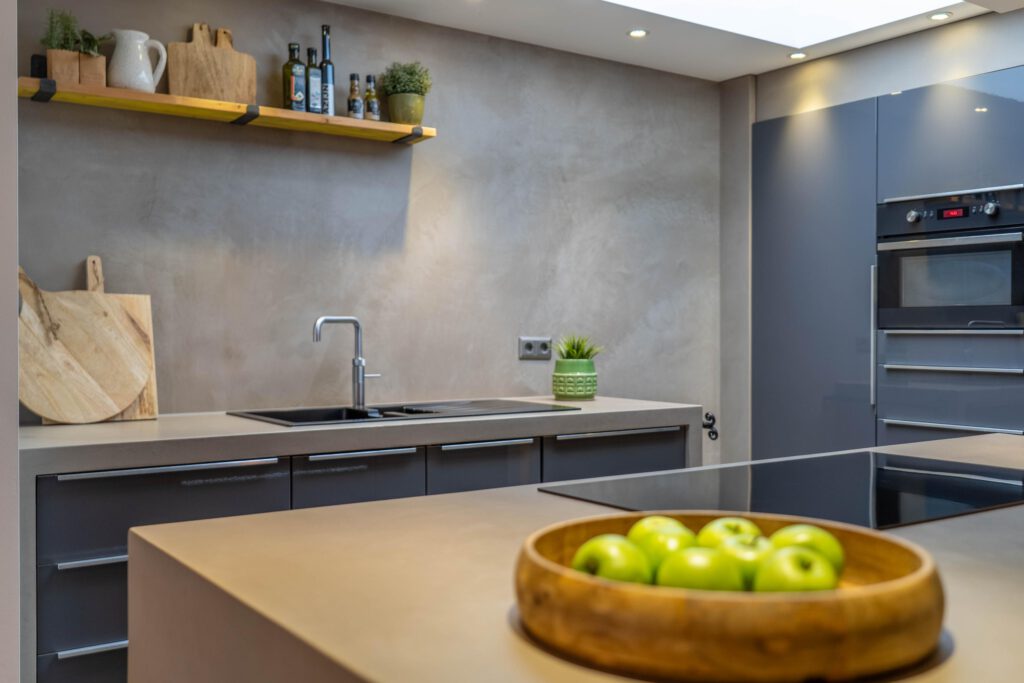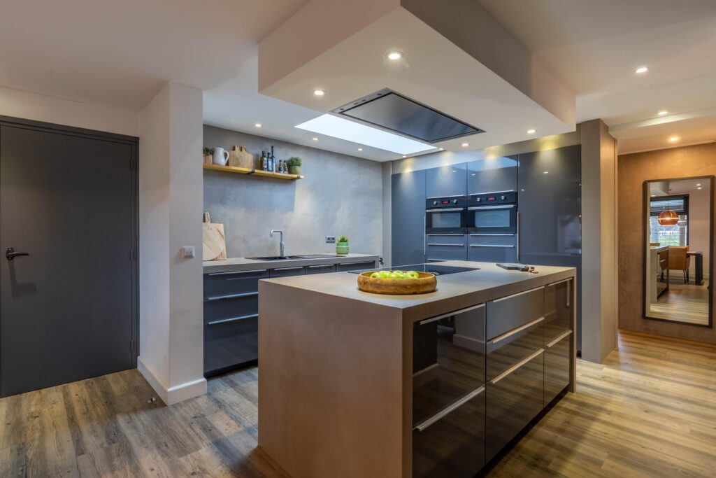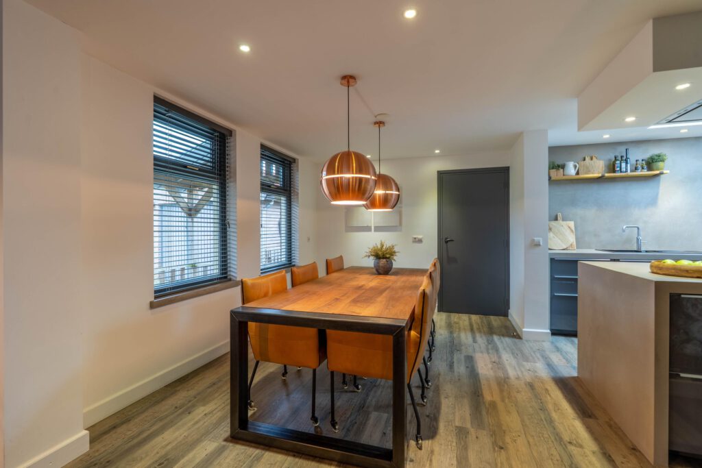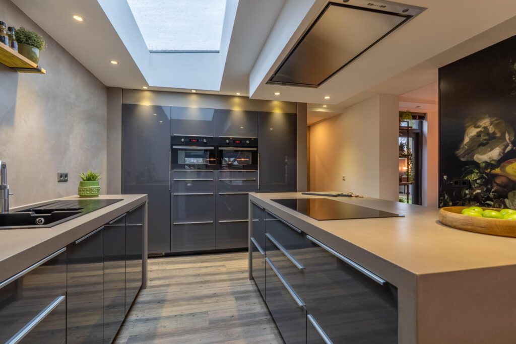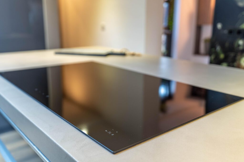 De begane grond is ruim en praktisch ingedeeld. De woonkamer en keuken vormen samen een open leefruimte, die gedeeltelijk wordt gescheiden door een sfeervolle pellet kachel verwerkt in een scheidingswand. De open keuken is uitgerust met een groot kookeiland, een los keukenblok en een grote kastenwand met inbouwapparatuur. Het eiland beschikt over een kookplaat, waarbij de afzuiging strak in het plafond is verwerkt. Er is meer dan voldoende kastruimte en tijdens het koken sta je in direct contact met de eetkamer.