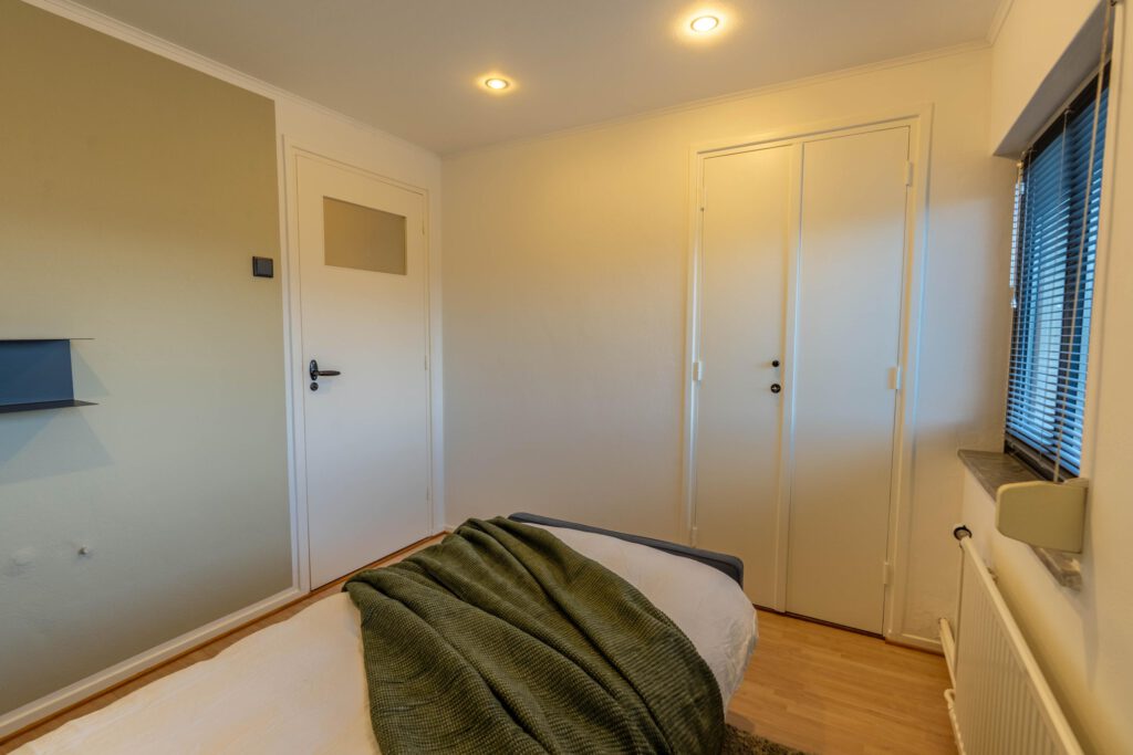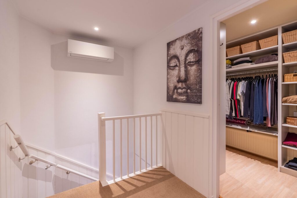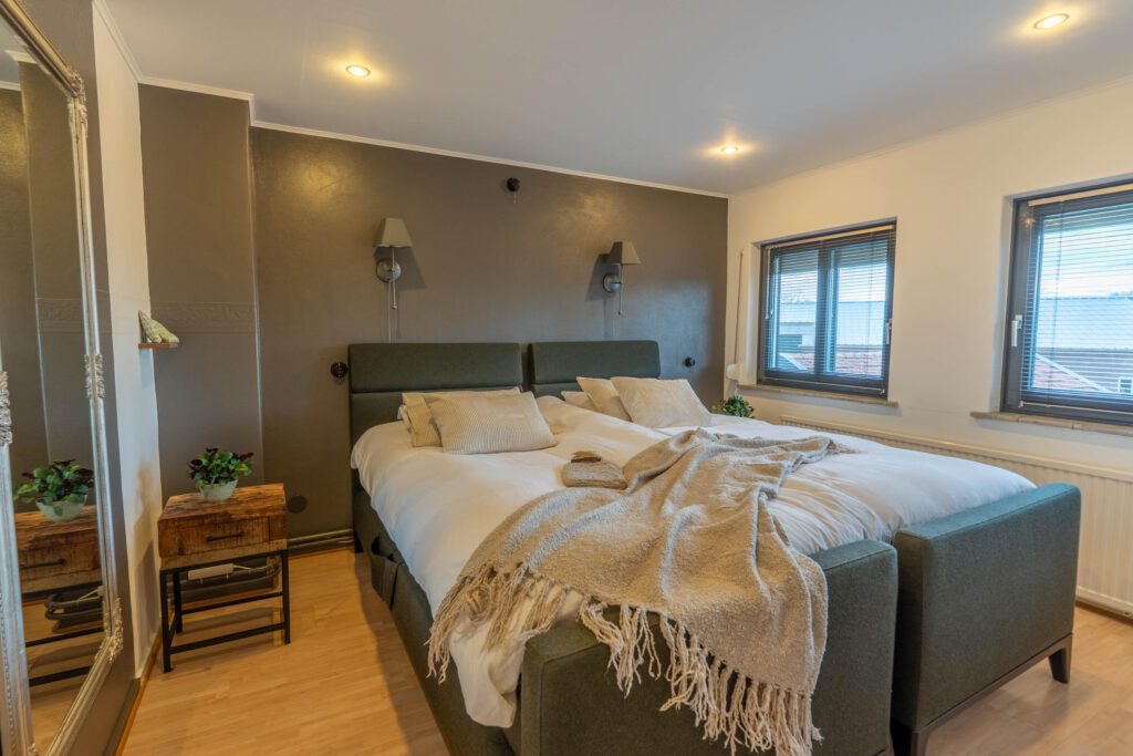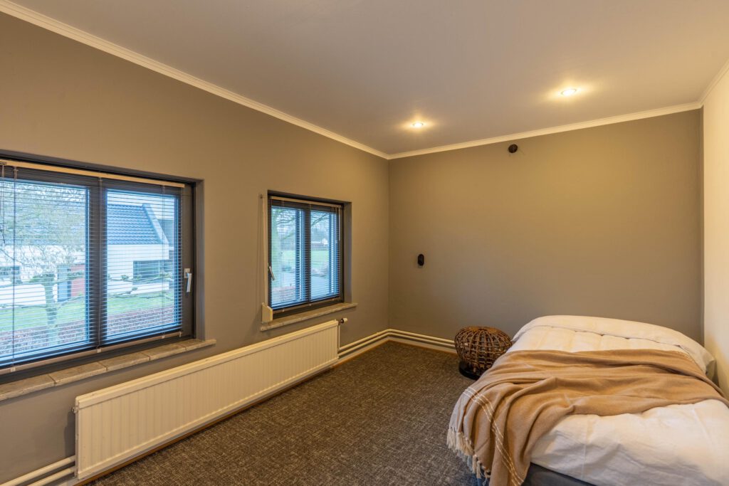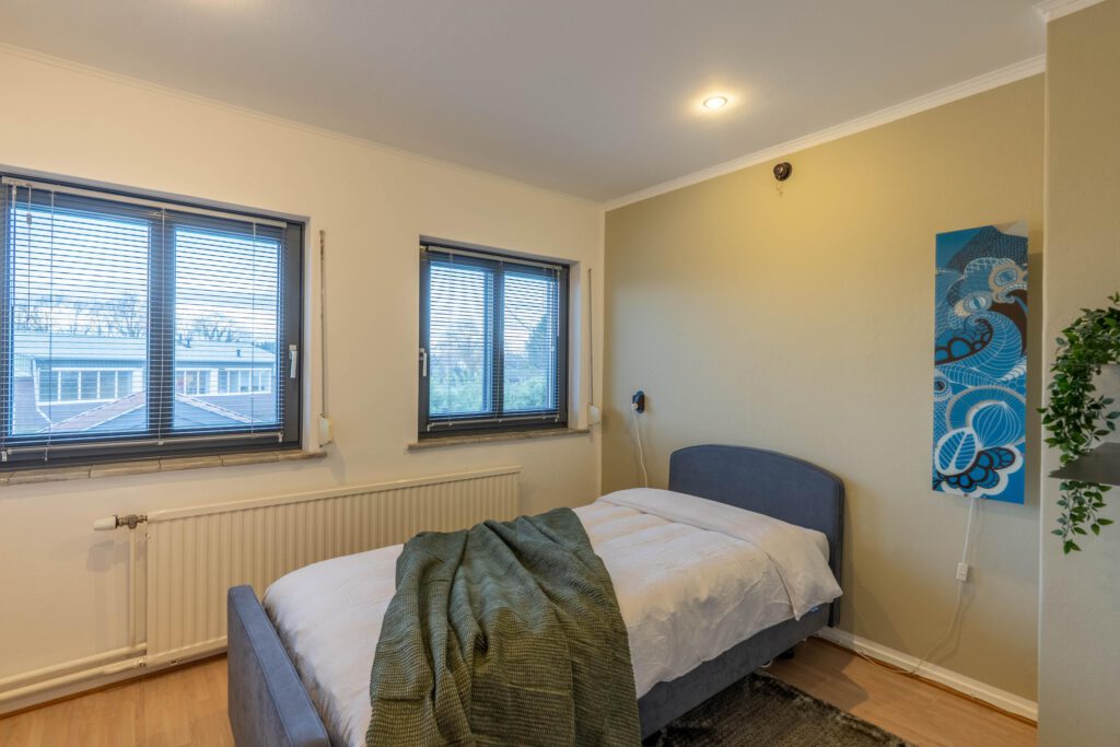 Op de eerste verdieping bevinden zich drie slaapkamers. Alle slaapkamers zijn ruim genoeg voor een tweepersoonsbed en twee kamers beschikken over een ingebouwde kast. Via de overloop is er toegang tot een inloopkast. Boven de trap hangt een airco die zorgt voor verkoeling tijdens warme zomerdagen. Voor extra bergruimte is er tevens een vliering aanwezig.