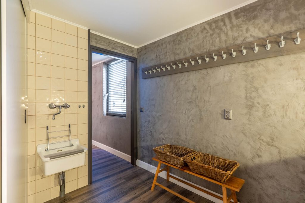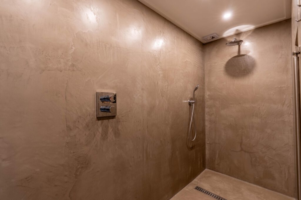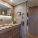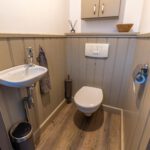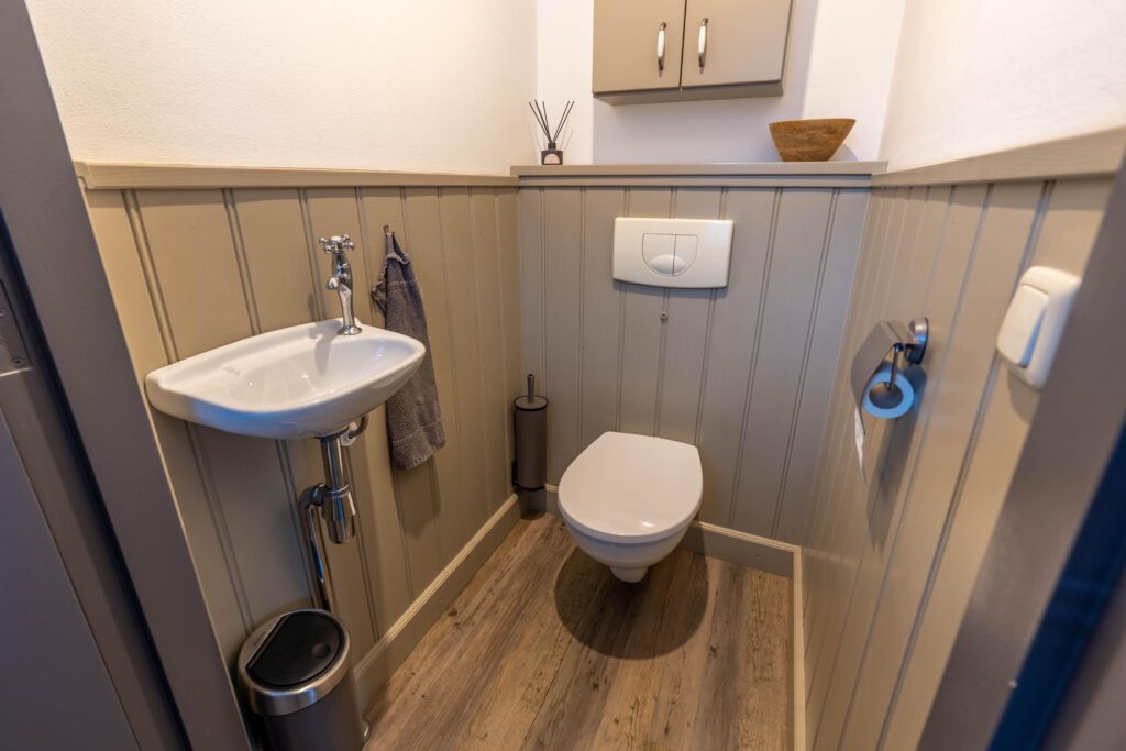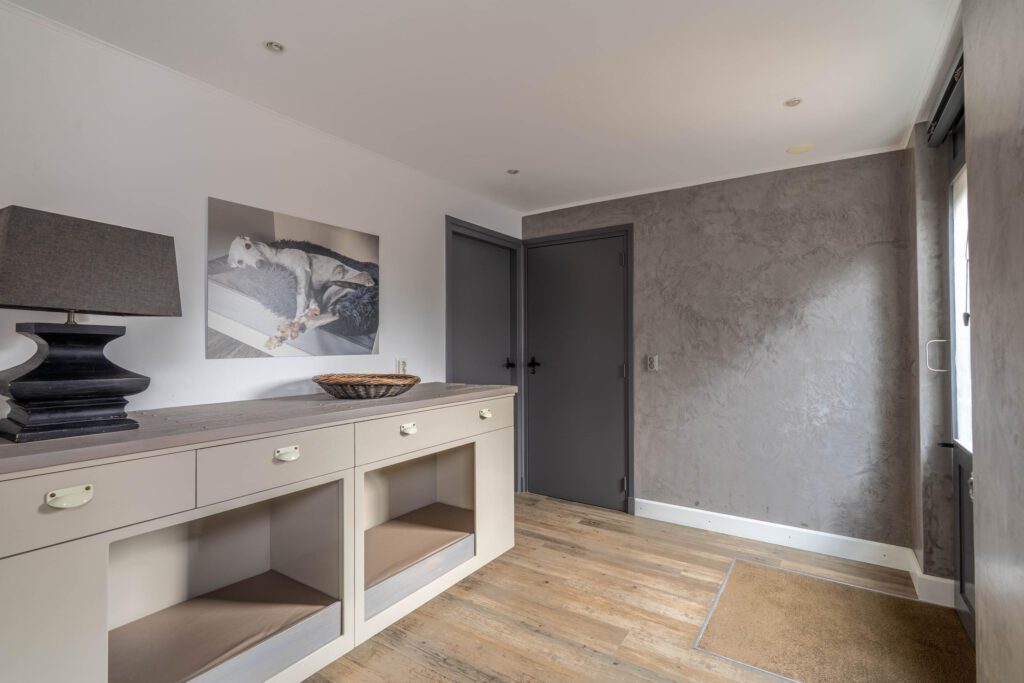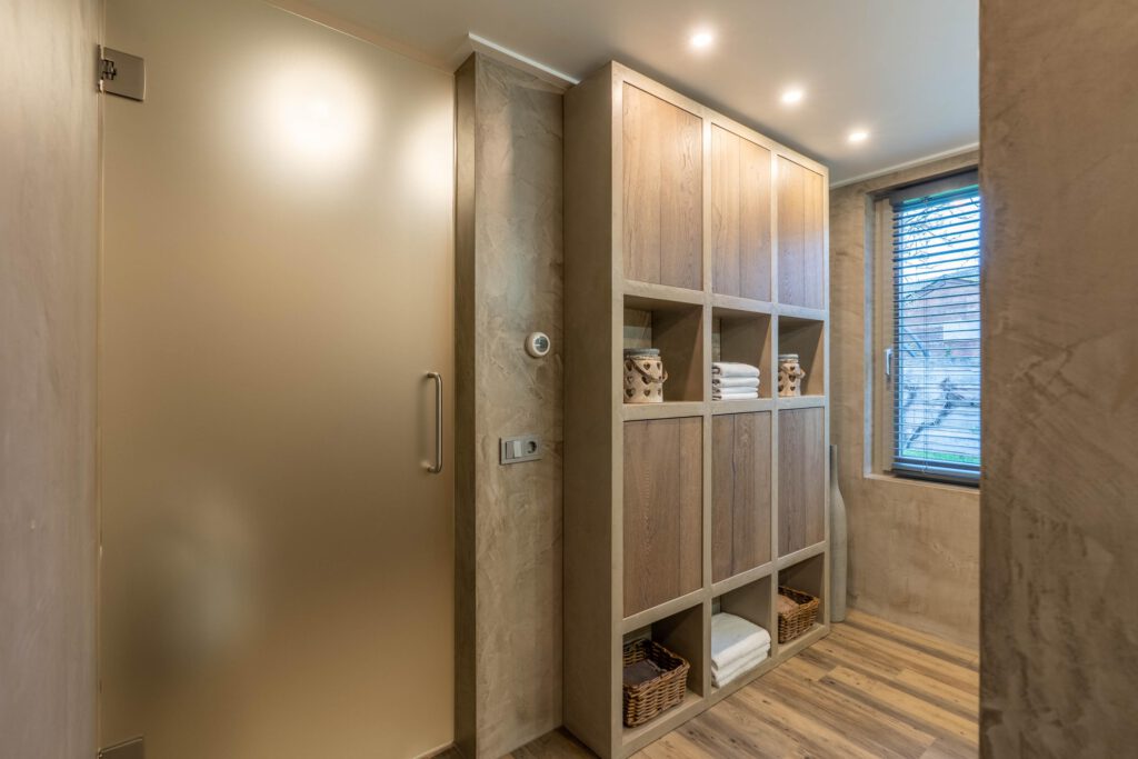 De ruime badkamer bevindt zich op de begane grond. Deze is voorzien van een royale inloopdouche met regendouche, een wastafel verwerkt in het badkamermeubel en een praktische kastenwand voor handdoeken en toiletartikelen.