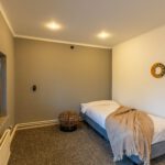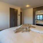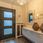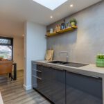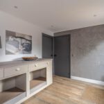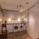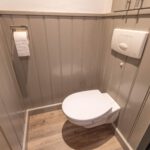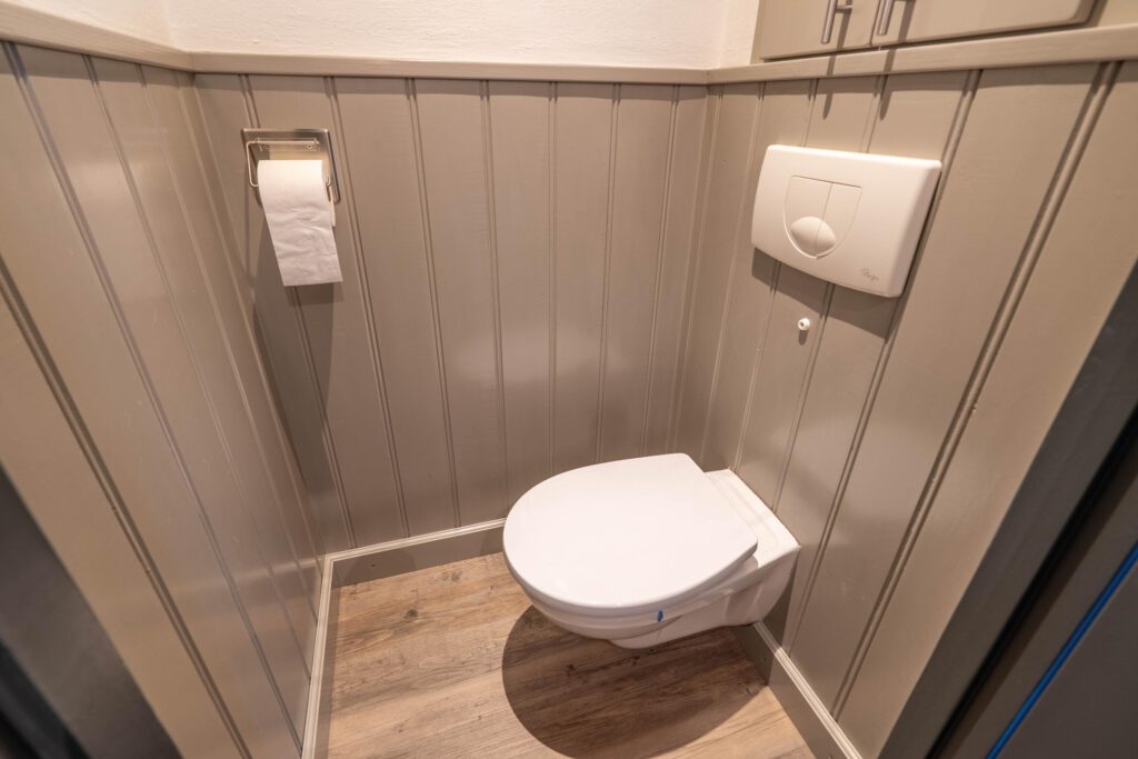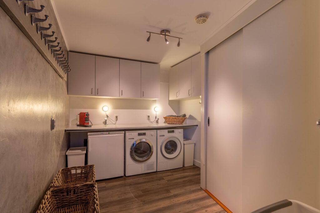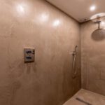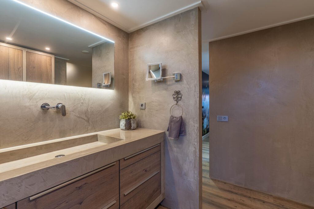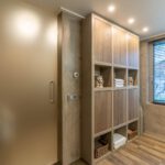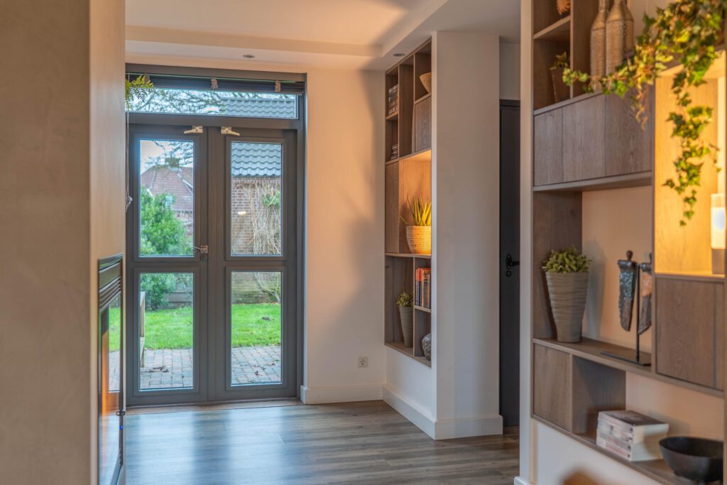 De ruime badkamer bevindt zich op de begane grond. Deze is voorzien van een royale inloopdouche met regendouche, een wastafel verwerkt in het badkamermeubel en een praktische kastenwand voor handdoeken en toiletartikelen.