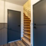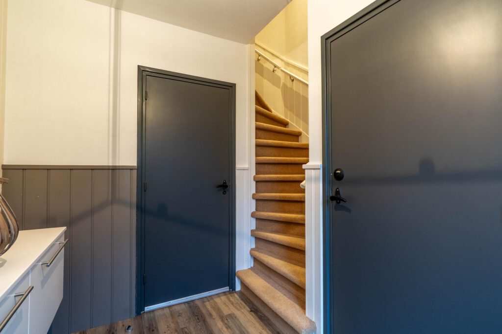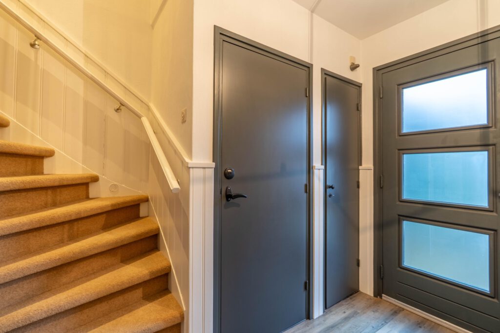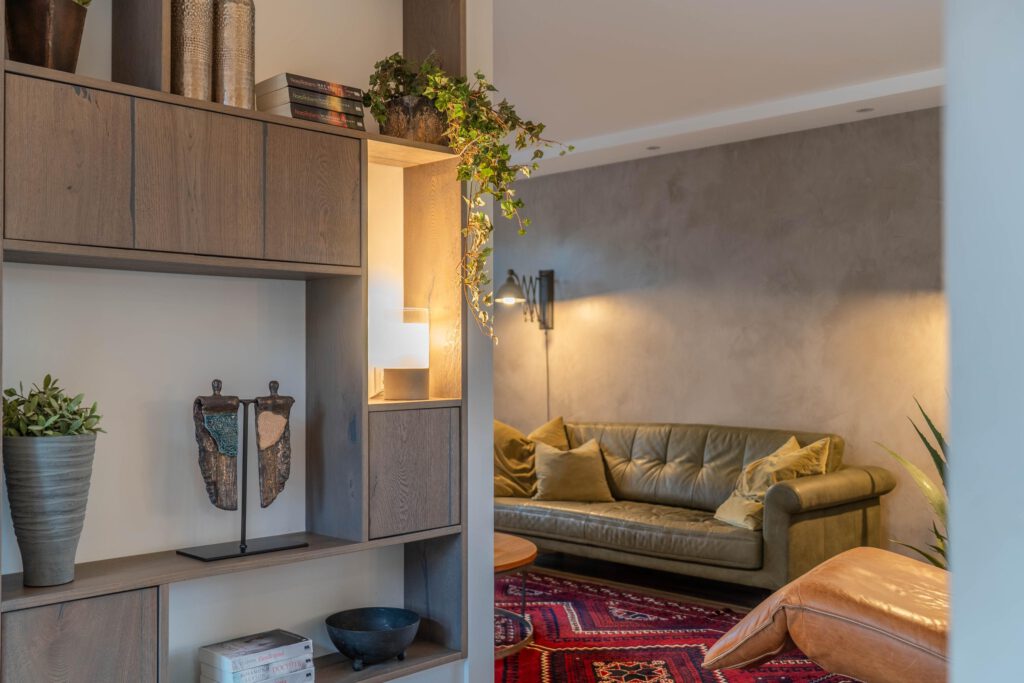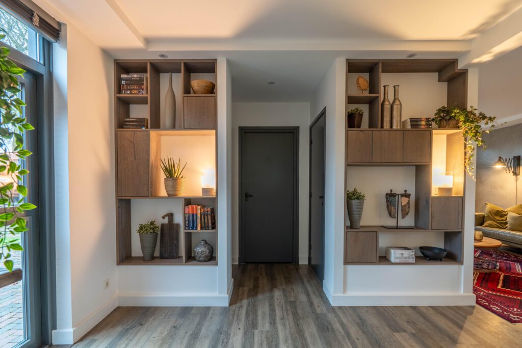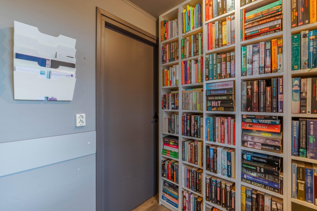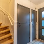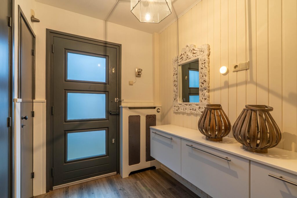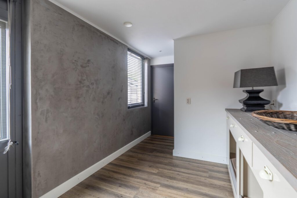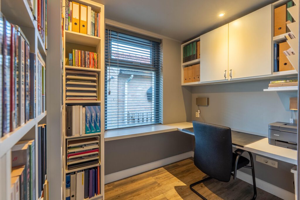 De woonkamer ligt aan de voorzijde van de woning en biedt uitzicht op de rustige straat. Daarnaast beschikt de begane grond over een handige kelder, een opbergkast en een aparte werkplek. Via de achterzijde is er een extra hal met entree, hier bevindt zich ook een toilet. Aangrenzend ligt de bijkeuken met witgoedaansluitingen en de cv-opstelling. De voordeur aan de voorzijde zorgt voor een sfeervolle binnenkomst; de lambrisering geeft de hal een karakteristieke uitstraling. Vanuit hier bereik je eveneens het toilet, de meterkast en de trap naar de eerste verdieping.