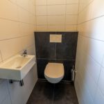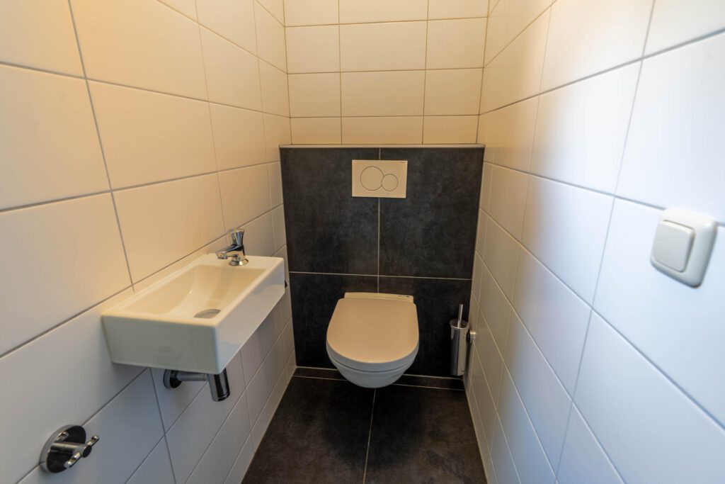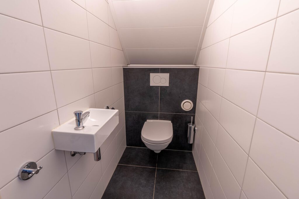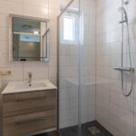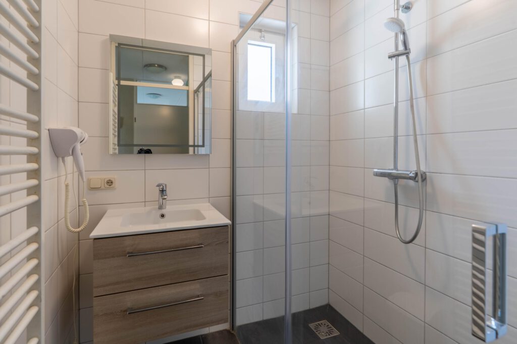 Via de centrale gang heb je toegang tot het toilet en de moderne badkamer, voorzien van een