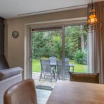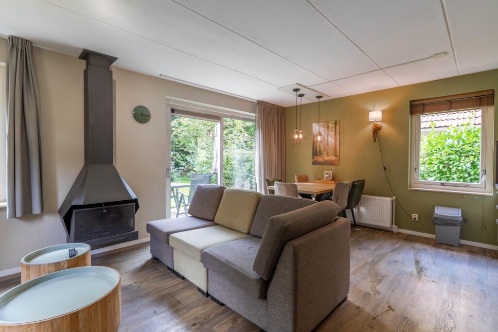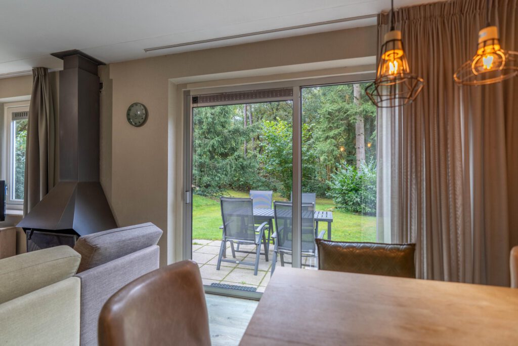 de eettafel uit op het groen. De haard zorgt voor extra sfeer en warmte tijdens gezellige avonden.