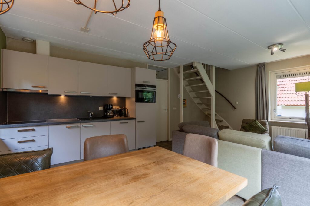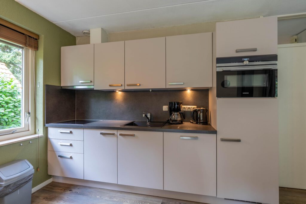 is compleet ingericht met een kookplaat, vaatwasser, koelkast en oven. Via de schuifpui kijk je vanaf
