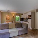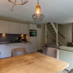 De woonkamer en keuken vormen één geheel, waardoor het licht en ruimtelijk aanvoelt. De keuken