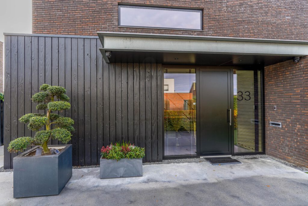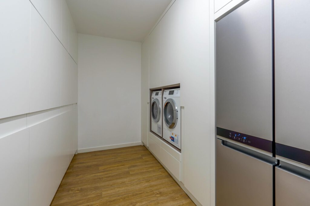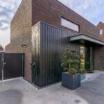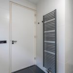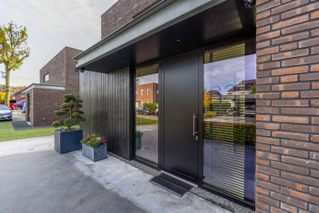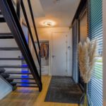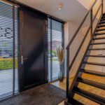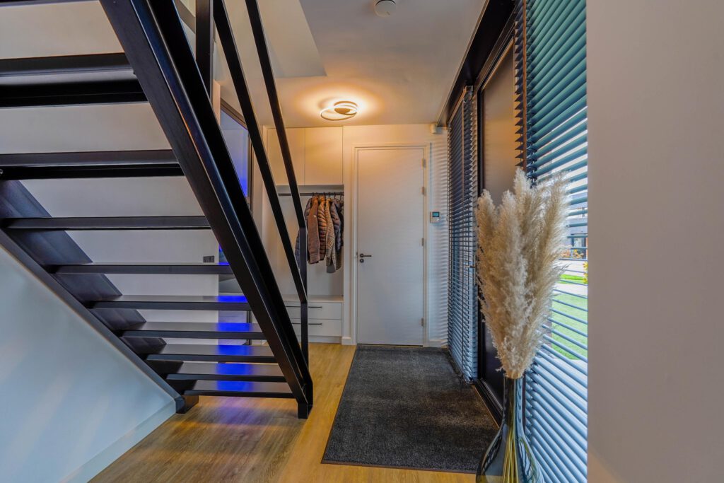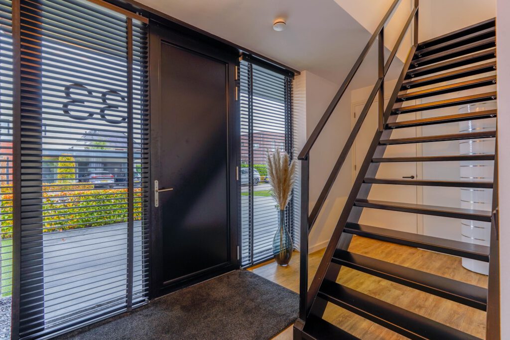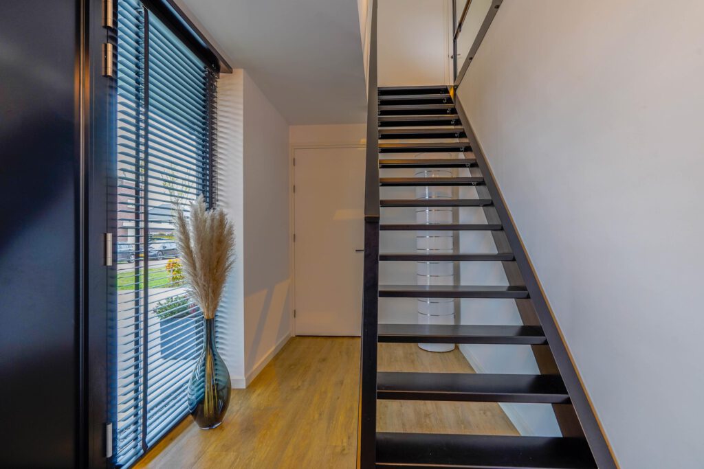 Bij binnenkomst valt direct de prachtige zwarte stalen trap op, die samen met de stalen deur naar de woonkamer een moderne en krachtige uitstraling geeft. Vanuit de hal is er toegang tot de wasruimte/berging, voorzien van hoogwaardige inbouwkasten en aansluitingen voor witgoed – alles strak weggewerkt.