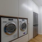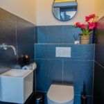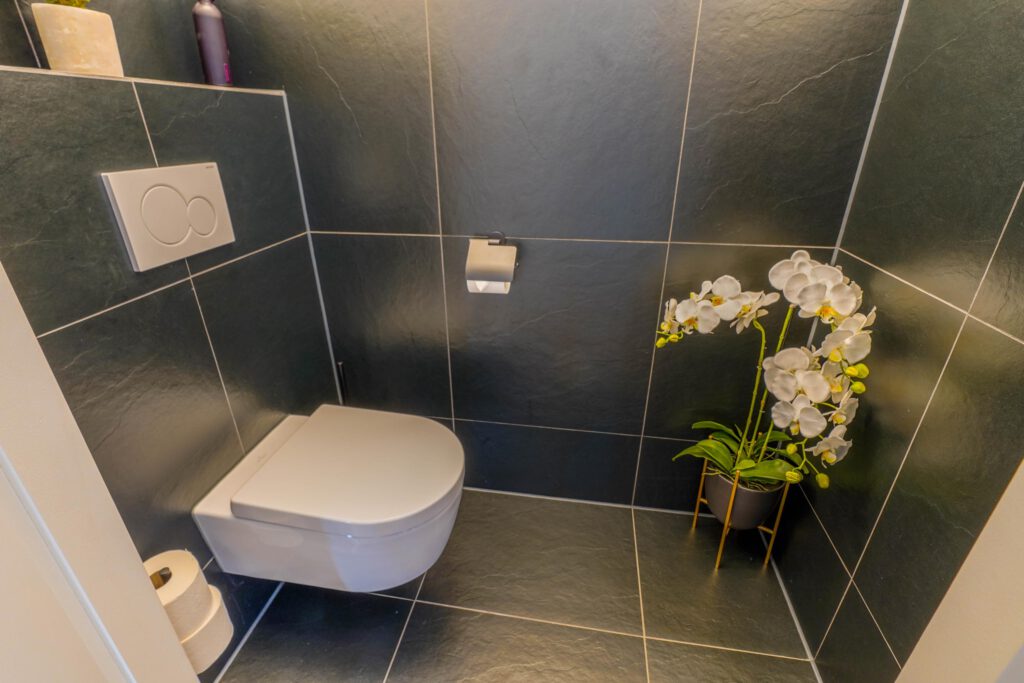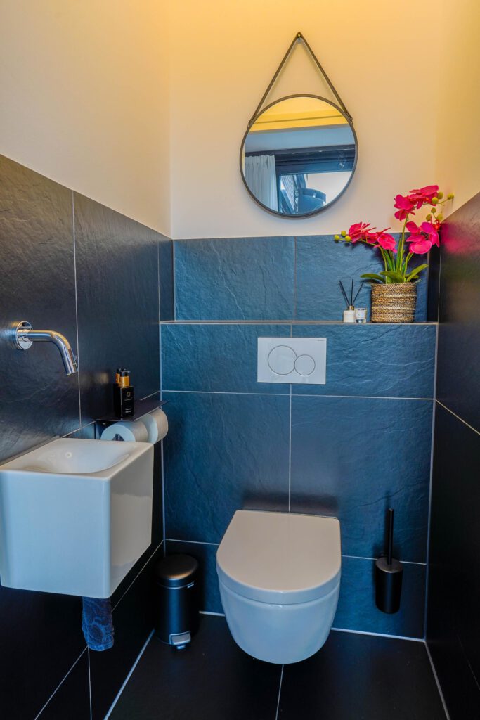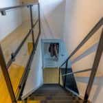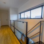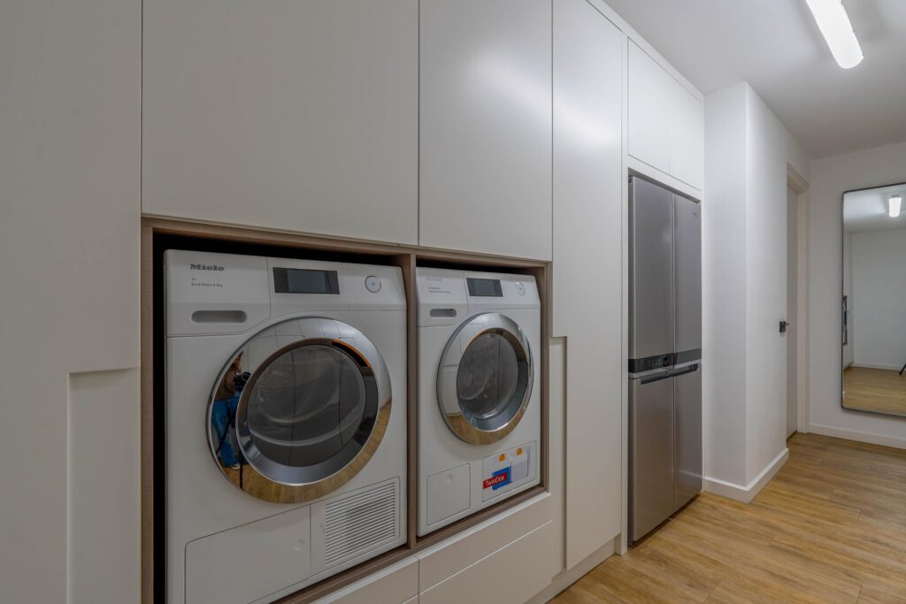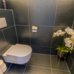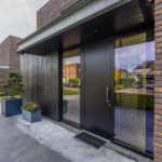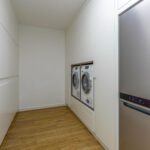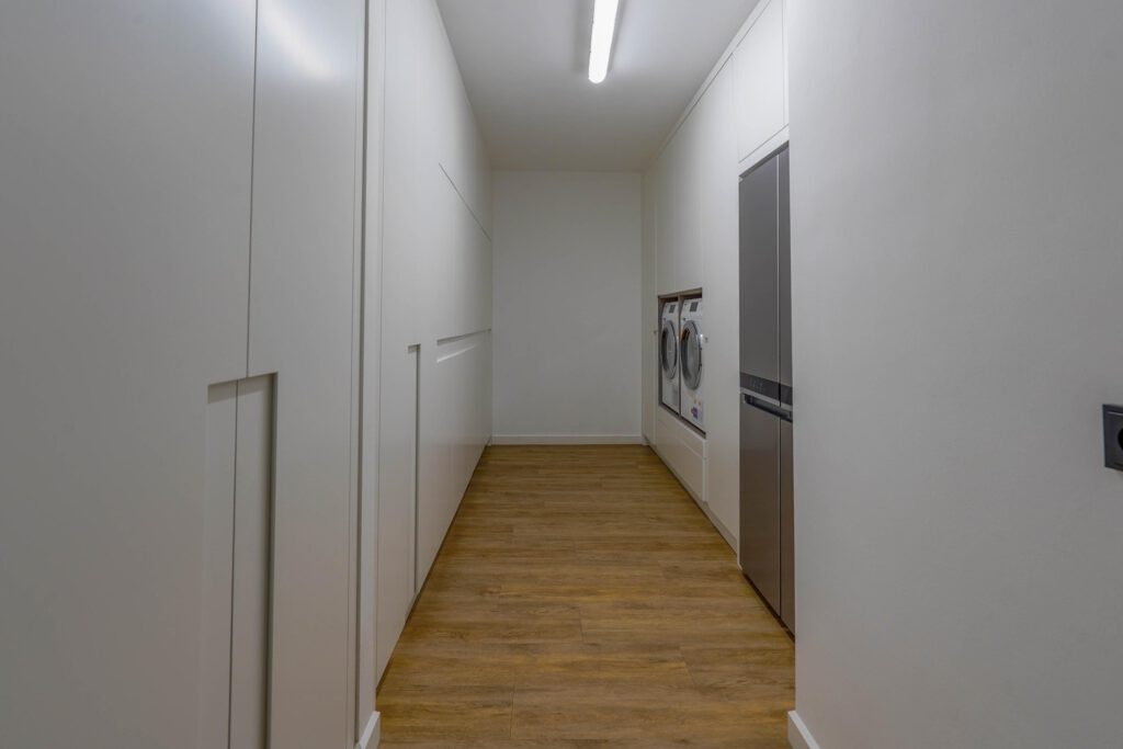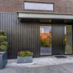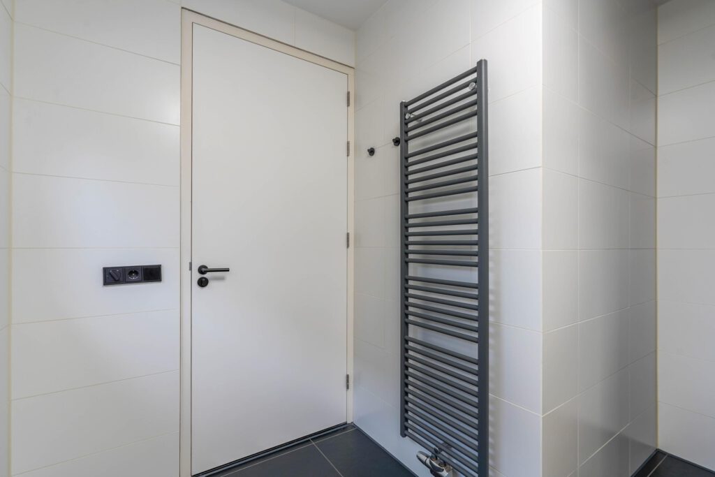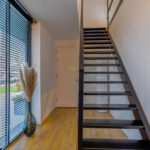 Bij binnenkomst valt direct de prachtige zwarte stalen trap op, die samen met de stalen deur naar de woonkamer een moderne en krachtige uitstraling geeft. Vanuit de hal is er toegang tot de wasruimte/berging, voorzien van hoogwaardige inbouwkasten en aansluitingen voor witgoed – alles strak weggewerkt.