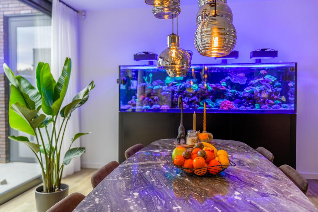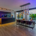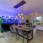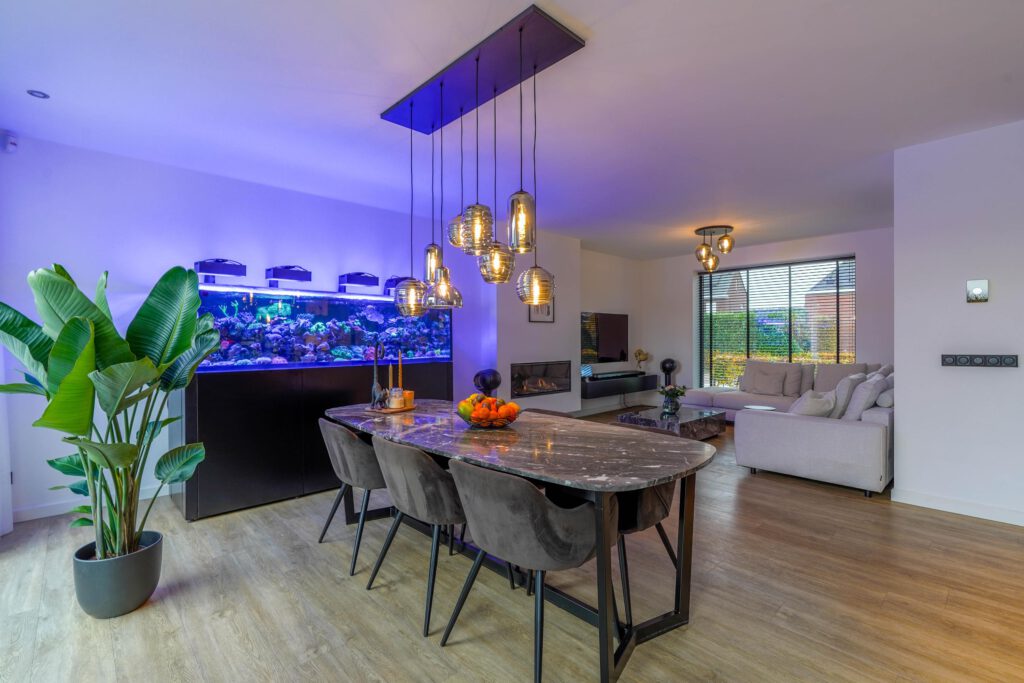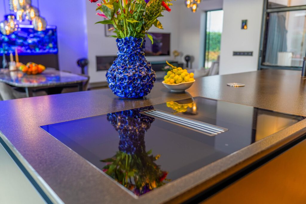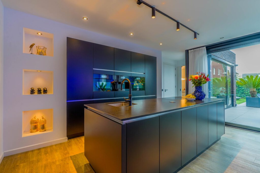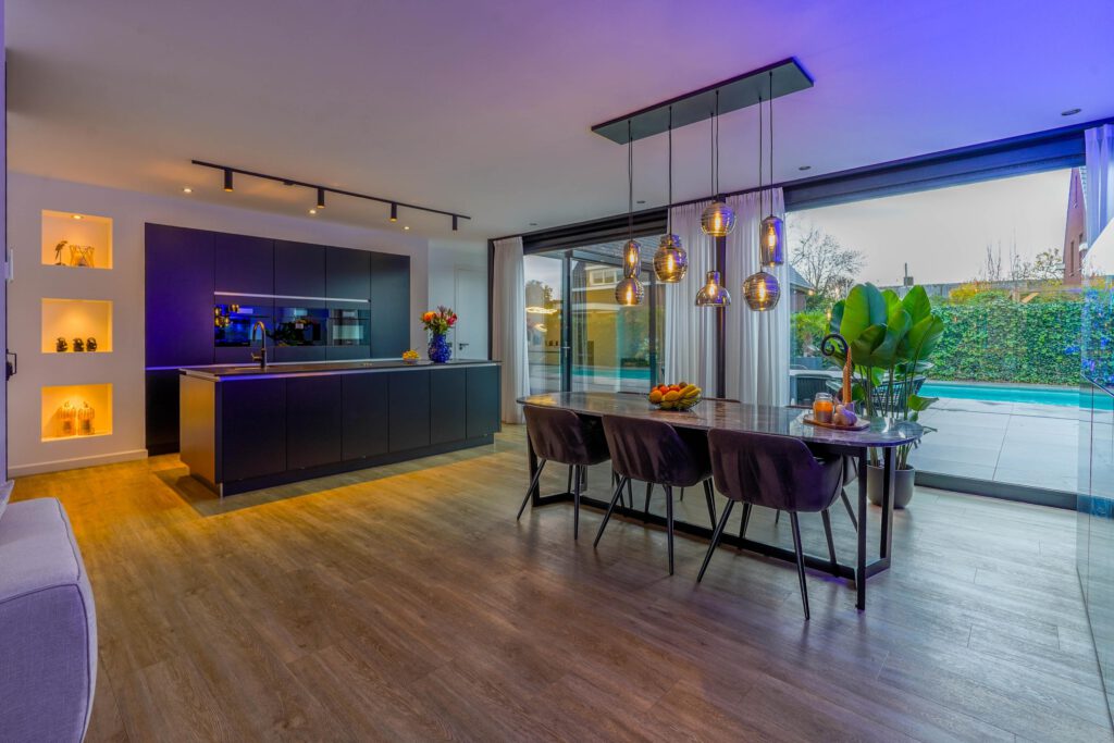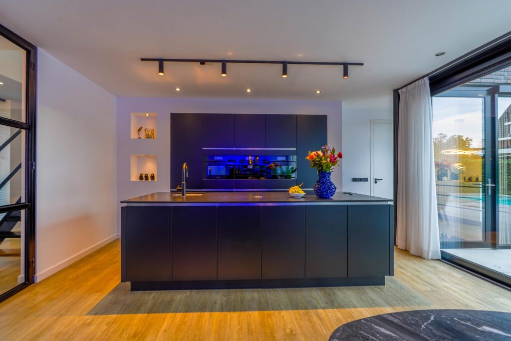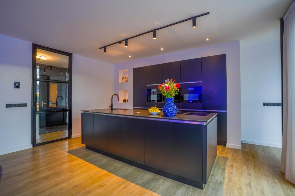 De royale leefruimte bestaat uit één open geheel met keuken, eetgedeelte en woonkamer.